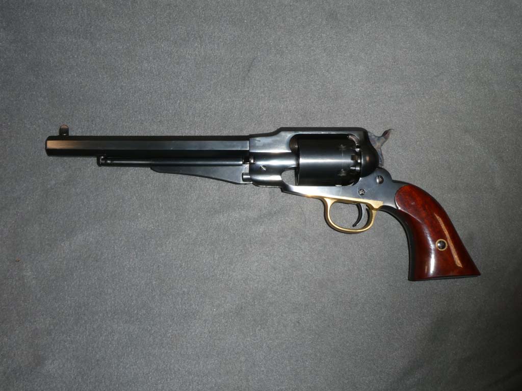 This is a replica of the Remington 1858 New Model Army Revolver manufactured by Uberti in 2016. It is a single-action, percussion revolver with an 8"-barrel. The Remington was the 2nd most carried revolver of the Civil War. With its solid frame and back strap, it was also the strongest, and many thought the Remington to be superior to the Colt. This revolver is in very fine condition with its original box and paperwork. It retains about 98% of its factory blued finish. There is a small area on the right side of the frame with a few small dings and some finish wear. It is on the right side of the rammer channel. There is a drag line on the cylinder and a tiny scratch here and there. The bore and chambers are excellent. Mechanically, it feels like the revolver has had the action tuned. The gun cocks smoothly and the trigger is light and crisp. The grips are very fine with a bit of scuffing of the high gloss finish. The box is in good condition with one broken corner and some scuffing of the edges. The Remington is a great percussion revolver. Stock no. 30941