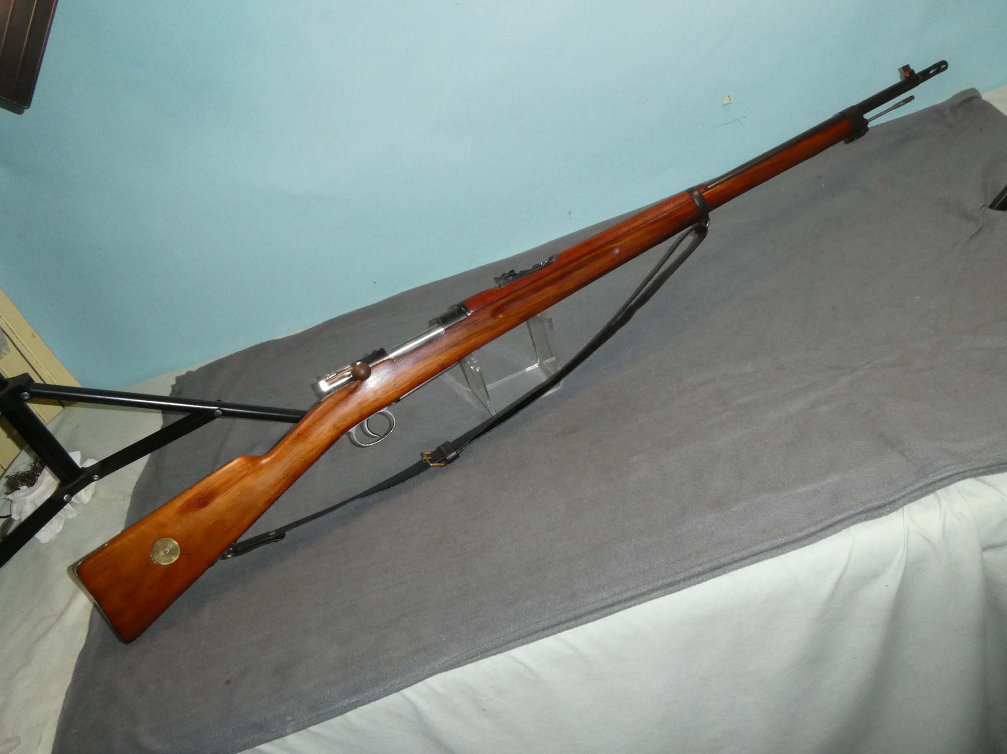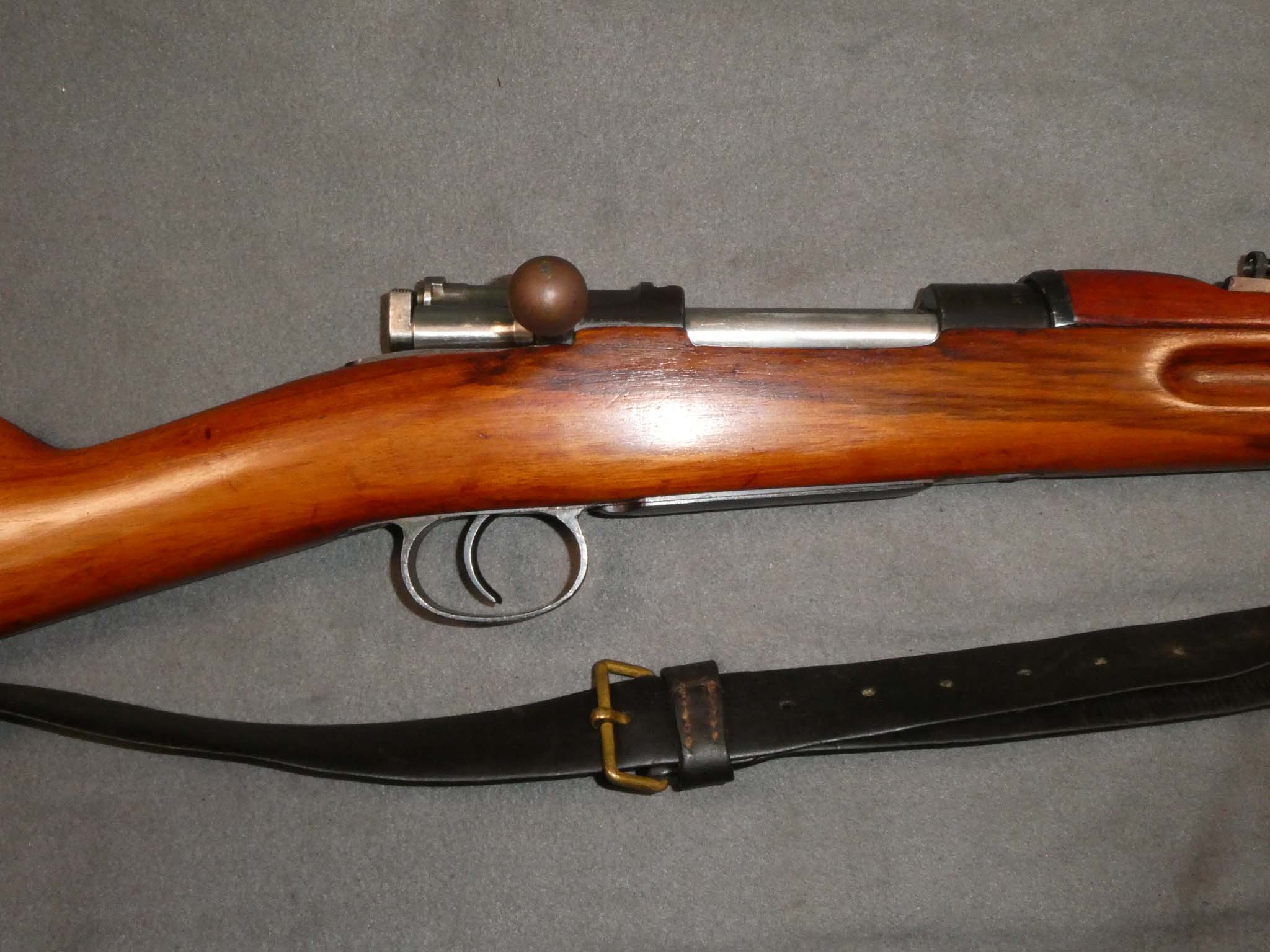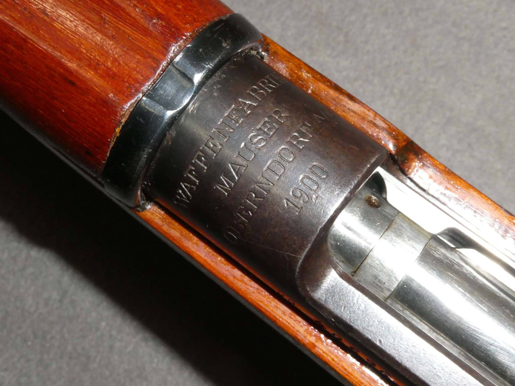 This is a Swedish Model 1896 Mauser Infantry Rifle manufactured by Mauser Oberndorff in 1900 and chambered for the 6.5x55mm cartridge. Mauser made the initial production run of these rifles in 1899 and 1900, with only 38,600 made. Carl Gustaf took over production and manufactured them until about 1925. This rifle is in fine condition. It has all matching numbers except for the barrel bands. It retains more than 95% of its blued finish with some light wear on the barrel. The matching bolt is armory bright except for the bolt knob, which has developed a dark brown patina. The rifle has a very fine bore and excellent mechanics. The stock is in fine condition. It has been lightly sanded and given a clear coat. There are small importer marks on the barrel. The barrel has been fitted with the screw on muzzle brake and a rear target peep sight. The front sight blade is higher. This is a nice example of the Mauser made '96 Swedish Mauser. Stock no. 31291