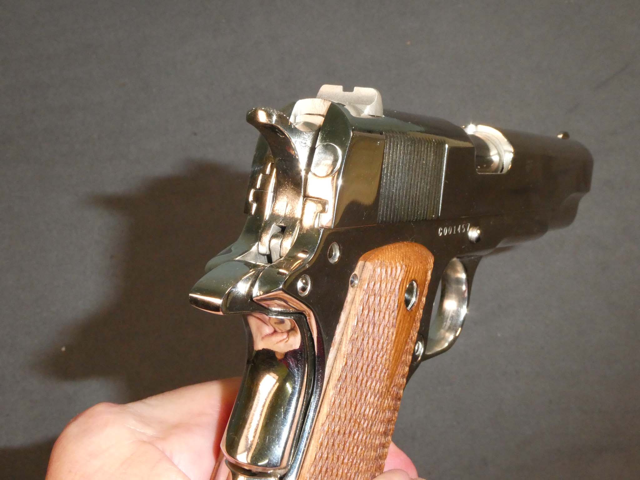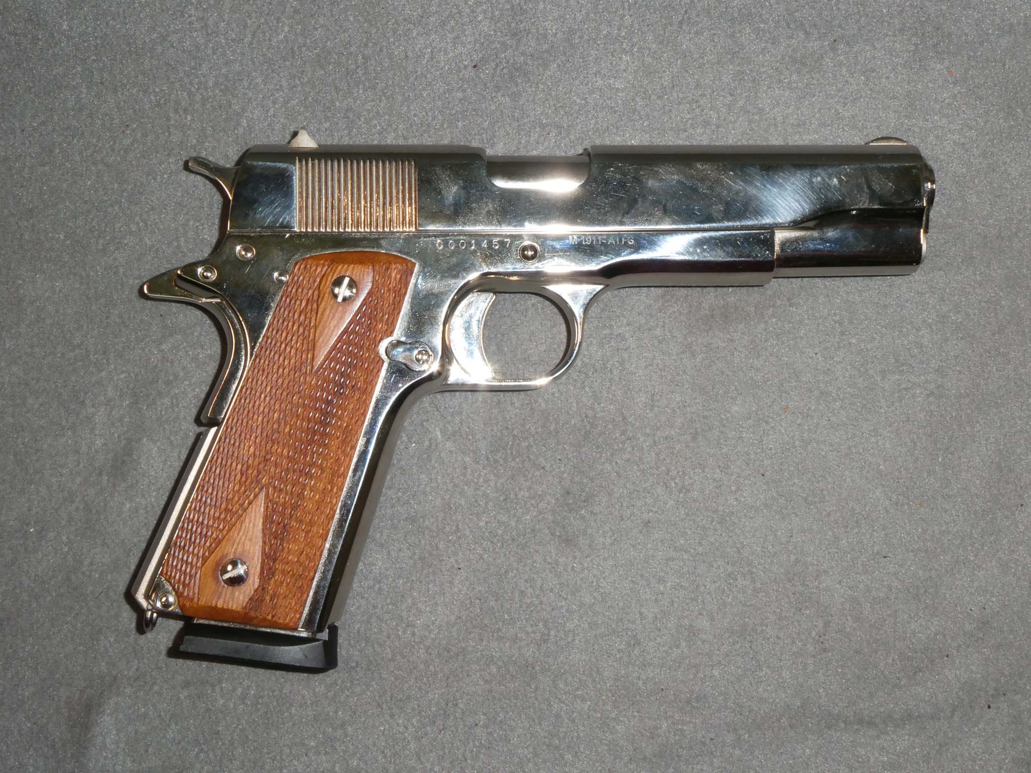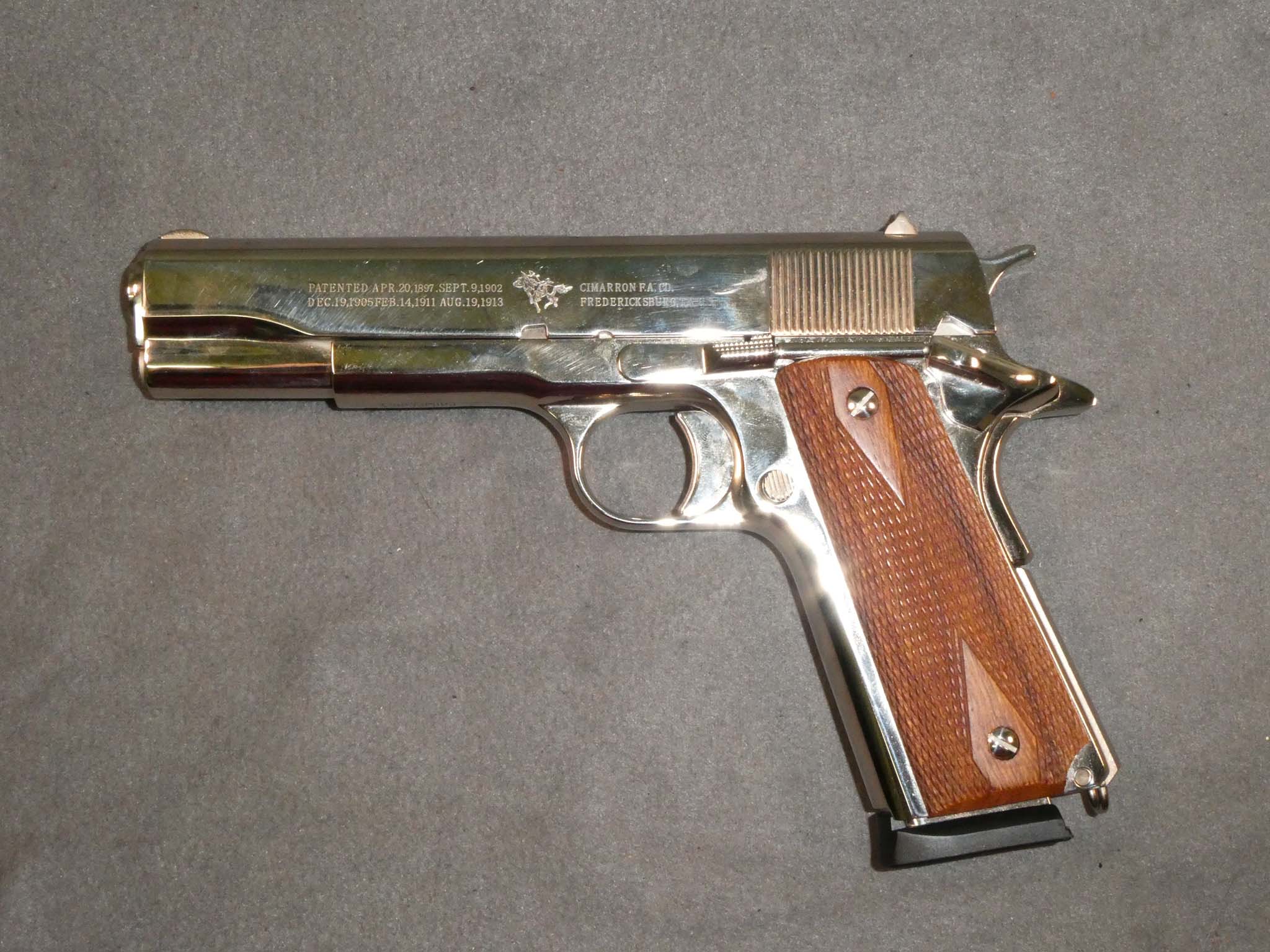 This is a copy of the Colt Model 1911 Government Model pistol imported and sold by Cimarron Arms of Fredericksburg, Texas. It is a nickel plated semi-automatic with a 5" barrel. It is chambered for the .45 ACP cartridge. It pretty closely replicates the earl Model 1911 style Government Model. It is in excellent condition with nearly 100% of its nickel remaining and just a tiny scratch or two from storage. The bore and mechanics are excellent. The gun does not look like it has been fired, but I am not 100% certain of that. If it has been fired, it cannot have been more than a couple of shots. The checkered wood grips are excellent. The magazine is by Act-Mag of Italy. This is a good-looking pistol in great condition. Stock no. 31261