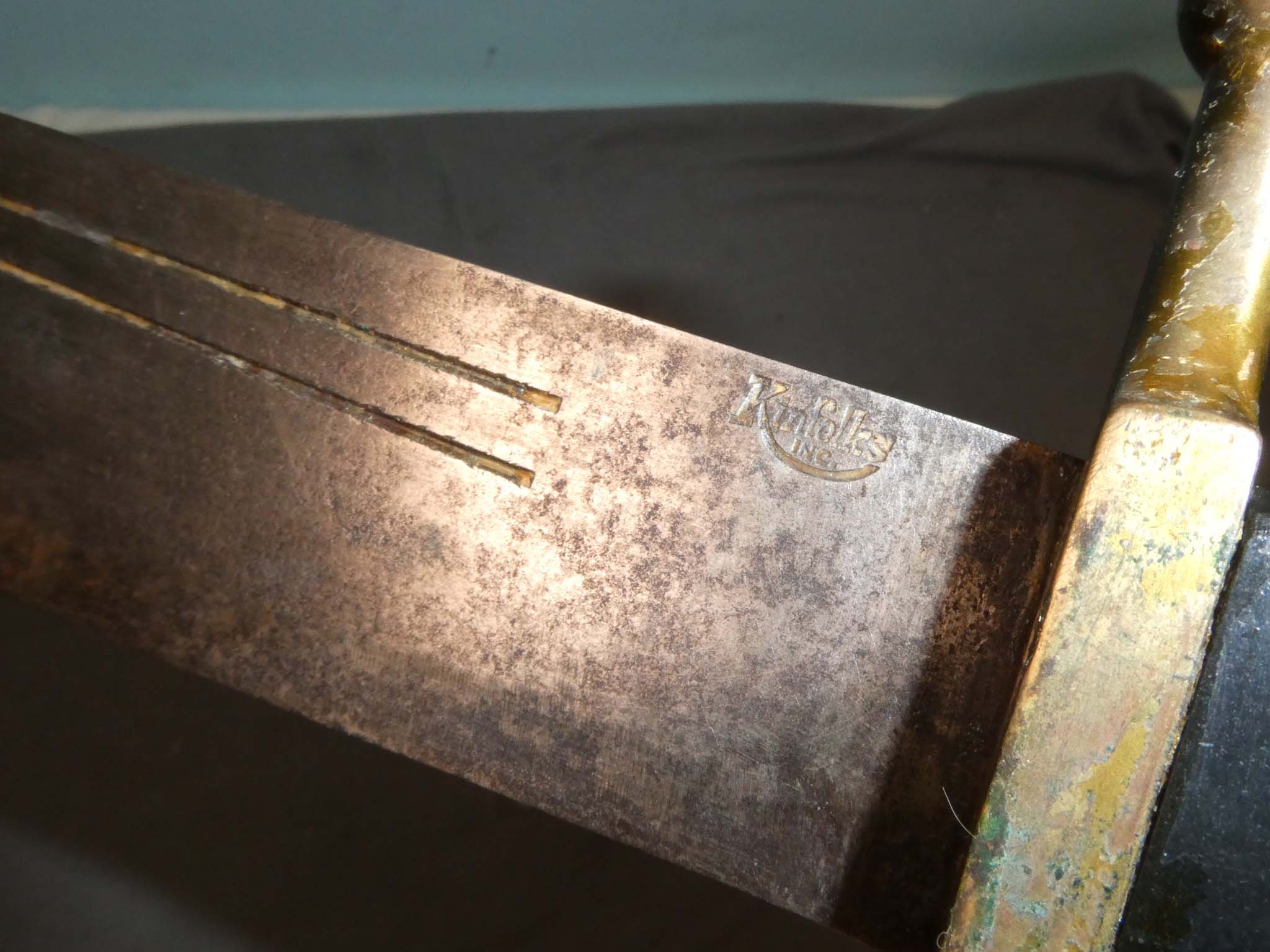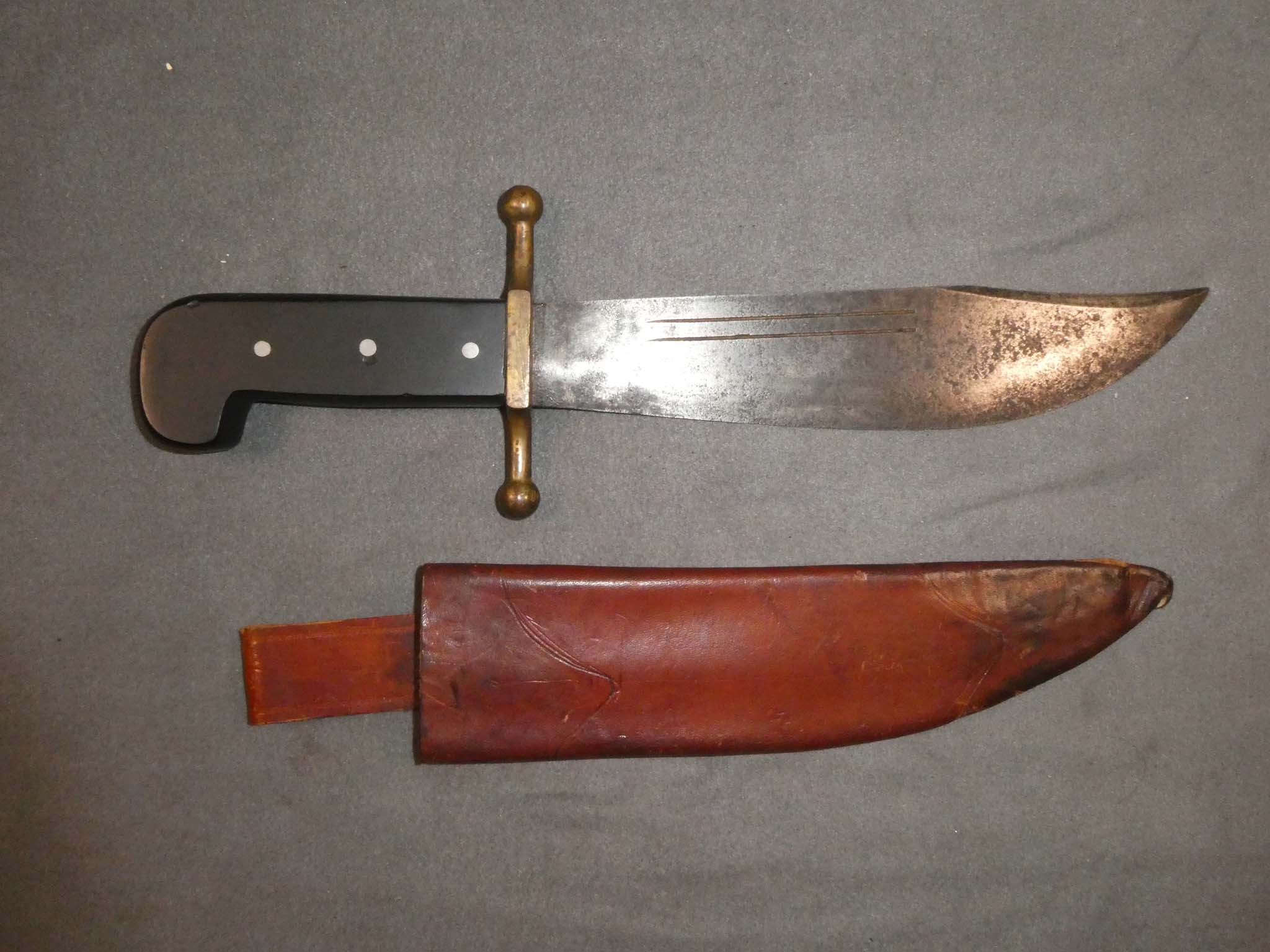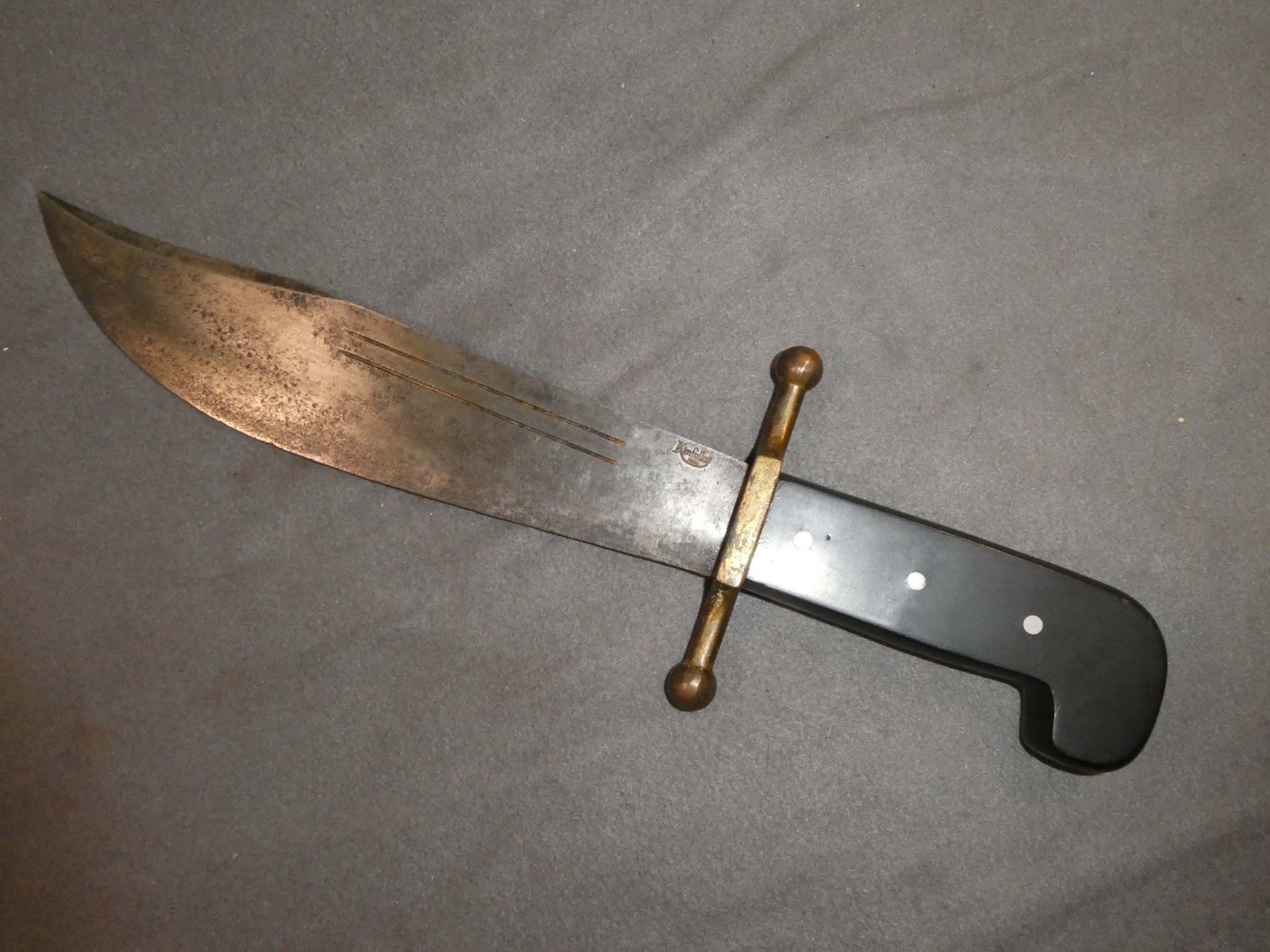 This is an original, WWII V-44 Survival Knife manufactured by Kinfolks. Originally made by Collins & Company as their No.18 Machete, the knife was adopted in 1934 as a survival knife for Air Force pilots in tropical areas. During the war, they were also made by Case, Kinfolks, and Western Cutlery. Serving primarily with pilots in the Pacific Theater, a small number were issued to the U.S. Marine Corps. They were used by the 2nd Marine Raider Battalion (Carlson's Raiders). The knife was replaced (in pilot's jungle bail out kits) in October of 1942 by a round tipped, folding machete. This knife is in very good condition. It is 14-3/16 inches overall with a 9-3/16-inch blade. The blade has a steel patina with a heavy sprinkling of dark brown spotting. The blade exhibits fine pitting over much of its surface. The brass guard has a nice dark bronze patina. The black Bakelite handle is very fine with a few small dings from use. The left side of the blade is marked with the Kinfolks logo. The leather scabbard is very good to fine with some darkening near the tip. One of the rivets attaching the belt loop has pulled out of the scabbard body and there are some small scuffs and scratches on the leather. The Kinfolks V-44 is the second rarest variation of this WWII knife. Stock no. 30505