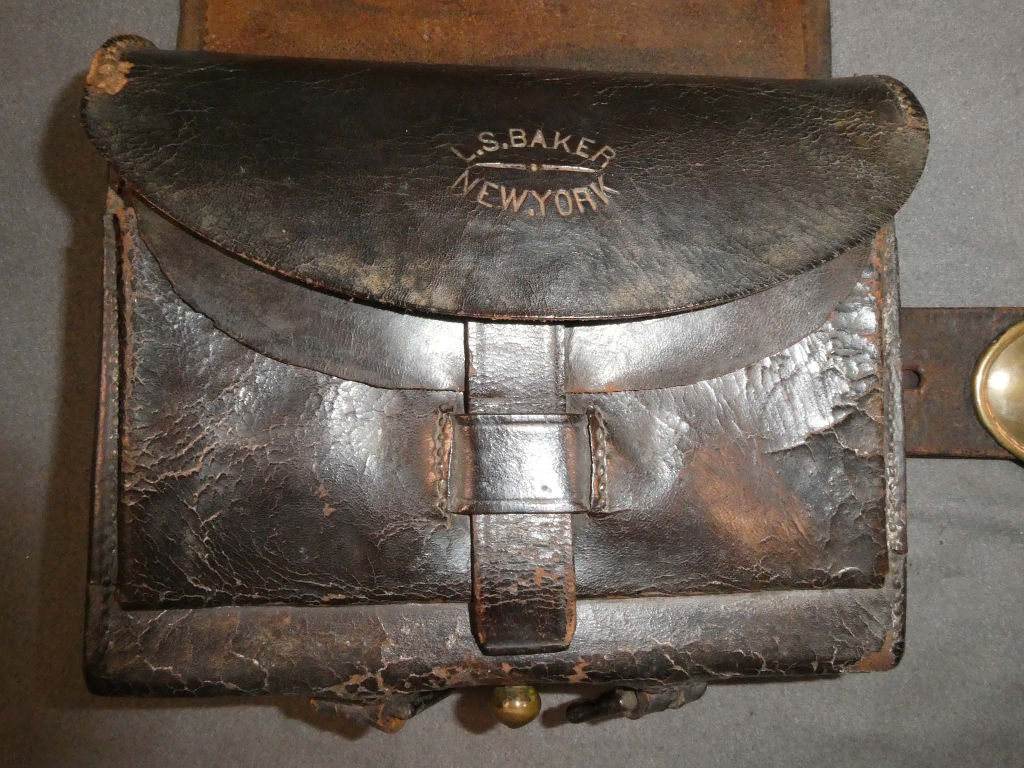 This is an original, Civil War Cartridge Box made by L.S. Baker of New York. This is an early to mid-war box made for the .58 caliber rifle musket. It is complete with both of the cartridge tins. This box would have held 40 paper cartridges. The box also has its original lead filled cartridge box plate on the flap. This was used to hold the flap down when the closure strap was unfastened during combat. This box is set up to be worn on the waist belt instead of with the shoulder strap. An original waist belt is included with its original lead filled "US" belt plate. There is also an original cap pouch made in Philadelphia, Pa. This set is in very good condition. The cartridge box is complete with tight stitching. The fastening strap on the flap has a tear on one side. The leather remains supple with some crazing and cracking of the black surface. There is a very small amount of flaking. The strap buckles retain about 50% of their black japanned finish. The belt remains flexible with some surface flaking but may not be a military belt. The cap pouch is in fine condition with tight stitching and flexible leather. The sheep's wool used to keep the caps from falling out of the pouch has long since disappeared. There is a maker's mark on the inner flap that I can't quite make out. Both plates are very fine with nice smooth bronze patina. There is some scratched doodling on the back of the belt plate. This is a good-looking set of Union accoutrements. Stock no. 31528