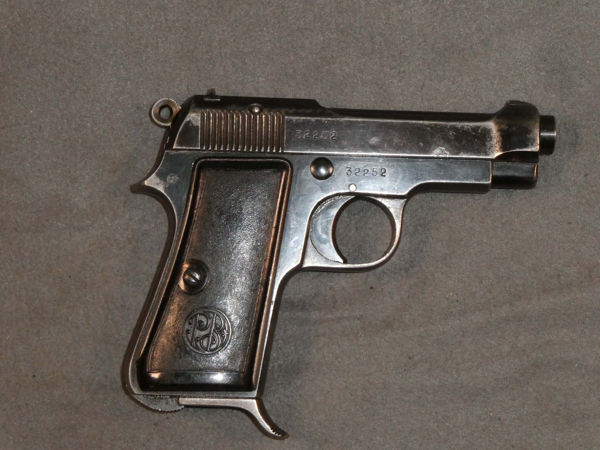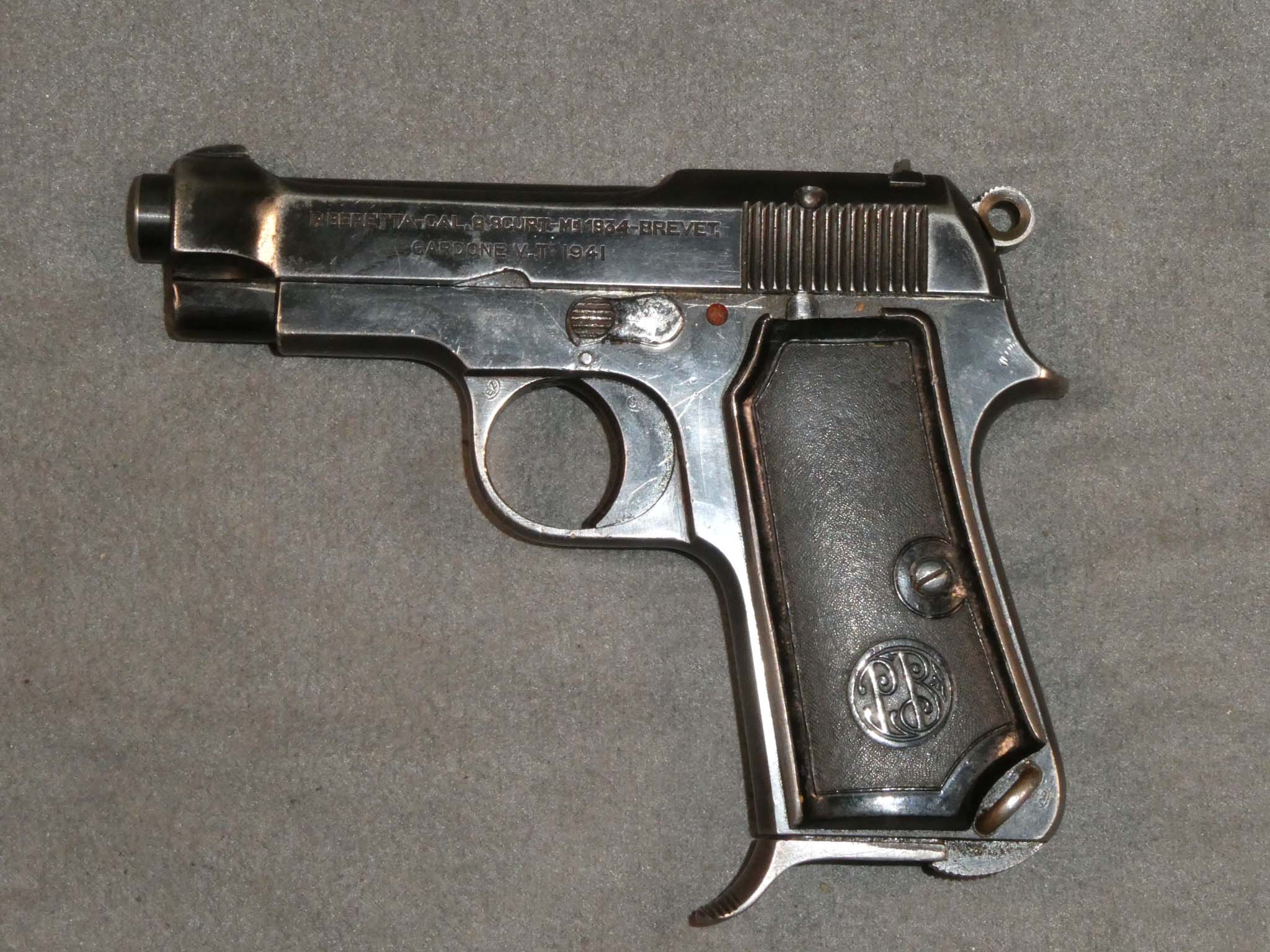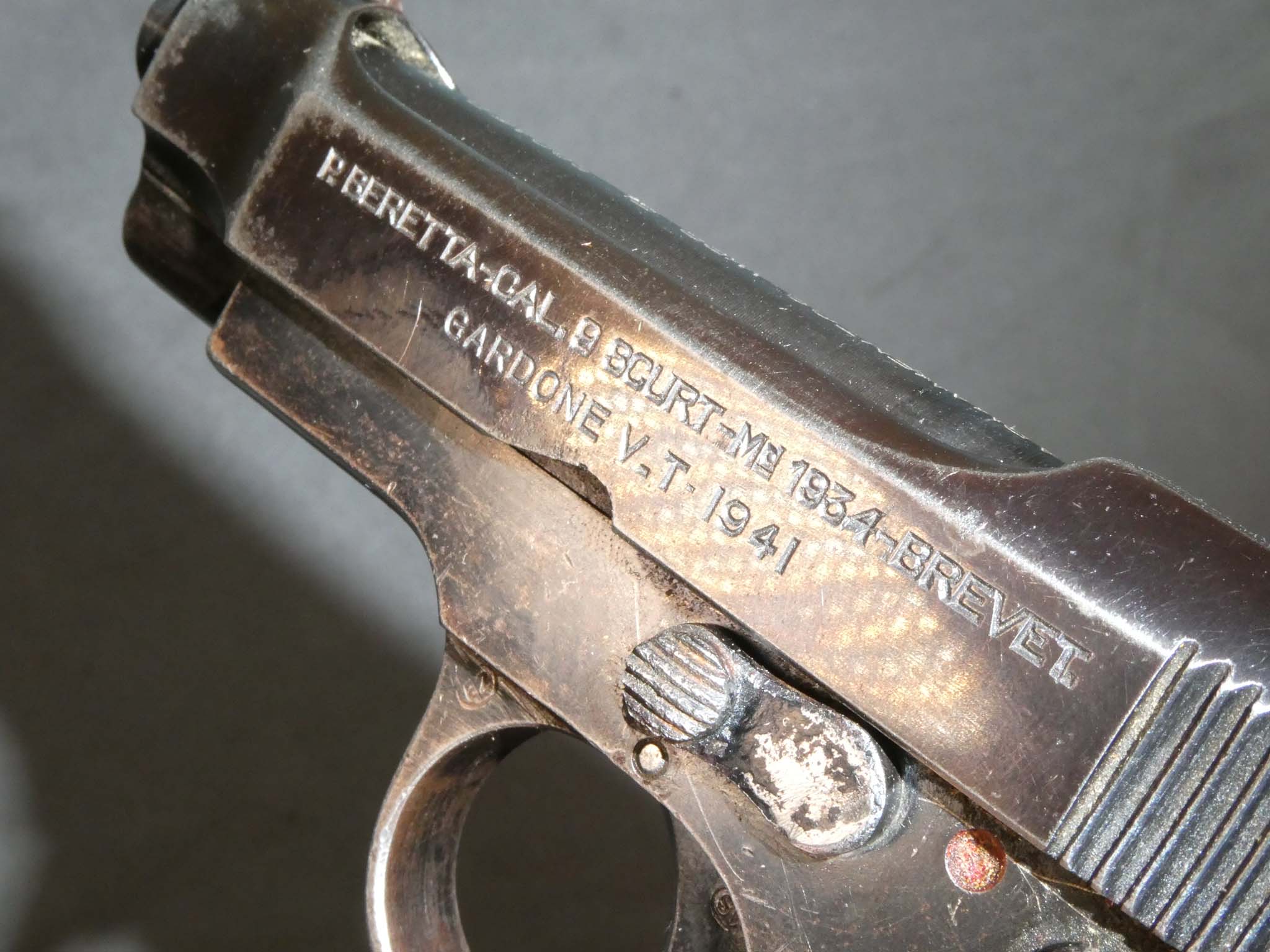 Here is an original, Beretta Model 1934 Pistol manufactured in 1941 and chambered for the 9mm Corto (.380 ACP) cartridge. The M1934 was the standard sidearm of the Italian Army in WWII. issued to officer's, NCOs, and machine gun crews. It is a compact, semi-automatic with a 3-3/8" barrel. It feeds from a 7-round box magazine. This pistol is in very fine condition. It has the high-polished blue finish. About 70% of this finish remains with overall finish wear on exposed edges. There is some wear on the grip straps and a few light scratches on the frame. There are a couple of "BB" sized rust spots on the slide with light pitting. The gun works well mechanically, but it takes three men and a boy to pull the trigger. The bore is in very fine condition. The grips are in fine condition with no chips or cracks. Unfortunately, the importer marks are in big bold letters on top of the barrel. Still, this is a nice, high-polish M1934. Stock no. 31595
