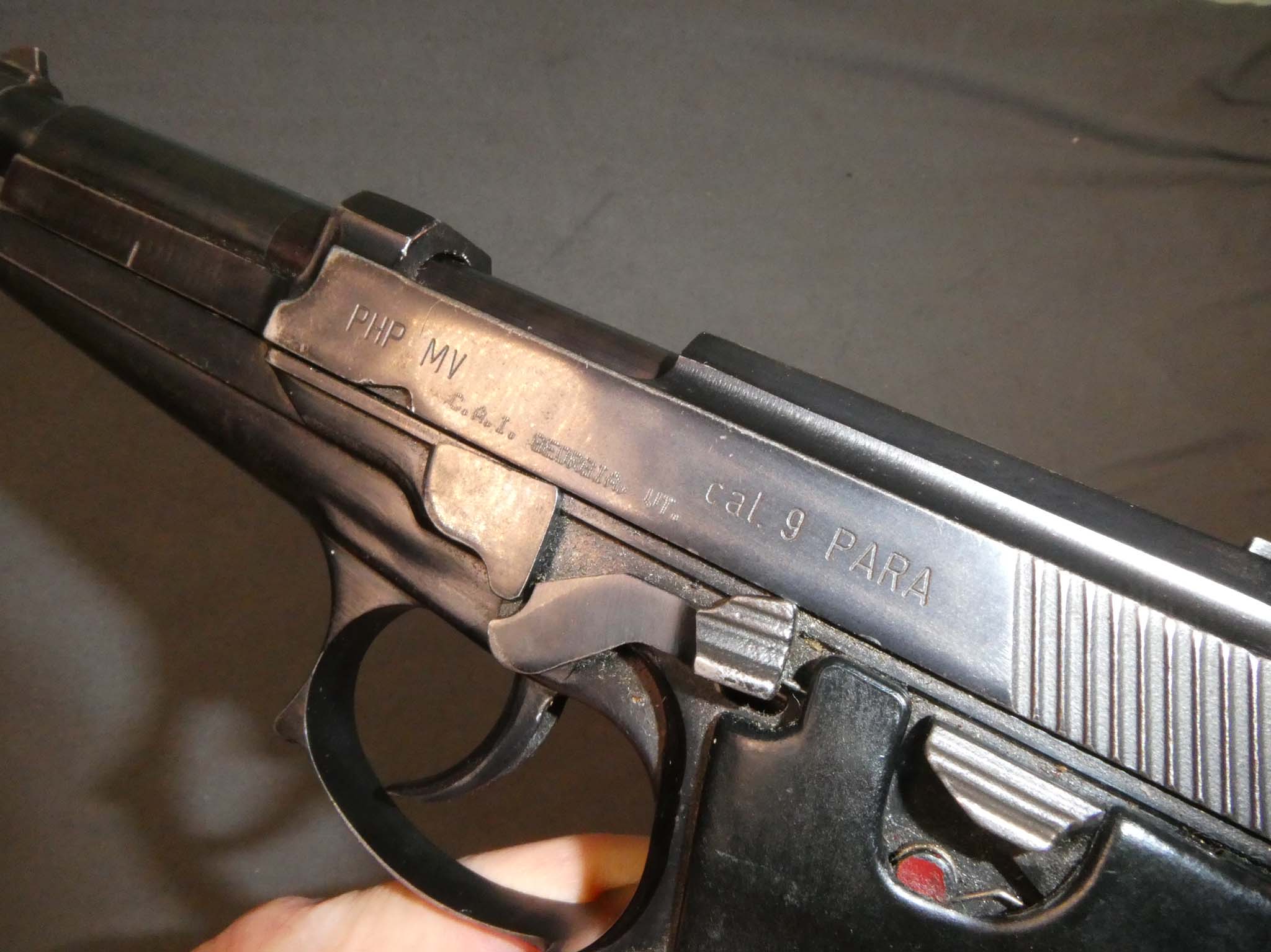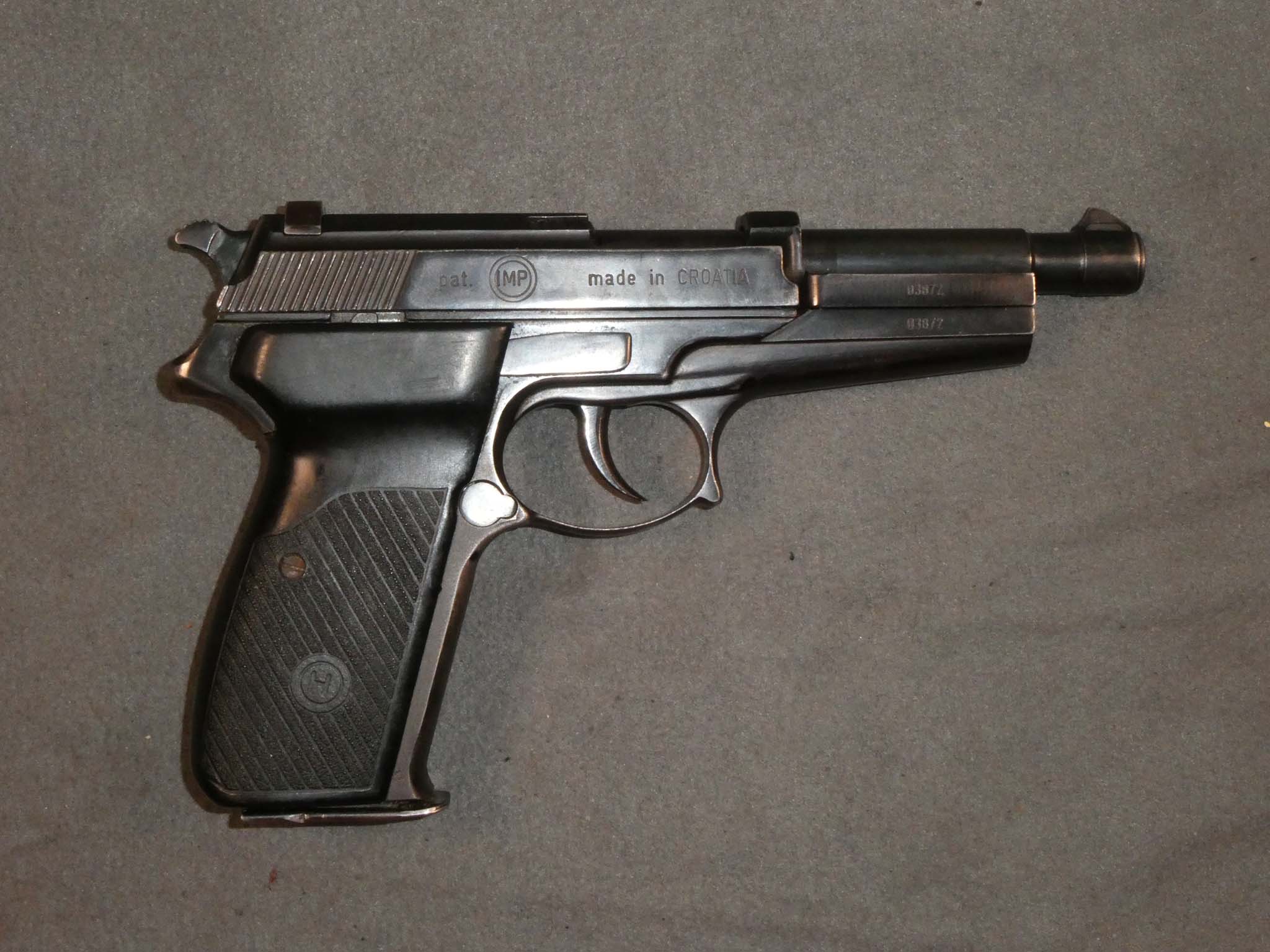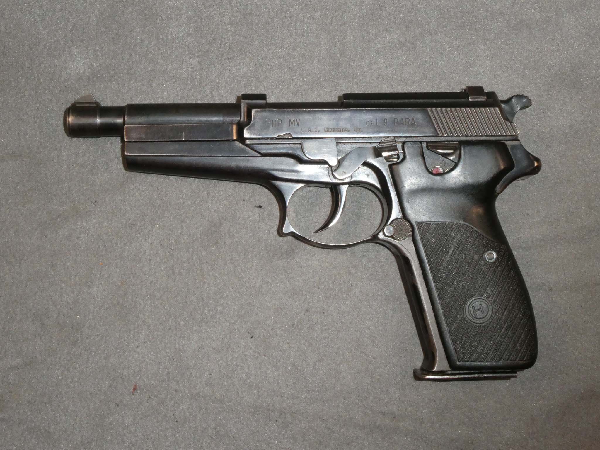 This is an original, Croation PHP MV Semi-Automatic Pistol manufactured by IM Metallic and chambered for the 9mm Parabellum cartridge. PHP stands for "Prvi Hrvatski Pištolj" which translates as First Croation Pistol. It was developed right after Croatia gained its independence from Yugoslavia and produced from 1990 to 1994. The design combines features from the Beretta 92 and the Walther P.38. It is a short recoil operated pistol with a 5-inch barrel. It feeds from a double-stack, 15-round magazine. This pistol is in fine condition except for one problem. I believe the firing pin is broken. When viewed from behind with the hammer cocked, there is nothing for the hammer to strike. You can see something internally, but it is set in about 1/8". You can see the firing pin on the breech face, so part of it is there. So, this one is as is! Otherwise, it retains more than 95% of its blued finish with light finish wear on the high edges. The gun retains the Croatian crest. The bore is in very fine condition. The grips are in very fine condition, as well. So... Except for that firing pin thing, this is in great condition! How handy are you? Stock no. 31588