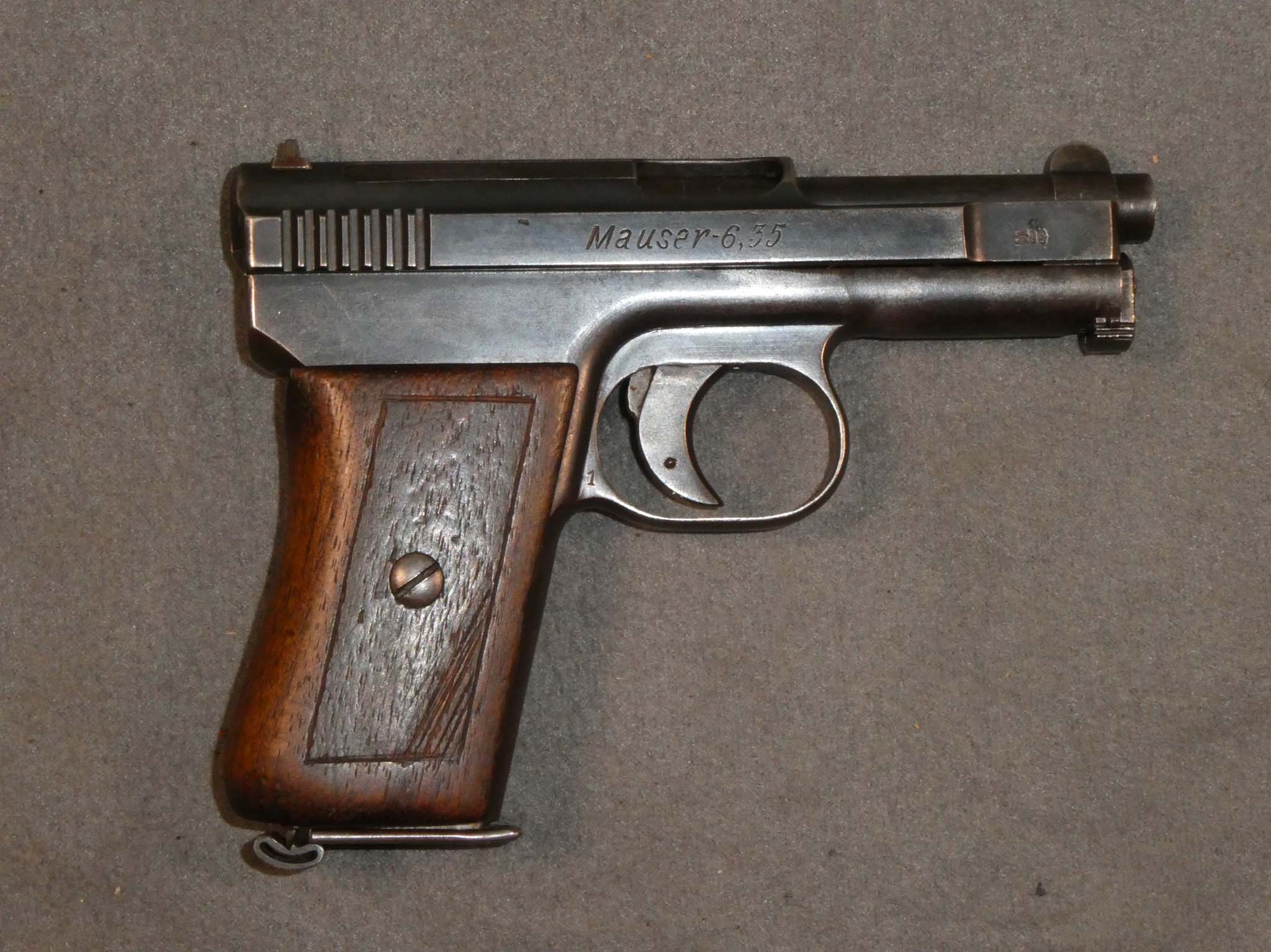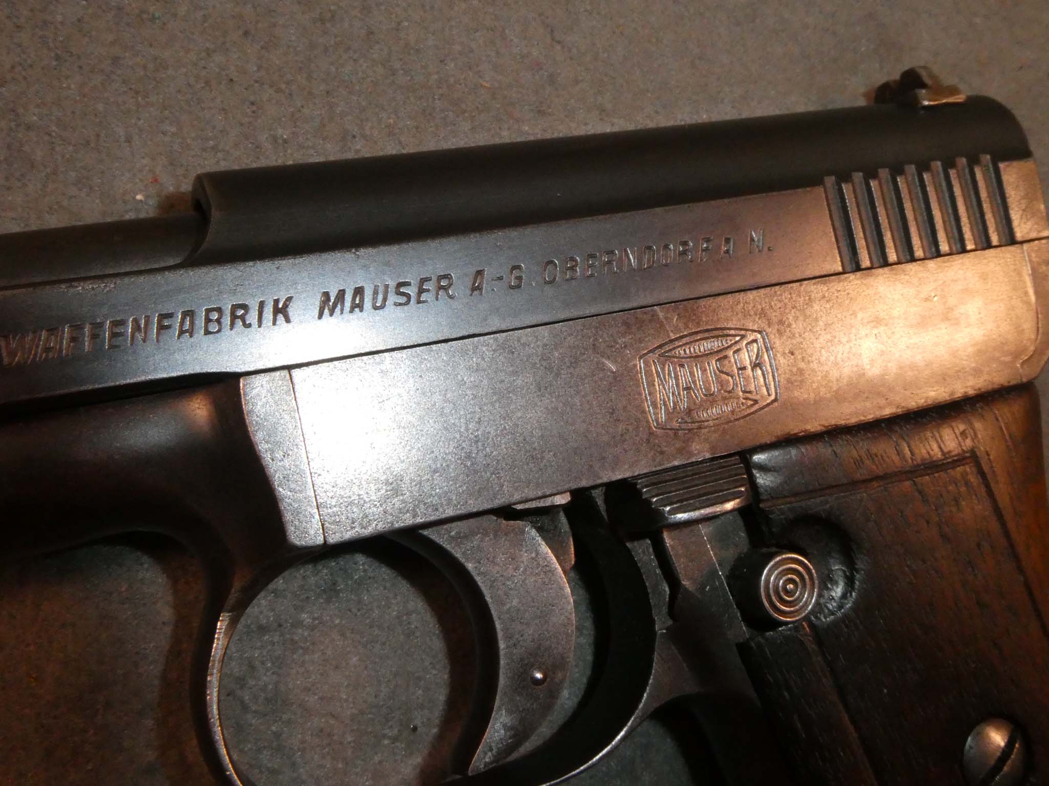 This ia an original, Mauser Pocket Model 1910 Semi-Automatic Pistol chambered for the 6.35mm (.25 ACP) cartridge. It is a single-action, striker-fired pistol with a 3-inch barrel. Mauser made these from 1910 to 1934. This pistol is in very good to fine condition with 60-70% of its factory blued finish remaining. There is some moderate finish wear on the side plate and some light wear on the grip straps and exposed surfaces. The pistol has excellent mechanics and a very fine bore. The wood grips are fair. They appear to have been sanded smooth and then someone started to re-checker them. They failed. But they are complete and serviceable. These little pistols were popular and many were purchased and carried by German officers in both World wars. Stock no. 31600