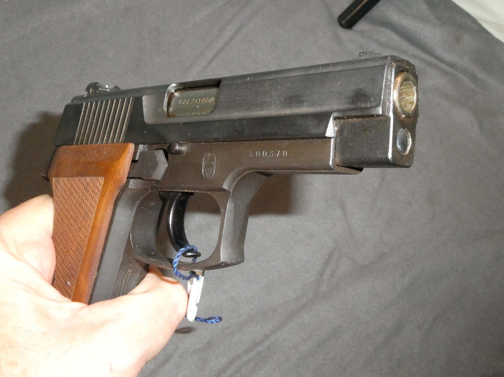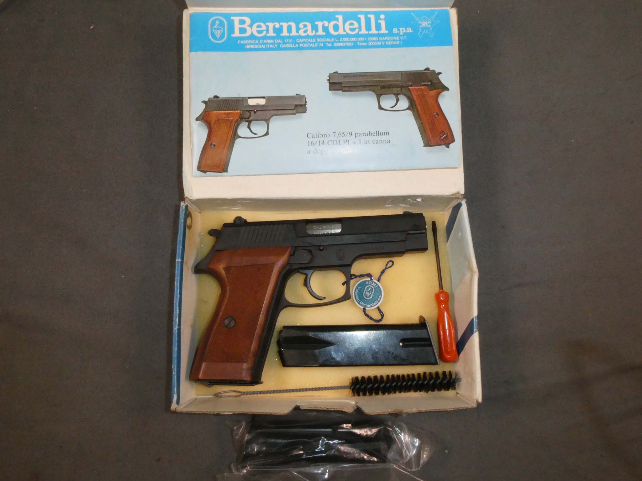 This is a Bernardelli P018 Compact Semi-Automatic Pistol chambered for the 9mm Parabellum cartridge. Released in 1982, the P018 is a double action/single action semi-auto with a 4-inch barrel. It feeds from a double stack 15-round magazine. It was produced in several variants until the early 1990's. This pistol is in very fine to excellent condition in the original box. This pistol may have never been fired. It still has the plastic Bernardelli medallion hanging from the trigger guard. That said, it has been stored without oil for a very long time, probably forty years or more. It retains nearly all of its factory black finish, but there are a couple of very tiny surface rust specks in places. The barrel is finished bright and when the slide is locked back you can see some rust staining on the exterior of the barrel. The bore and mechanics are excellent. The checkered wood grips are excellent as well. Included are three additional magazines for a total of four. There is also a manual, cleaning brush, and a screwdriver in the original box. The box is very good with some scuffing and a couple pieces of scotch tape on it. So, the next time your friends are extolling the virtues of their Bernardelli shotguns, you can say, "Yeah, yeah, but have you ever seen one of Bernardelli's pistols?". Stock no. 31629