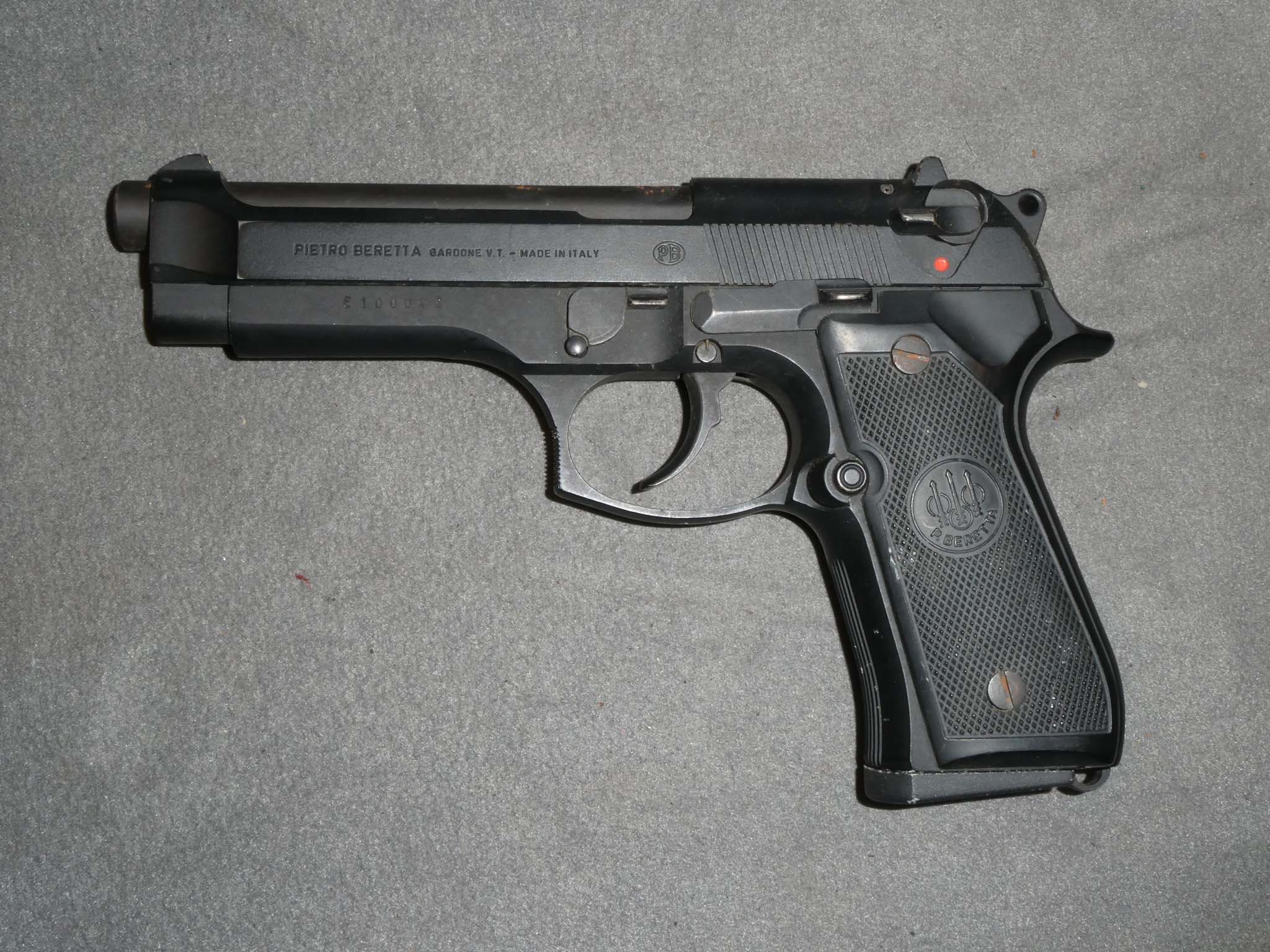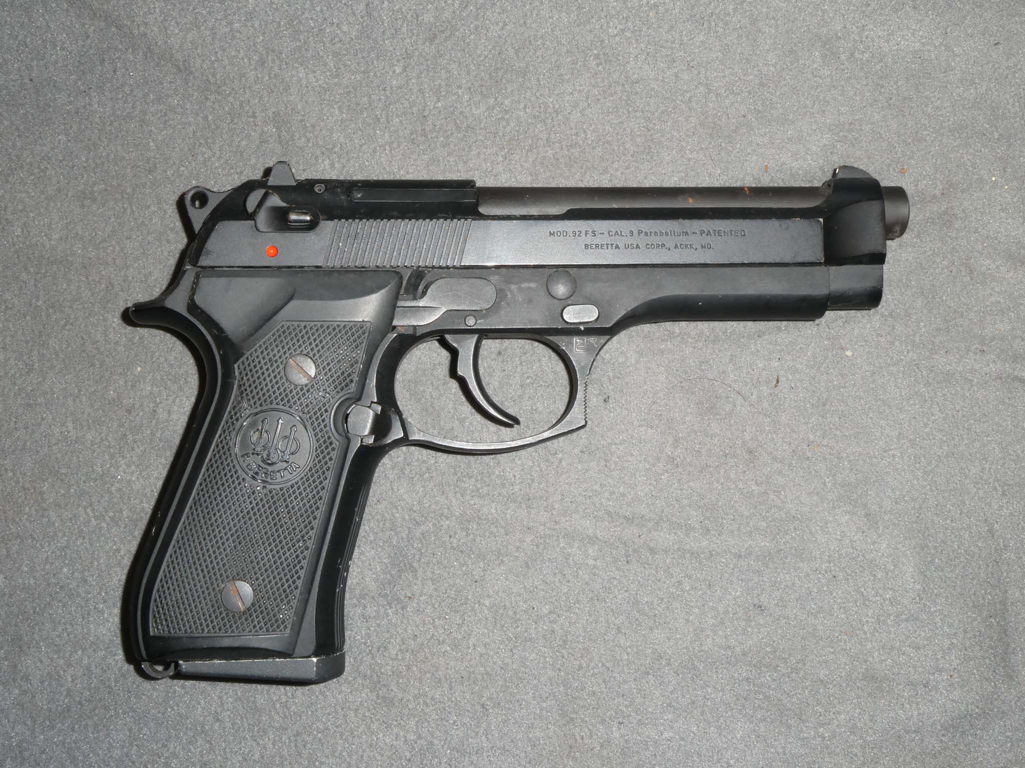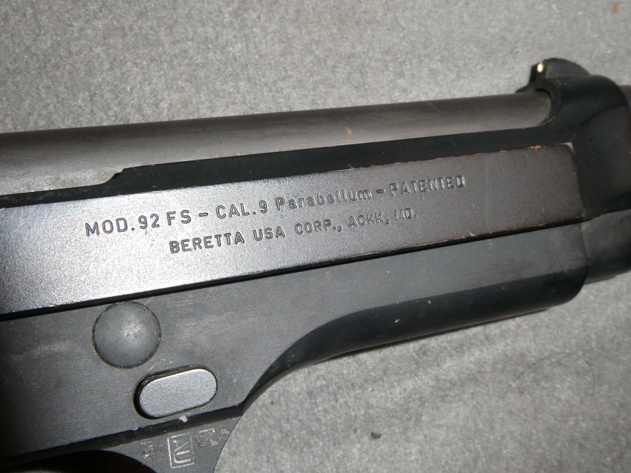 Here is a Beretta Model 92FS Semi-Automatic Pistol chambered for the 9mm Parabellum cartridge. This is the civilian version of the M9 pistol adopted by the U.S. Army. It is a double action/single action semi-auto with a 4.9-inch barrel. It feeds from a double stack 15-round magazine. This pistol is in very fine to excellent condition in the original box. This pistol may have never been fired, but I can't be sure. It has been stored without oil for a very long time, maybe 30 years or more. It retains nearly all of its factory black finish, but there are a couple of tiny surface dings in the finish and some light wear at the front edges of the slide. There is some light surface rust in the grip screw slots. The bore and mechanics are excellent. The grips are very fine with a few small dings from use or storage. The gun comes with the original plastic hard case. It is in fine condition, but there are no papers or accessories. There is no additional magazine either. The case was absolutely filthy on the outside. I cleaned most of it off, but it could still use a good scrubbing. I've said this before, but there are very few pistols that feel as good in my hand as a 92 Beretta! Stock no. 31616