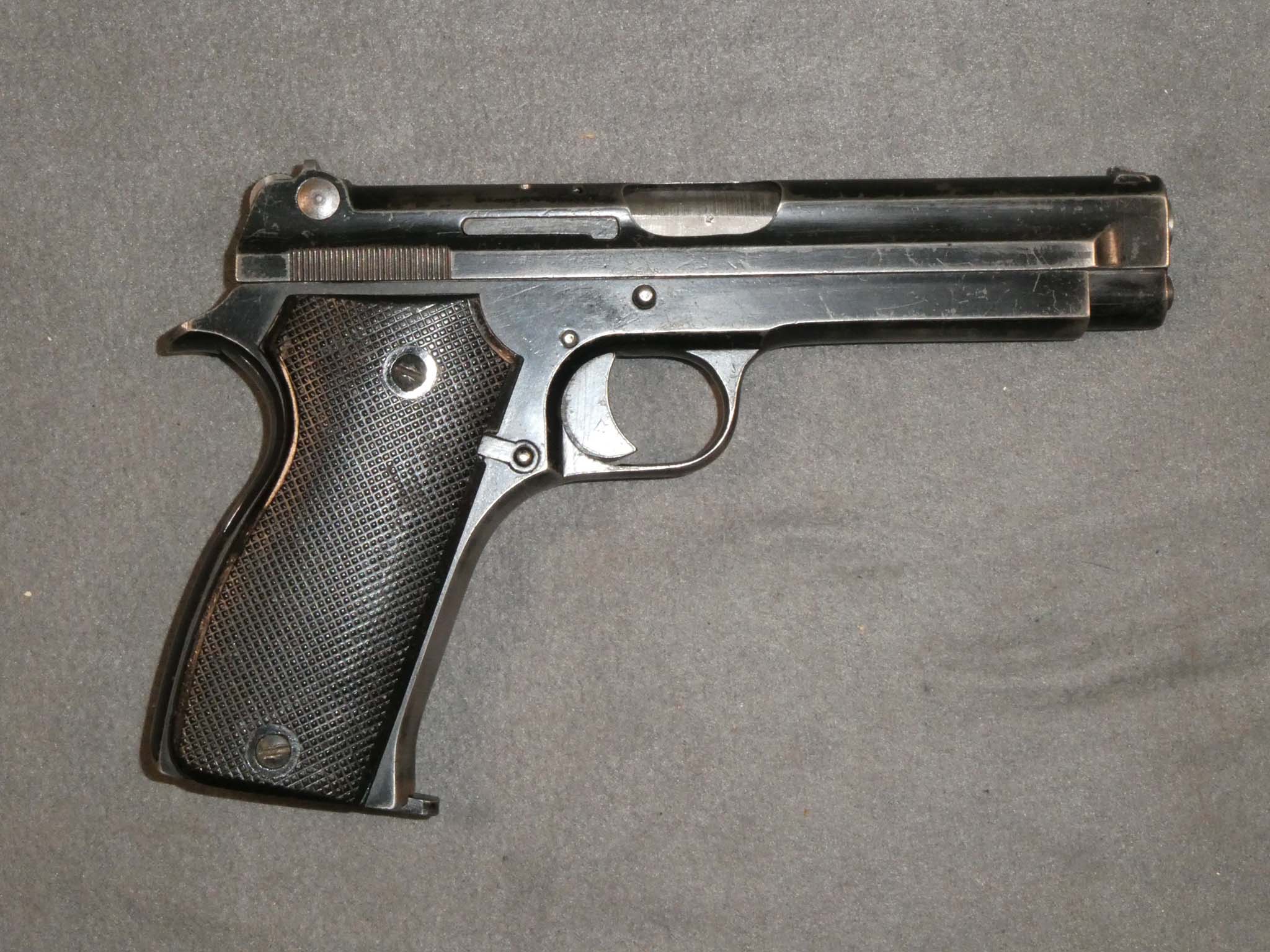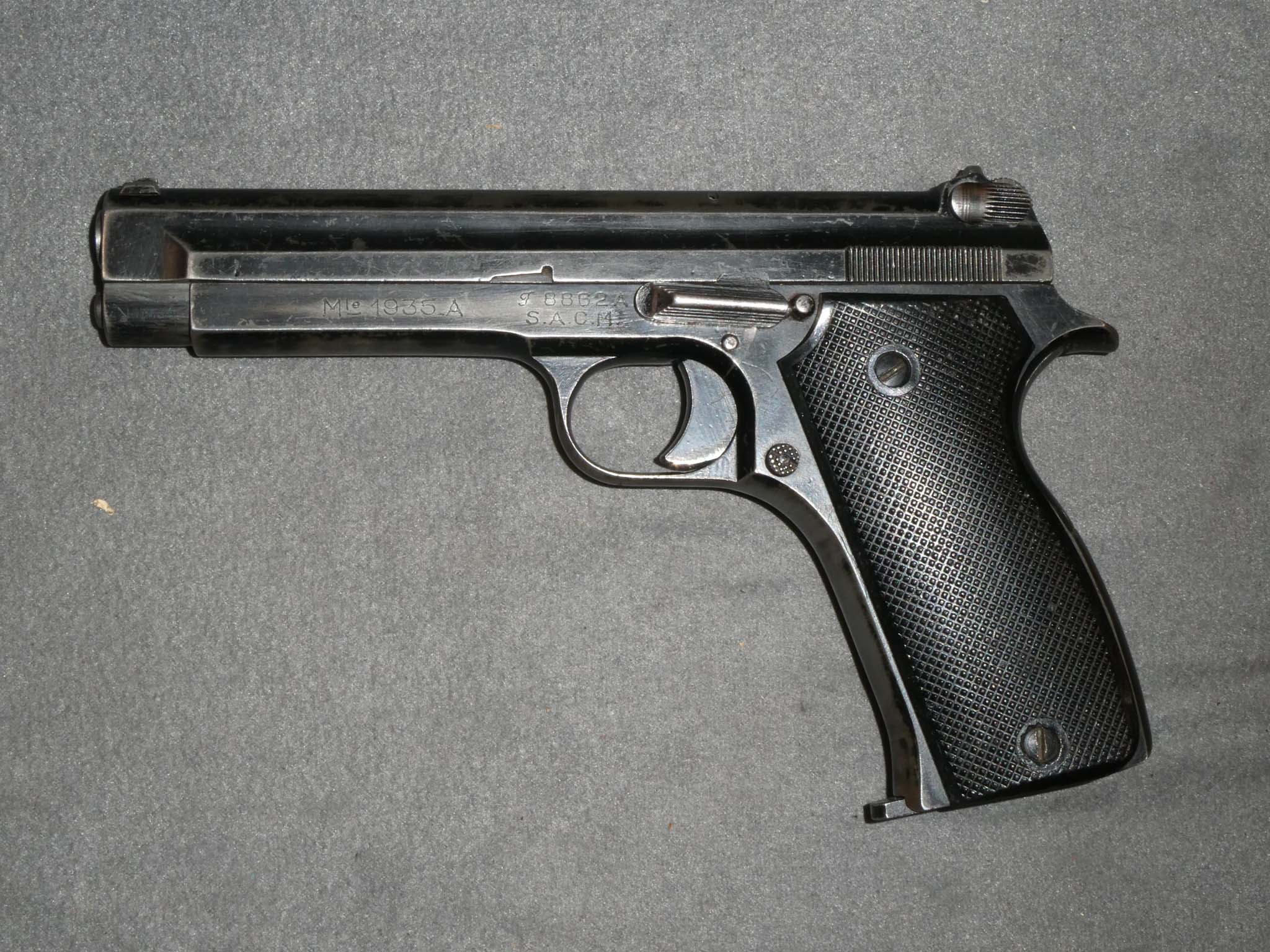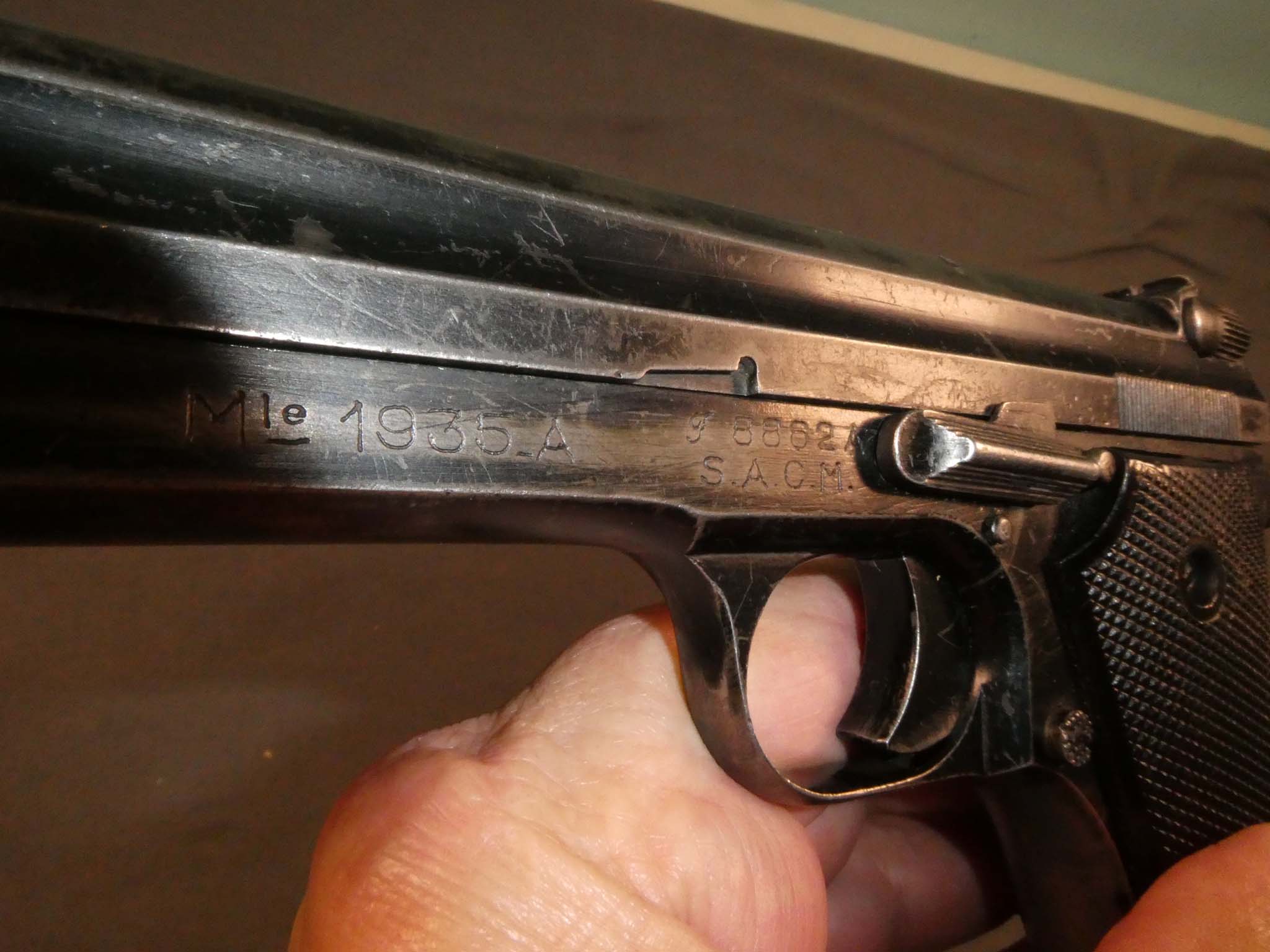 Here is an original, French Model 1935A Pistol manufactured by Société Alsacienne de Constructions Mécaniques (S.A.C.M.) in 1947 and chambered for the 7.65mm Longue cartridge. Designed for the French military trials that took place between 1935 and 1937, the pistol was accepted by the French military in 1937. The army got their first pistols in 1939 and about 10,700 were built before the Germans occupied France. The Germans produced another 23,850 during occupation designating it the Pistole 625(f). S.A.C.M. resumed production for the French military after occupation ended in 1944. An additional 50,400 were made until production ended in 1950. Designed by a former French Foreign Legion Captain, the pistol uses many design elements of John Browning's Model 1911 pistol. This pistol is in very good condition with about 70% of its dark blue/black finish remaining. There is significant finish wear on the grip straps and underside of the frame. There is wear on the edges elsewhere, and some tiny scratches and dings overall. The pistol has excellent mechanics and a very fine bore. The black plastic grips are fine with no chips or cracks and just a few tiny dings from use. These pistols saw use in World War II, the First Indochina War, the Algerian War, the Vietnam War, the Laotian Civil War, and the Cambodian Civil War. You can bet that there were a few at Ði?n Biên Ph?. Stock no. 31722