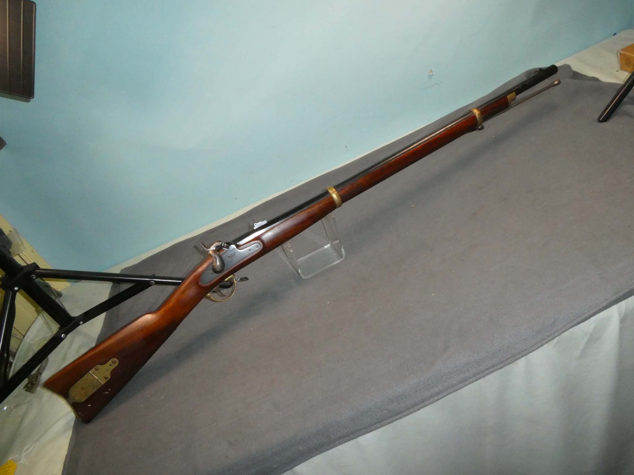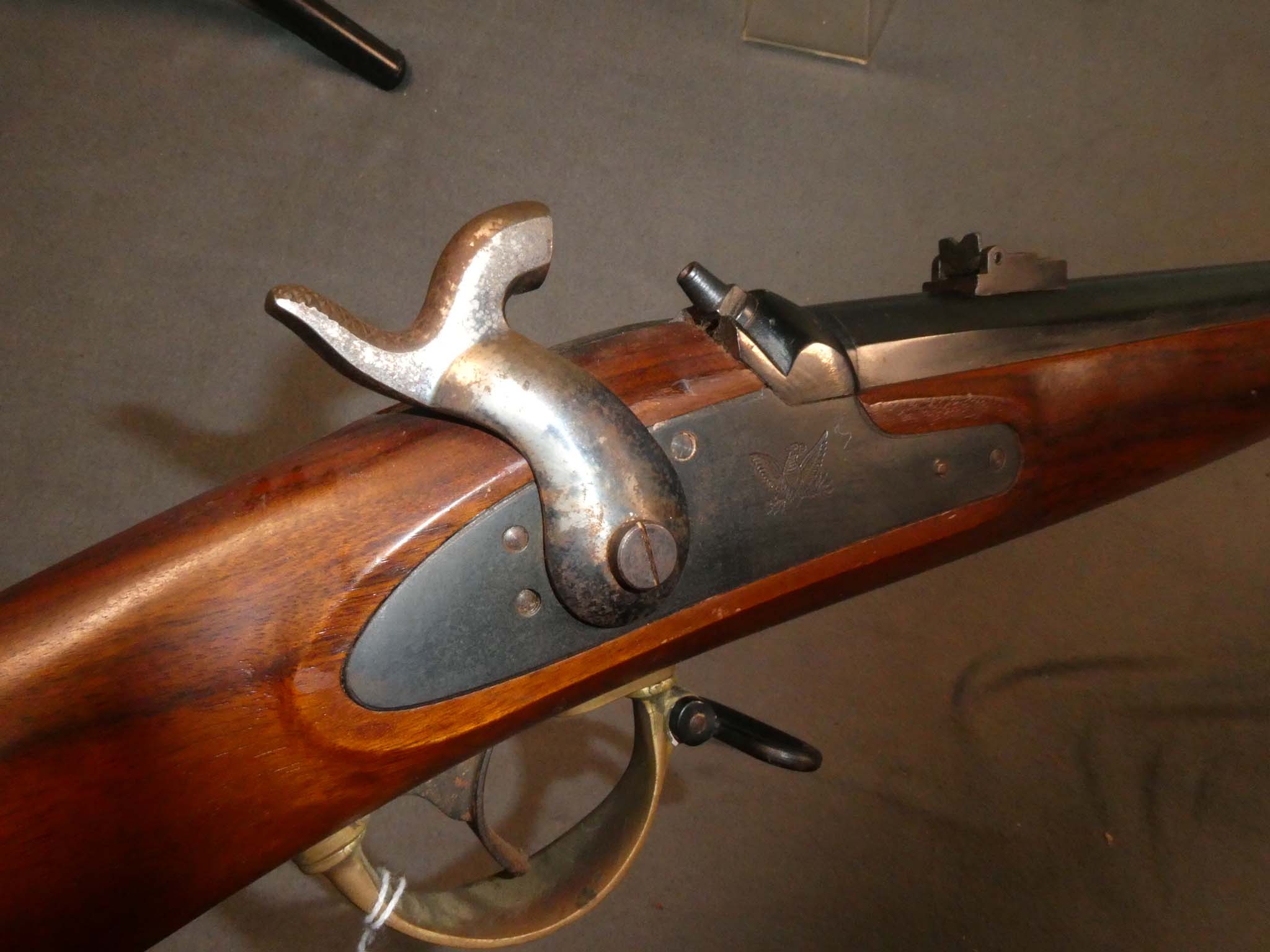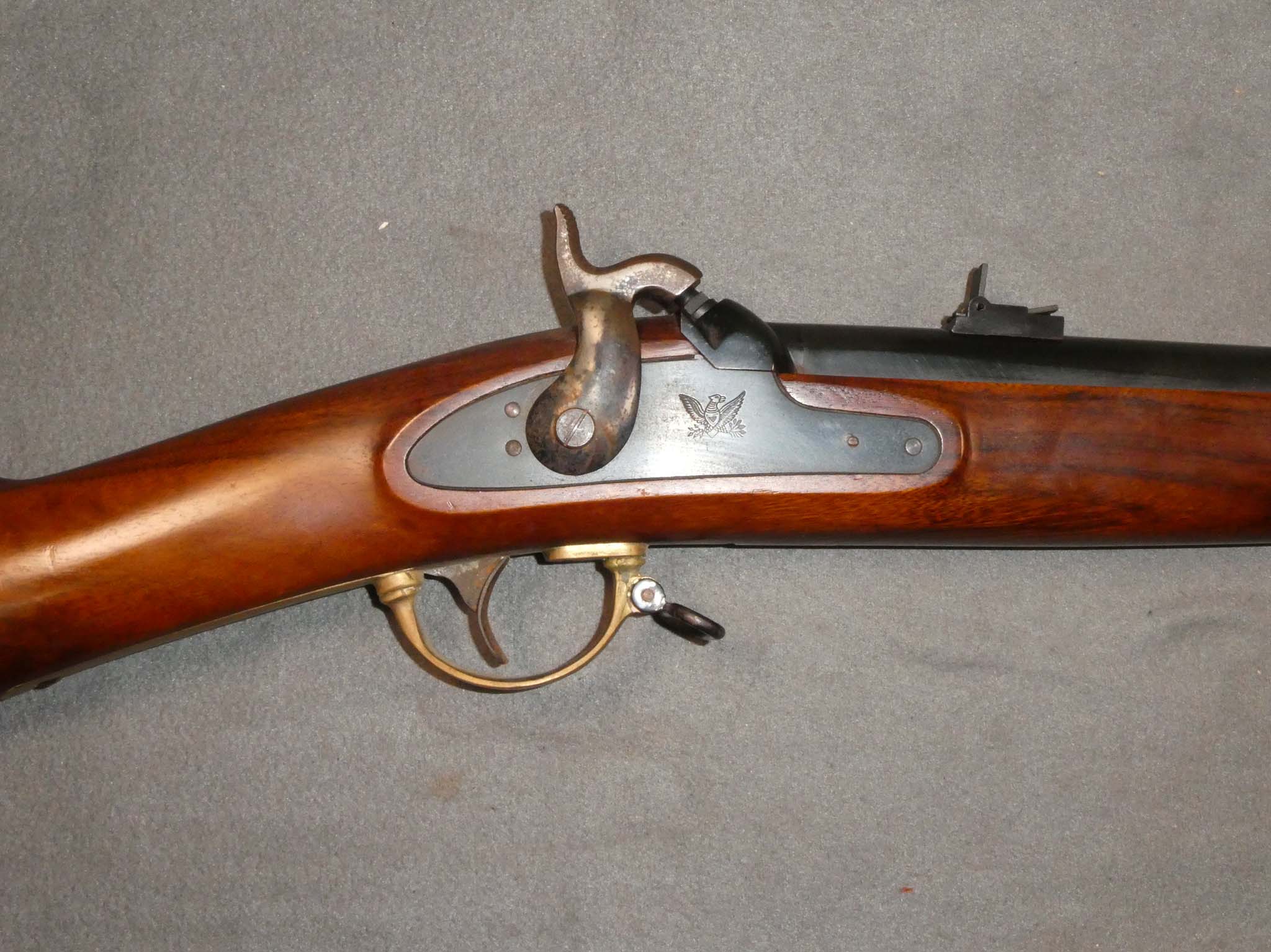 This is an Italian made replica of the Model 1863 Remington Percussion Rifle made in 1987. There is no maker's name. Known as the "Zouave", the Model 1863 Remington is considered to be one of the best made and designed military arms of the Civil War. Approximately 12,501 were produced from 1862-1865, with all delivered in 1865. The Zouave was a handsome weapon, with a .58 caliber, 33" blued barrel and brass stock furniture with a patchbox. This is a decent replica in fine condition. It retains nearly all of the blued finish on the barrel with a very light dusting of tiny surface rust specks. It should clean up very well. The lock plate has all of its blued finish. the hammer has case colors. There is some rust on the hammer, especially on the top surface. The brass hardware has a dark golden brass patina. There is significant tarnish on the patchbox cover and butt plate. There is verdigris on the heel of the butt plate. The lock works well mechanically. The bore is in fine condition, mostly shiny with just a speck or two. The stock is fine with a few small dings and scuffs on the butt from use. This should suit either a shooter or reenactor well. Stock no. 31759