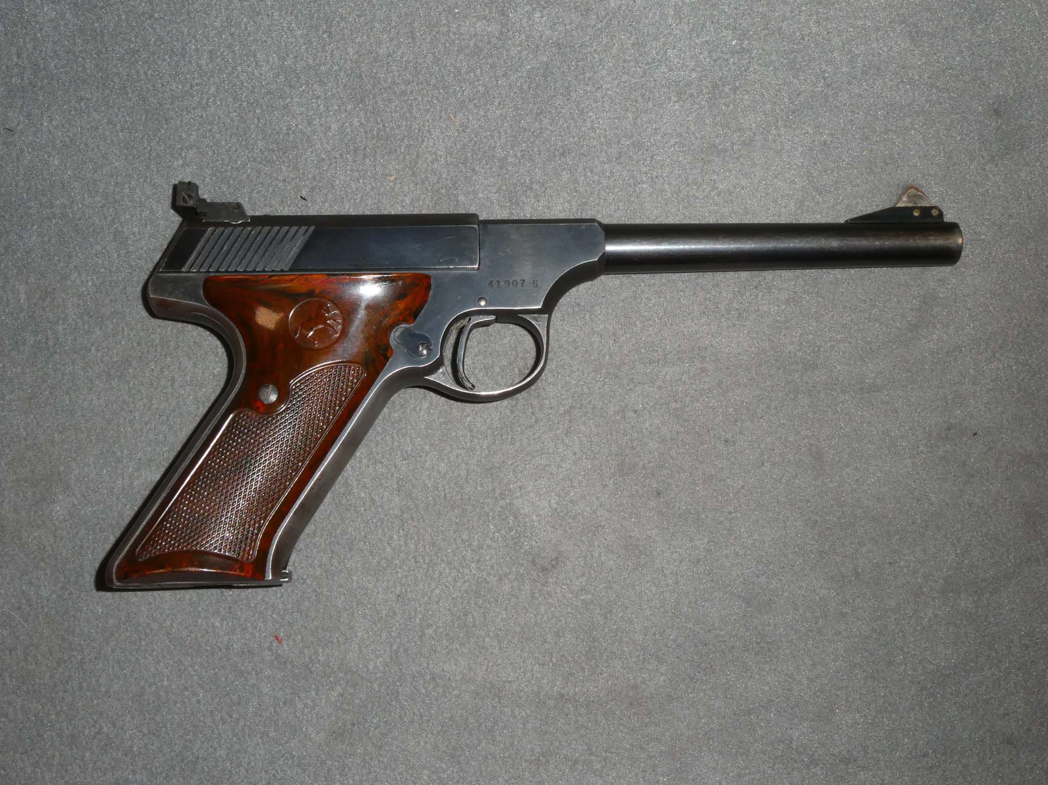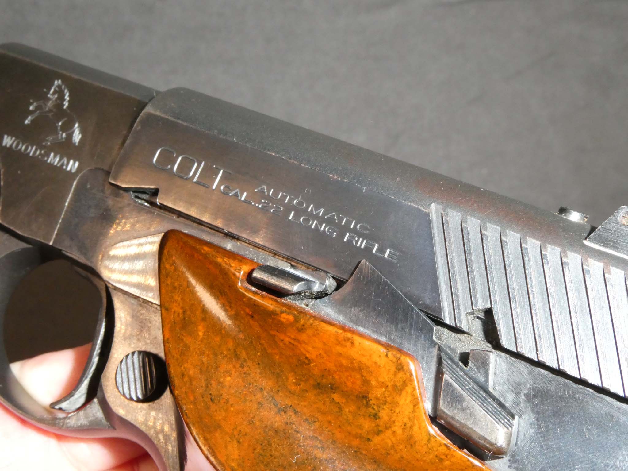 This is a Colt Woodsman Target Pistol chambered for the .22 Long Rifle cartridge. This is a 2nd Series Woodsman manufactured in 1950. The 2nd series guns were made between 1947 and 1955. The target model has an adjustable rear target sight and a 6-inch barrel. The grips are the correct Coltwood plastic type. This pistol is in fine condition with about 80% of its factory blued finish remaining. There is a little holster wear on the barrel near the muzzle. The grip straps exhibit the most finish wear with a gray steel patina developing. There are some dings on the barrel just to the left of the front sight base. The bore and mechanics are excellent. The Coltwood grips are very fine with no chips or cracks and just a very tiny ding or two on the edges of the butt. The Colt Woodsman is a great little pistol. Stock no. 29664