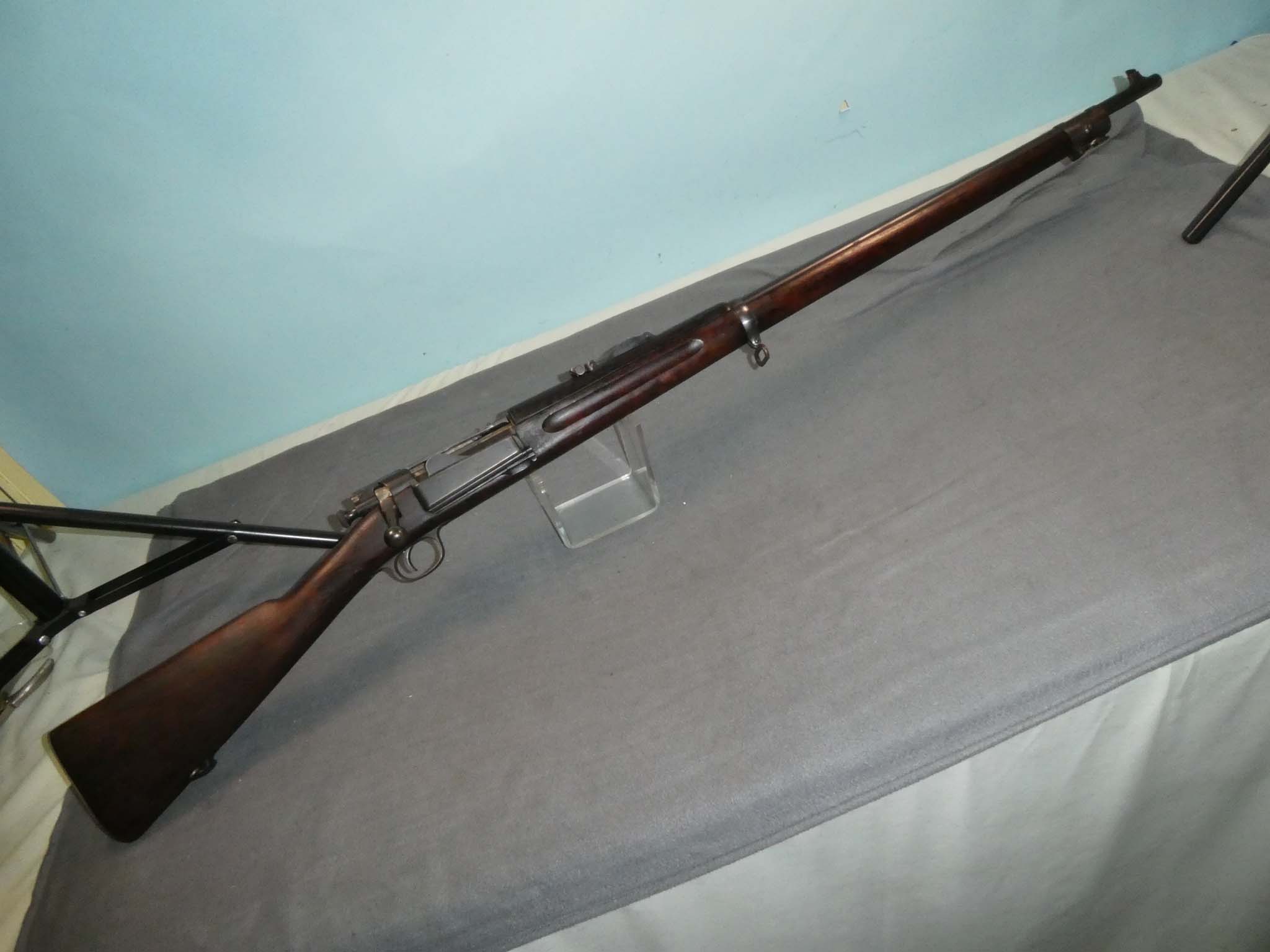 This is an original, U.S. Springfield Model 1898 Krag-Jorgensen Rifle manufactured in 1899 and chambered for the .30-40 Government cartridge. Approximately 330,000 were made between 1898 and 1903. The M1898 Krag had the shortest service life of any U.S. arm, replaced by the M1903 Rifle just 5 years after production began. The Krag was the first U.S. Rifle to fire smokeless ammunition. This rifle is in very fine condition with more than 90% of its factory blued finish remaining. There is light wear on the exposed edges. There is heavier finish wear on the magazine cover, butt plate, and trigger guard. The fire blue on the extractor has turned mostly gray. The bolt handle, originally bright, has a smooth brown patina. The rifle has excellent mechanics and a very fine bore. The stock is fine. There is a hairline crack running from the trigger guard back along the grain of the wood on the left side of the wrist. It is about 6" long. The wrist remains solid with no movement. There is a name and the number "6" stamped on the right side of the butt. There is no visible inspector's cartouche. Stock no. 31774
