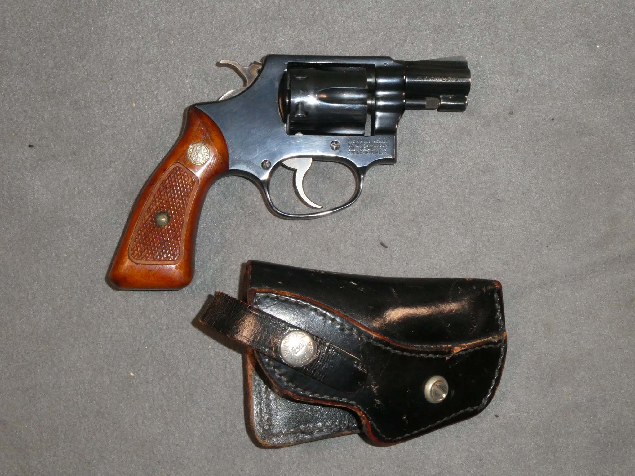 Here is a Smith & Wesson Model 31-1 Revolver manufactured in about 1975 and chambered for the .32 S&W Long cartridge. Known as the .32 Regulation Police, it is a small, 6-shot, double-action revolver built on the "J" frame with a 2-inch barrel. It is in excellent condition with nearly 100% of its factory blued finish remaining. The hammer and trigger retain all of their factory cased color. The bore and mechanics are excellent. The grips are very fine with one tiny scuff on the bottom edge of the left grip. Included is a Bucheimer holster in very good condition. It has an adjustable tension screw for gun retention. This is an excellent example of the S&W Regulation Police. Put a .32 gun in your pocket for fun! Stock no. 31791