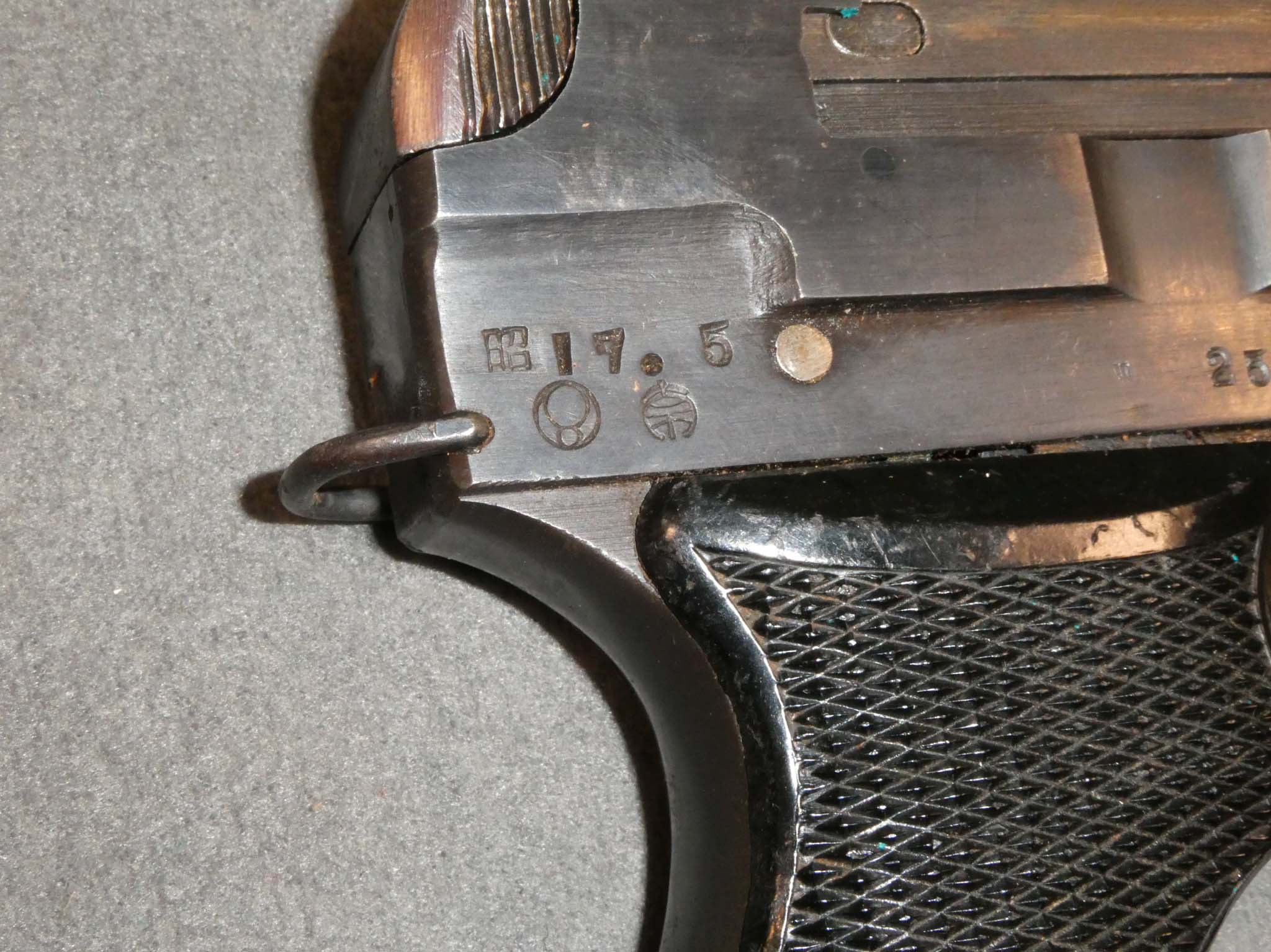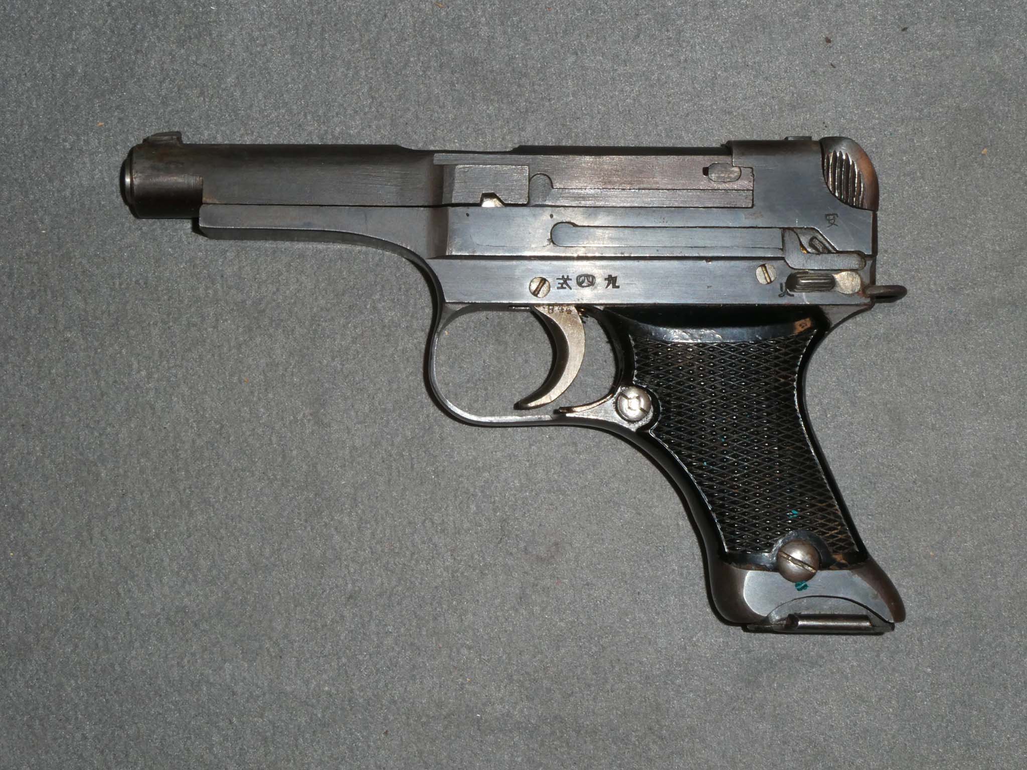 This is an original, WWII, Japanese Type 94 Semi-automatic Pistol manufactured at Nagoya Arsenal in May of 1942. It is chambered for the 8x22mm Nambu cartridge. Adopted in 1934, production began in 1935. The Type 94 was designed for tank and aircraft crews, who needed a smaller, lighter design. Unfortunately, the Type 94 had one glaring design flaw. The sear bar is exposed on the left side of the frame. If the safety is not on, the bar can be depressed, causing the pistol to fire. This could happen while the pistol was being holstered, which led GI's to name it the "Suicide Special". This pistol is in fine to very fine condition with about 95% of its factory blued finish remaining. There is a bit of holster wear at the muzzle. The bore and mechanics are excellent. There is some light surface rust on the exterior of the barrel in the area within the slide. The black plastic grips are in fine condition with no chips or cracks. One original magazine is included. There is no spare. The gun is in its original holster with the cleaning rod. The holster, a rarity in itself, is in fine condition with tight stitching. There is some light scuffing of the leather on the most exposed areas. This is one of the better Type 94 pistols that I have had. Stock no. 30807