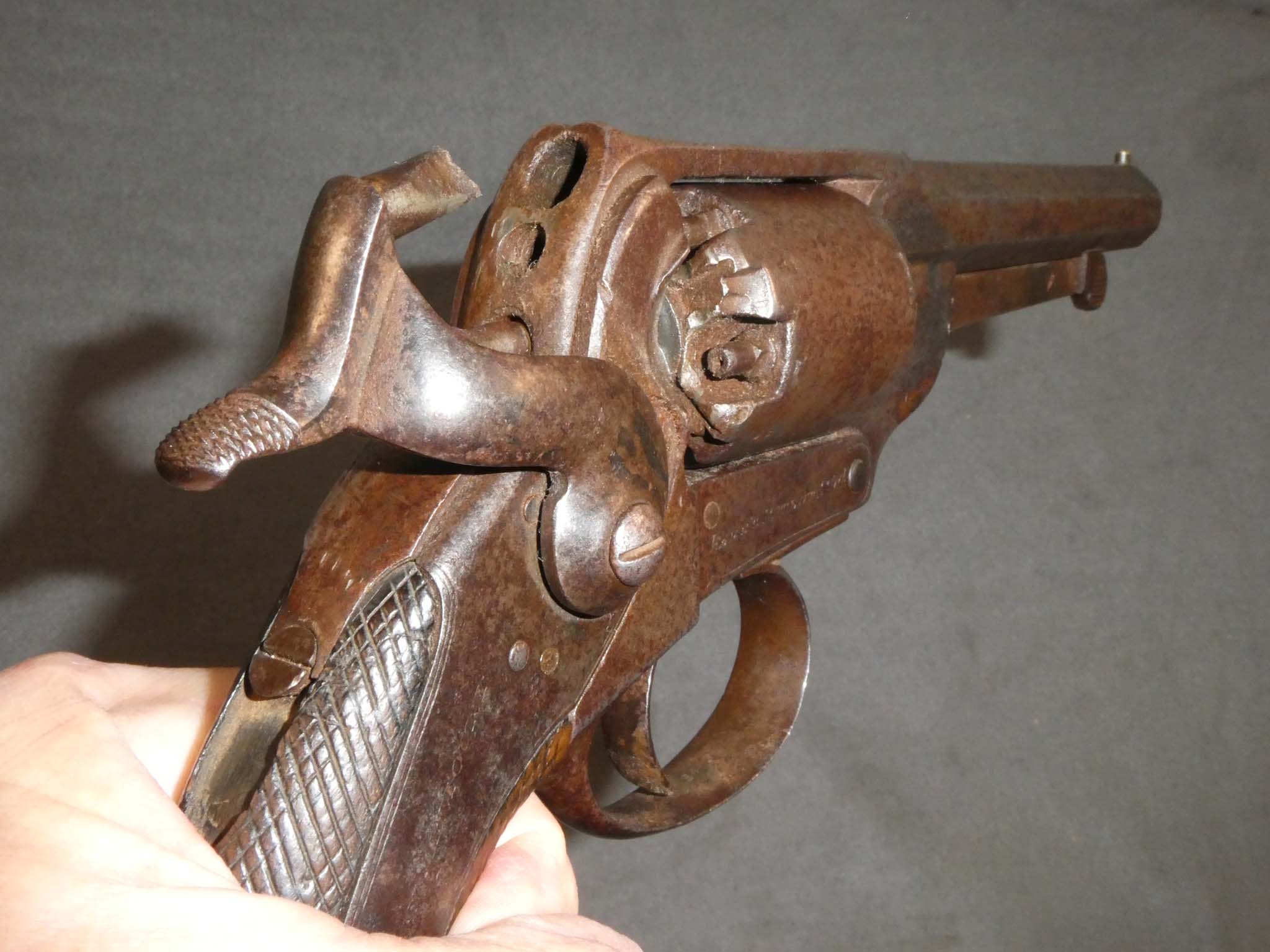This is an original, British Kerr percussion cavalry revolver made at the London Armory and imported by the Confederate States of America. It is a single-action, 5-shot percussion revolver of .54 Bore (.44 Caliber). It is believed that most of the Kerr Revolvers between serial number 1019 and number 9975 were acquired by the Confederacy. This revolver's number, 2974, places it squarely in the correct range. This is an early Kerr, a 2nd variation. While it has the small uncheckered area on the grip below the trigger guard, the Confederate viewer's mark ("JS"/Anchor) is not visible. I think something was stamped there, but I can't be sure. It is known that some of the Confederate imported Kerr revolvers were not marked. This revolver, found in Virginia, is in antique good condition. It has an overall steel gray and dark brown patina. The steel gray areas have a heavy sprinkling of brown patina. The trigger guard is dark brown. The hammer and most of the lock is also a dark brown. Mechanically, the hammer will cock and the fall when the trigger is pulled. The cylinder has some fore and aft play in it, turns freely, and will not advance when cocked. The upper tang is broken off at the screw and the tip is missing. There is some rust in the bore, but the rifling is strongly visible along the barrel's length. There is some light rust in the chambers. The one-piece wooden grip shows wear of the checkering from use and a few tiny dings. There are no chips or cracks. I can find no serial number on the cylinder. This is a great old Confederate Warhorse. Stock no. 31808
