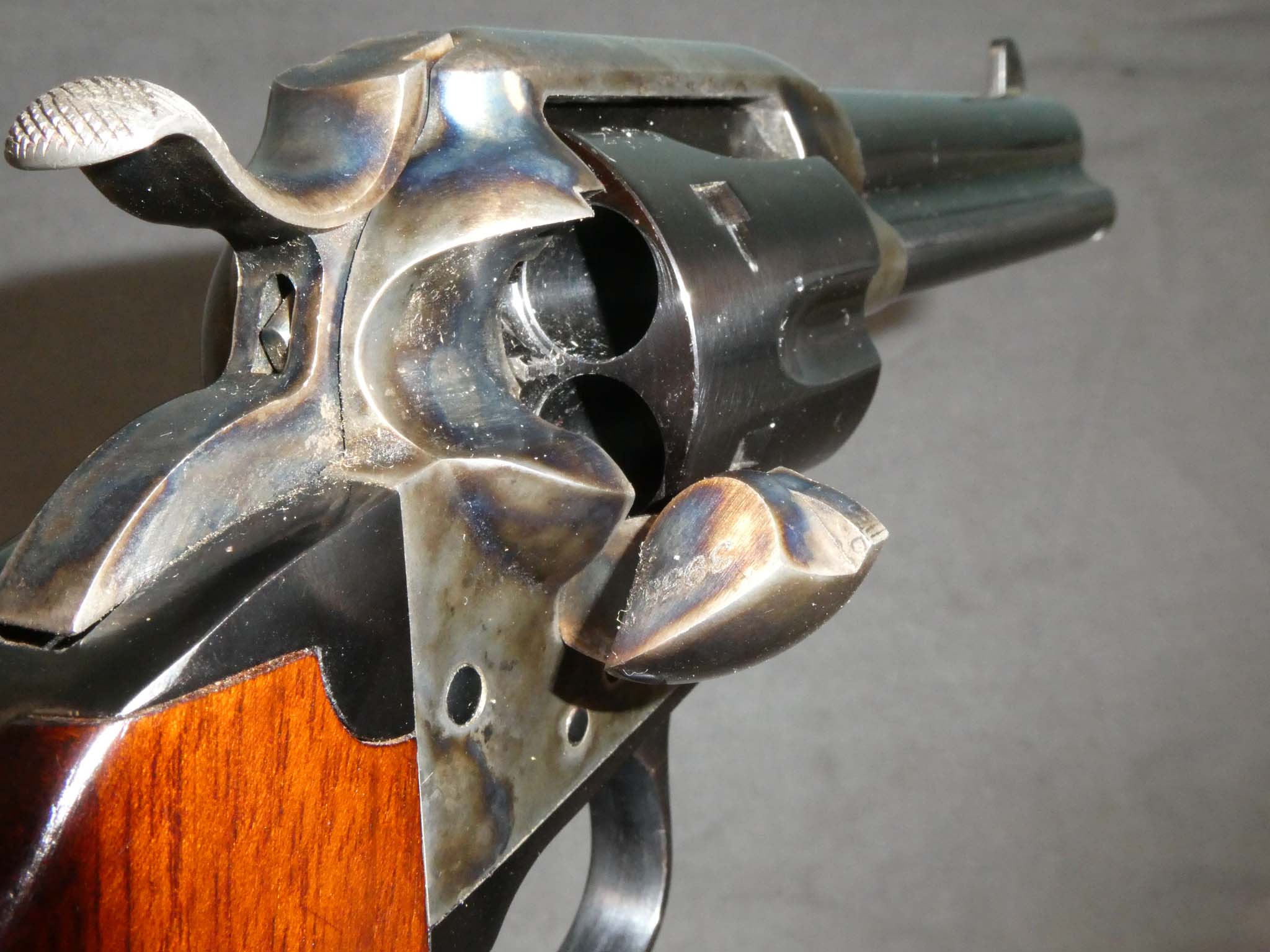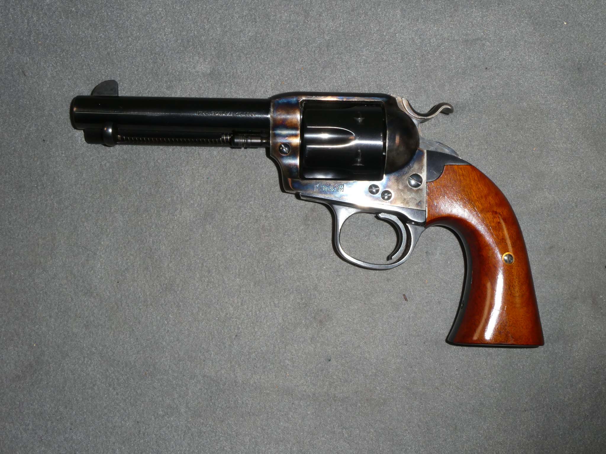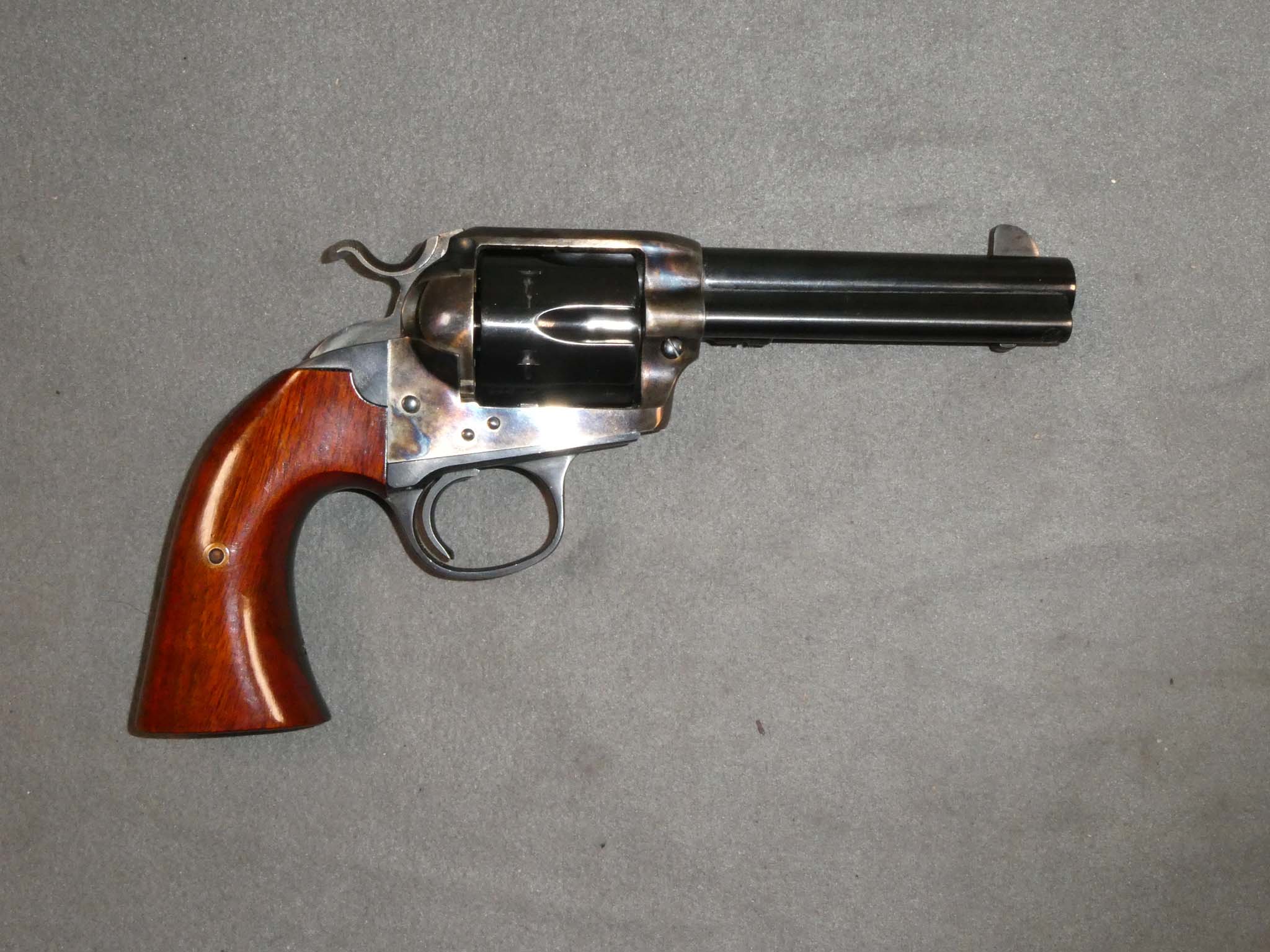 This is a replica of the Colt Bisley Model 1873 Single Action Army Revolver made by Uberti in 2015 and imported by Stoeger. It is chambered for the .45 Long Colt Cartridge. The Bisley target grip is longer and more deeply curved than the standard grip. Some favored it over the standard grip for everyday use. The barrel is 4-3/4" long. This revolver is in excellent condition with nearly 100% of its factory blued and case-colored finishes remaining. I don't see any wear. The bore, chambers, and mechanics are excellent. The grips are excellent, also, with just a very, very tiny scratch or two. This is a good-looking revolver in great condition. Stock no. 31828