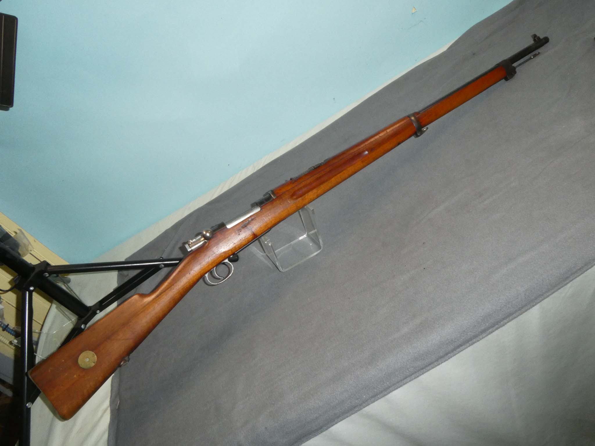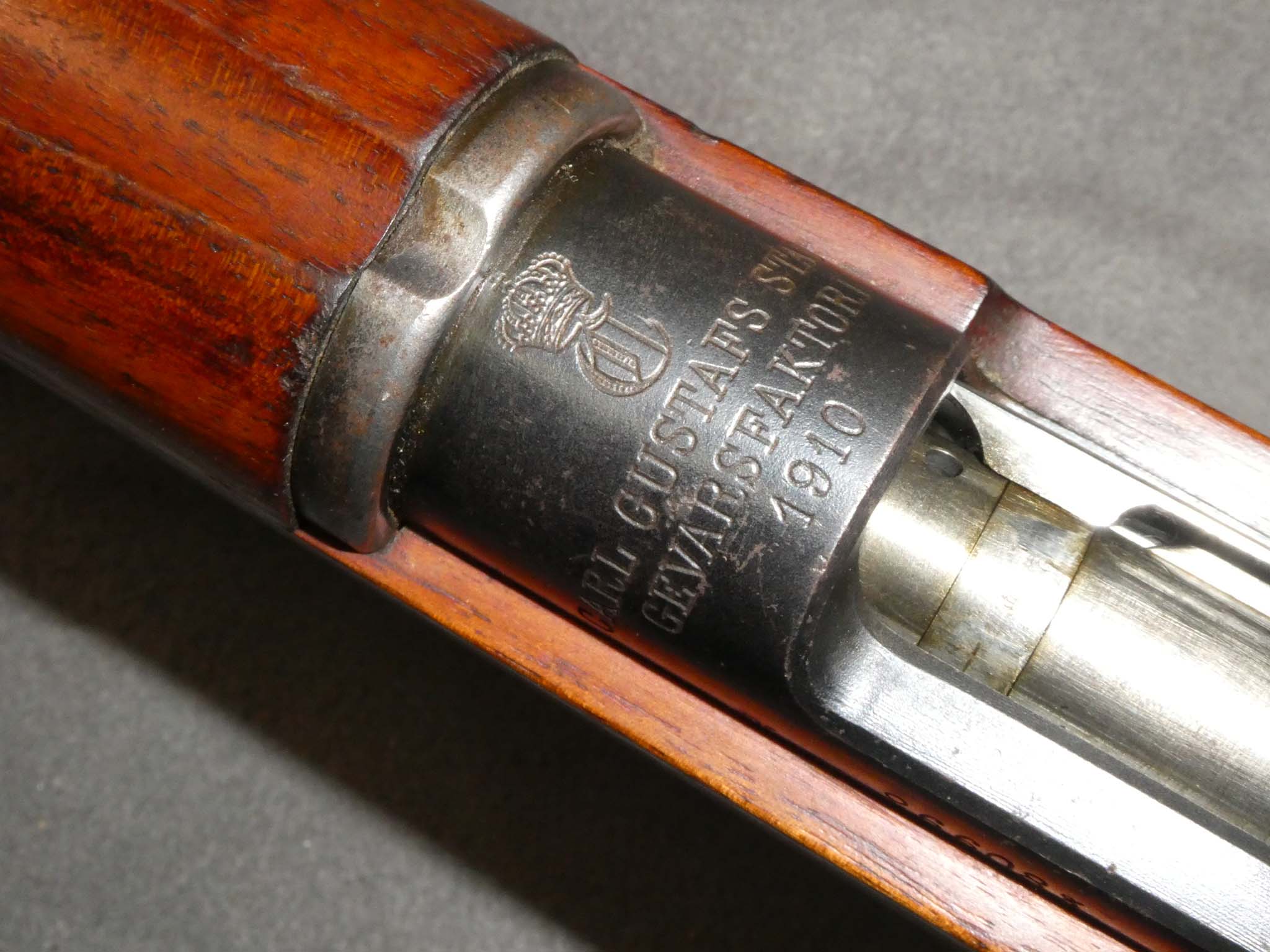 This is a Swedish Model 1896 Mauser Infantry Rifle made Carl Gustafs in 1910. These served the Swiss Army until 1938 when they adopted a shorter version. This rifle is in fine condition with all matching numbers. It retains about 90% of its factory blued finish with some light finish wear on the barrel. There is heavier wear on the barrel band. The bolt remains armory bright. The butt plate, originally bright, has a speckling of brown patina. The rifle has excellent mechanics. The bore is very fine. The grooves are a little dark, but the lands are smooth, shiny, and strong. The stock is very good with a scattering of small dings and scratches from use. There are tiny importer marks on the barrel. The Model 1896 has a reputation for rugged dependability and superb accuracy. Stock no. 31819