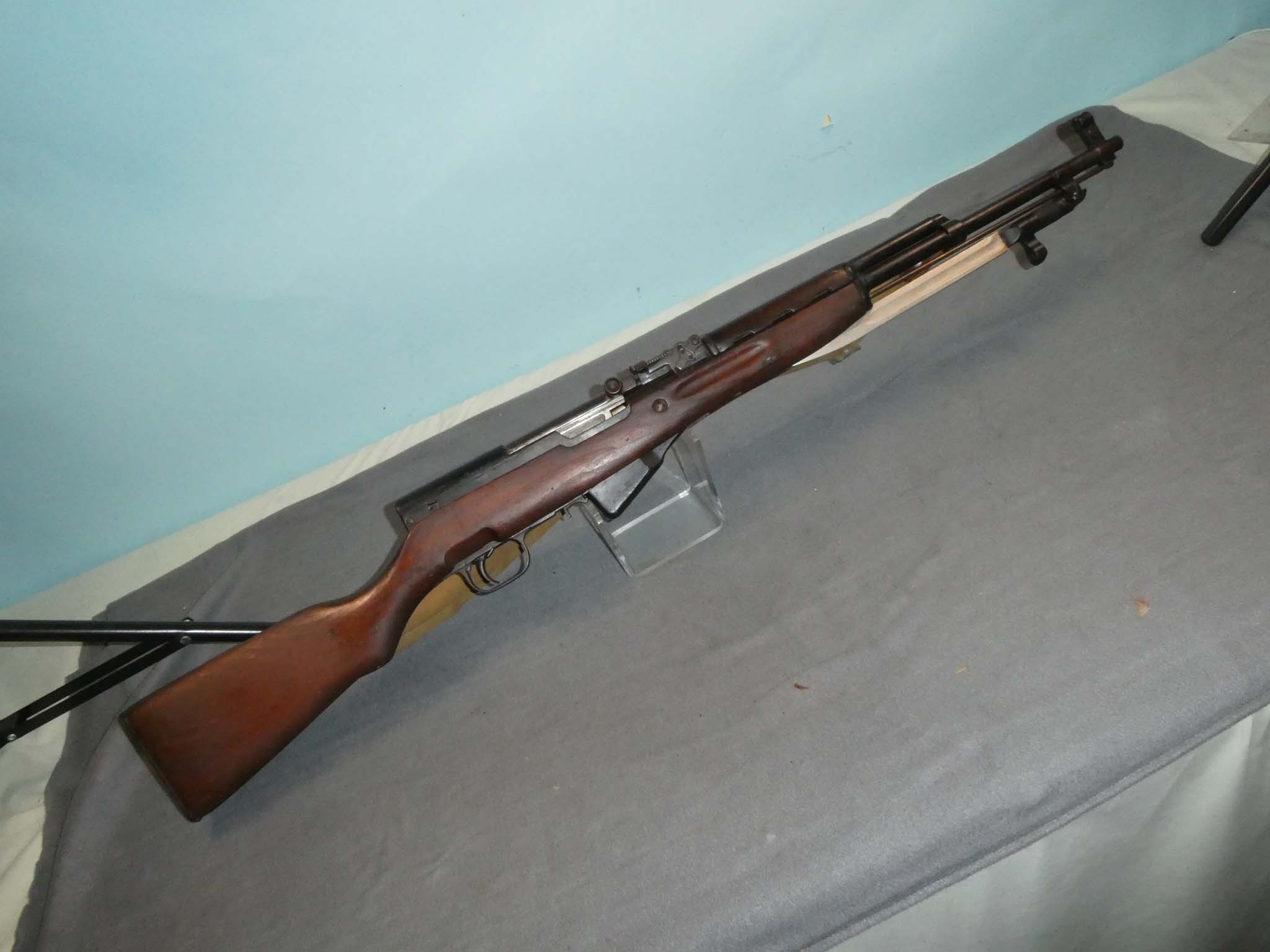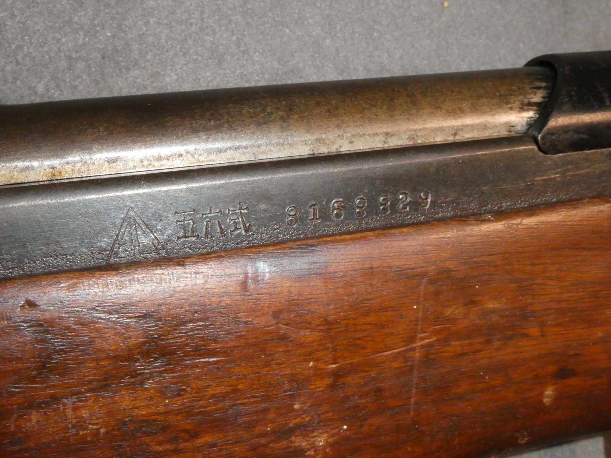 This is a Chinese Type 56 Carbine manufactured at Factory 26 in late 1963 or early 1964. The seller says that it was brought back from Vietnam, but there are no papers. There are also no importer marks, so I am reasonably sure that it is a bring back. The Type 56 is a Chinese licensed copy of the Soviet SKS. They were used extensively in Vietnam. This rifle is in very good to fine condition with all matching numbers. It has obviously seen some use and retains 60-70% of its black finish. There is light overall speckling of the finish. There is some light rust speckling on the bolt cover. The bolt itself has turned brown. The bore and mechanics are excellent. The stock is in fine condition with a few small dings and scratches from use. Included is the rifle's original sling in very good condition. The leather ends have some surface cracking and there is light soiling of the webbing. This rifle is the real deal. Stock no. 31872