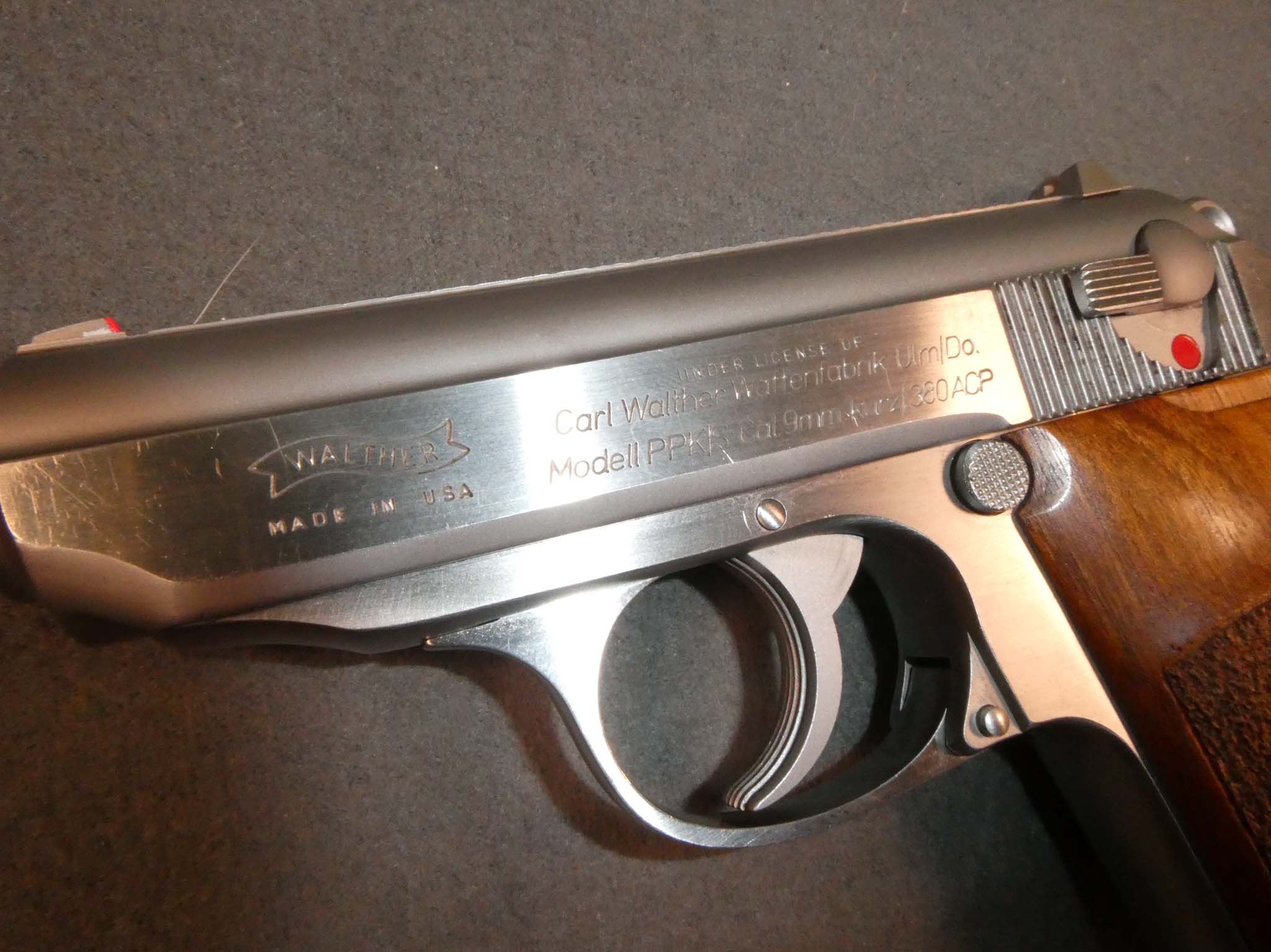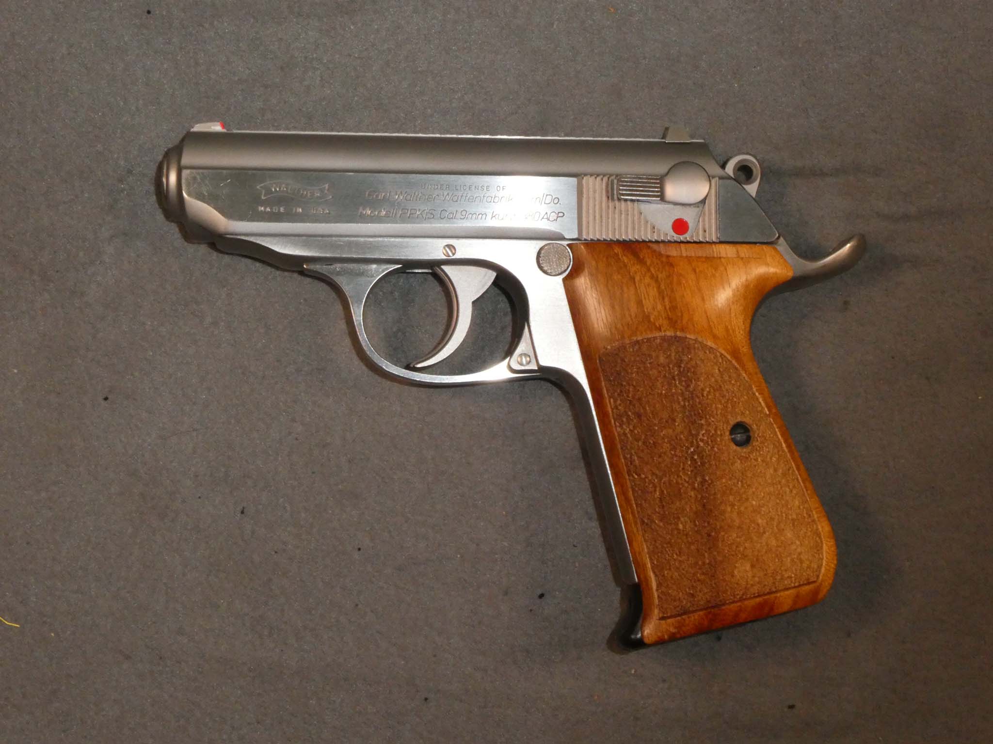 Here is a Walther PPK/S Semi-Automatic Pistol of recent manufacture. It is chambered for the .380 ACP. It is a single action/double action pistol with a 3.3" barrel. These current manufacture pistols have an extended beavertail to protect the web of your hand from hammer bite. This is a nice feature. This gun also has stippled walnut grips that feel very nice in the hand. It is in excellent condition with just a few very tiny scratches at the front of the slide. The bore and mechanics are excellent. The grips are excellent, as well, with just one very tiny ding that I can see. This is a great PPK/S with some improvements that make it even better! Stock no. 31670