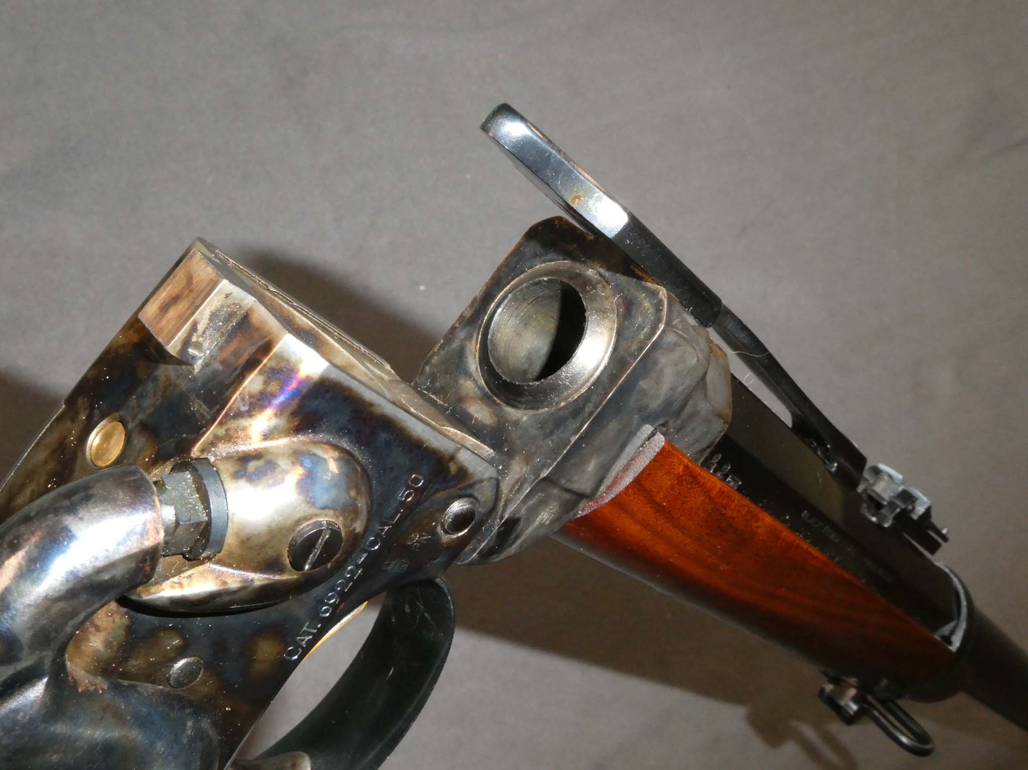 This is a replica of the Civil War Smith Cavalry Carbine manufactured by Pietta of Gussago, Italy in the year 2000. The original Smith Cavalry Carbine was manufactured by the Massachusetts Arms Company of Chicopee Falls, Massachusetts. Over 30,000 Smith Carbines were produced from 1861-1865 with the vast majority going to the U.S. Government. Cavalry units known to have been issued the Smith were the 3rd West Virginia, the 7th and 11th Illinois, the 1st Connecticut, the 7th and 17th Pennsylvania, the 6th and 9th Ohio, and the 1st Massachusetts. It was the 4th most issued carbine of the civil War. The Smith is a breech loading, percussion arm of .50 caliber. This one is in very fine to excellent condition with just about 100% of its factory blued and case-colored finishes remaining. The bore and mechanics are excellent. The stock is very fine to excellent with just a couple of very tiny dings from use or storage. This is a great replica of the Smith in near new condition. Stock no. 31846