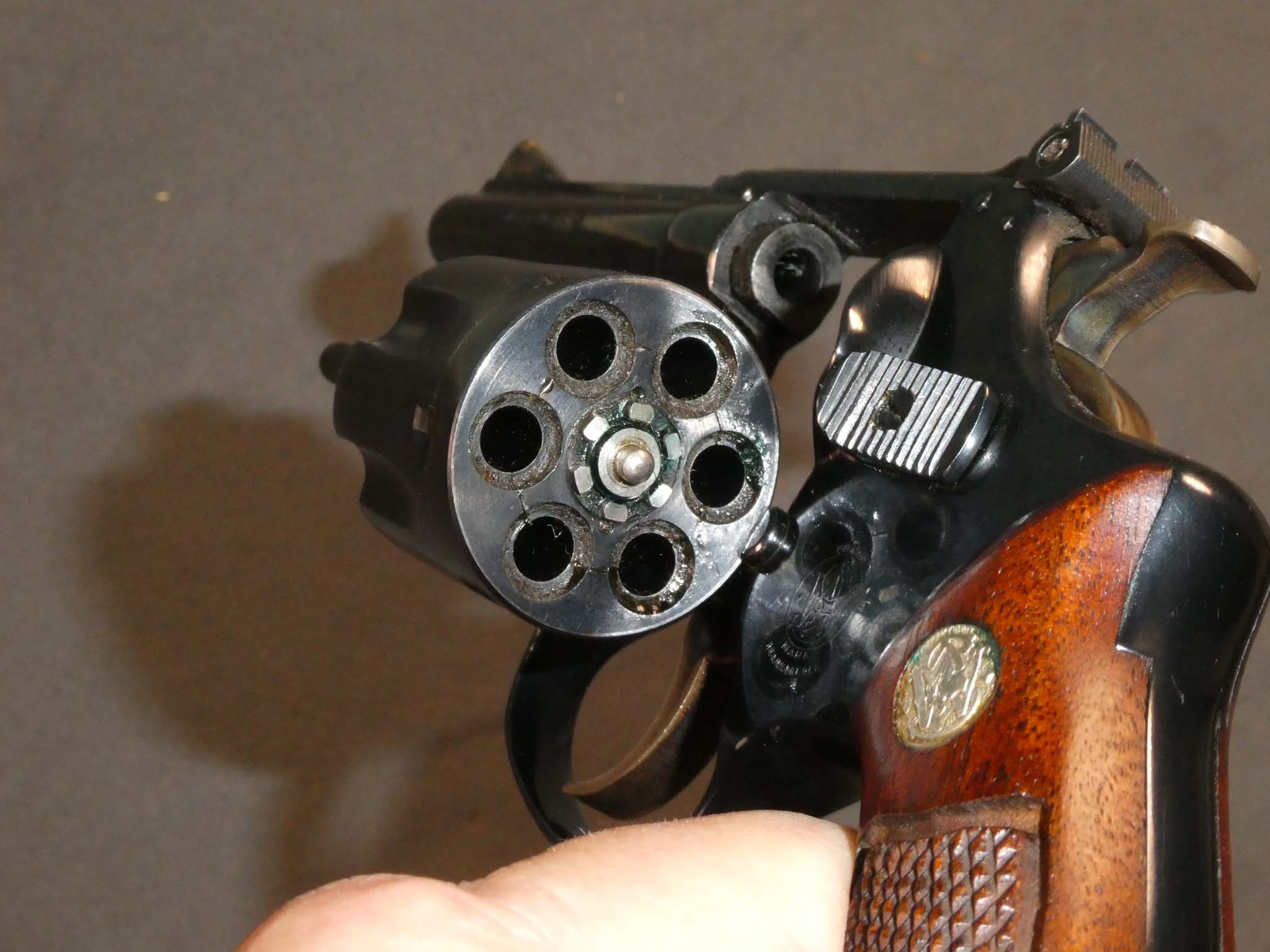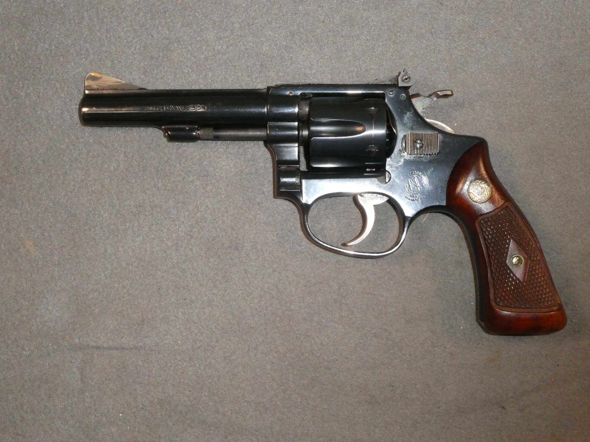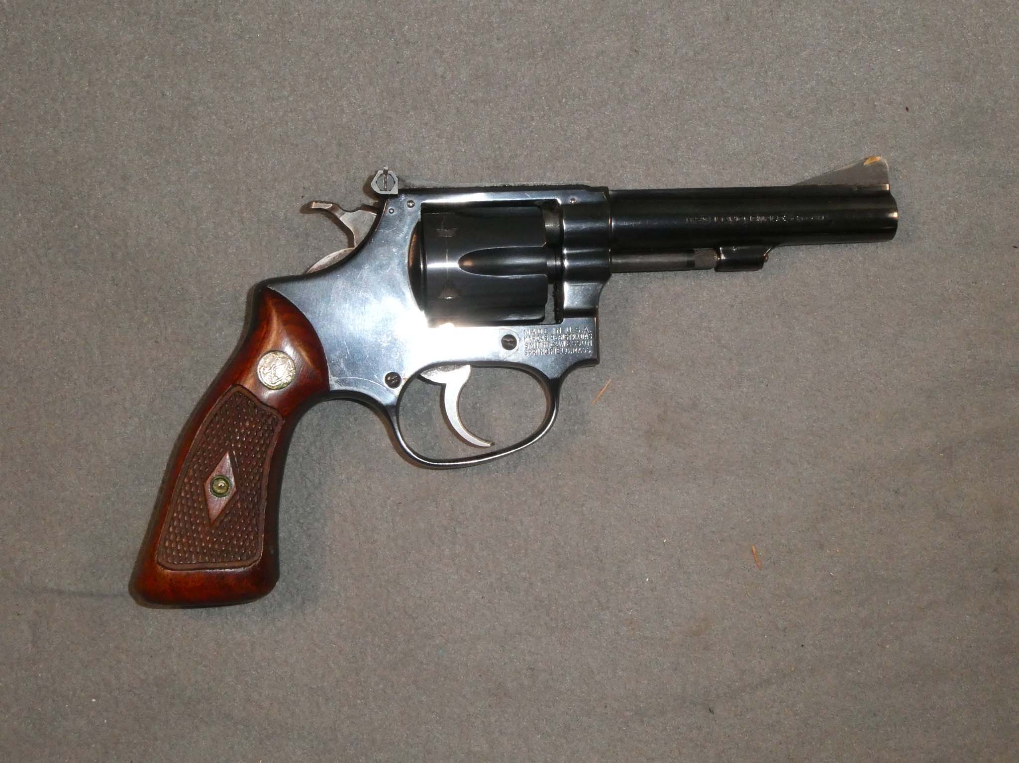 This is a Smith & Wesson Model 34 (No Dash) revolver made about 1957 and chambered for the .223 Long Rifle cartridge. Known as the .22/32 Kit Gun it is a double-action, 6-shot revolver built on the small "J" frame. This one has a 4-inch barrel with an adjustable rear sight. This early example has magna grips with the diamond escutcheons and the early flat cylinder latch. The revolver is in fine condition with about 98% of its factory blued finish remaining. There is a drag line on the cylinder. The only hiccup is that a previous owner dovetailed a small brass insert on the ramp front sight blade. It is very well done, but there is some finish loss on the front blade. The hammer and trigger retain all of their case colors. The bore and mechanics are excellent. The checkered grips are excellent and are numbered to the gun. This is a great early example of the .22 Kit Gun. Stock no. 31926