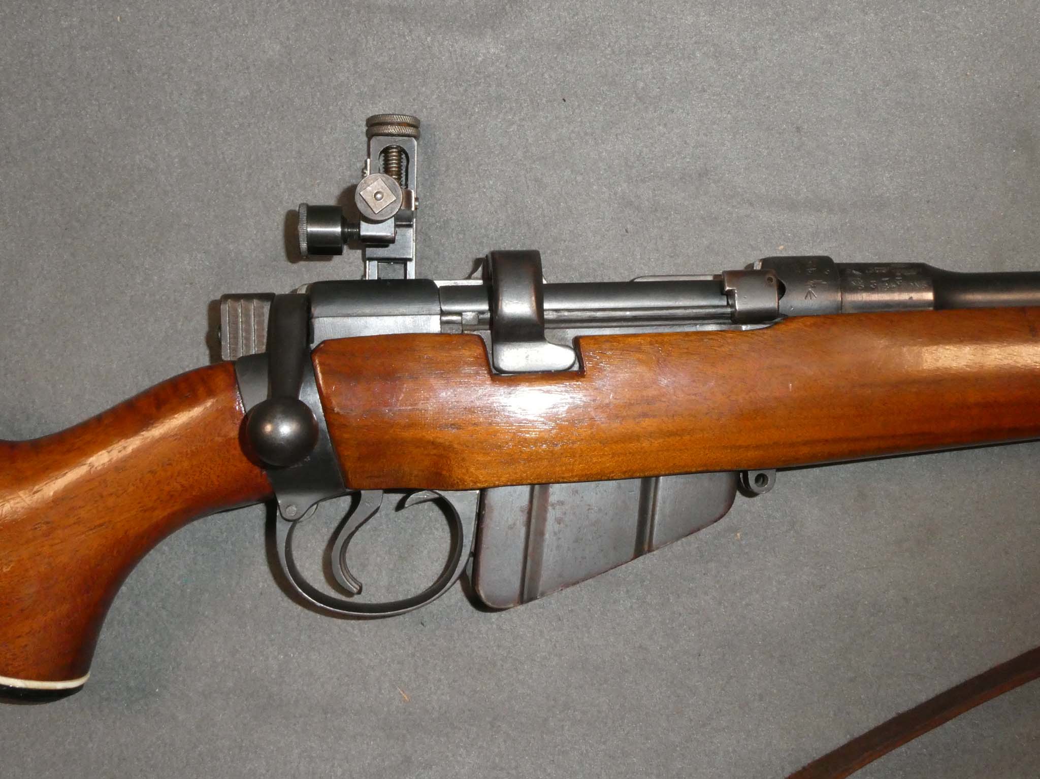 This is an original, WWI, British No.I, Mk.III Short Magazine Lee Enfield Rifle manufactured by Birmingham Small Arms Co. in 1916 and chambered for the .303 British cartridge. It has been rebuilt as a competition rifle with an Australian-made, Central Adjustable rear peep sight. Central was the Australian equivalent of Parker-Hale for the manufacture of target shooting accessories. The rifle also has a modern Monte Carlo style stock. The gun is in fine condition with about 95% of its blued finish remaining. The mechanics are excellent with a matching bolt. The bore is in fine condition with strong rifling. The stock is fine with a few small dings from use. A nice early leather sling is included. This is an interesting example of a target SMLE. Stock no. 31870