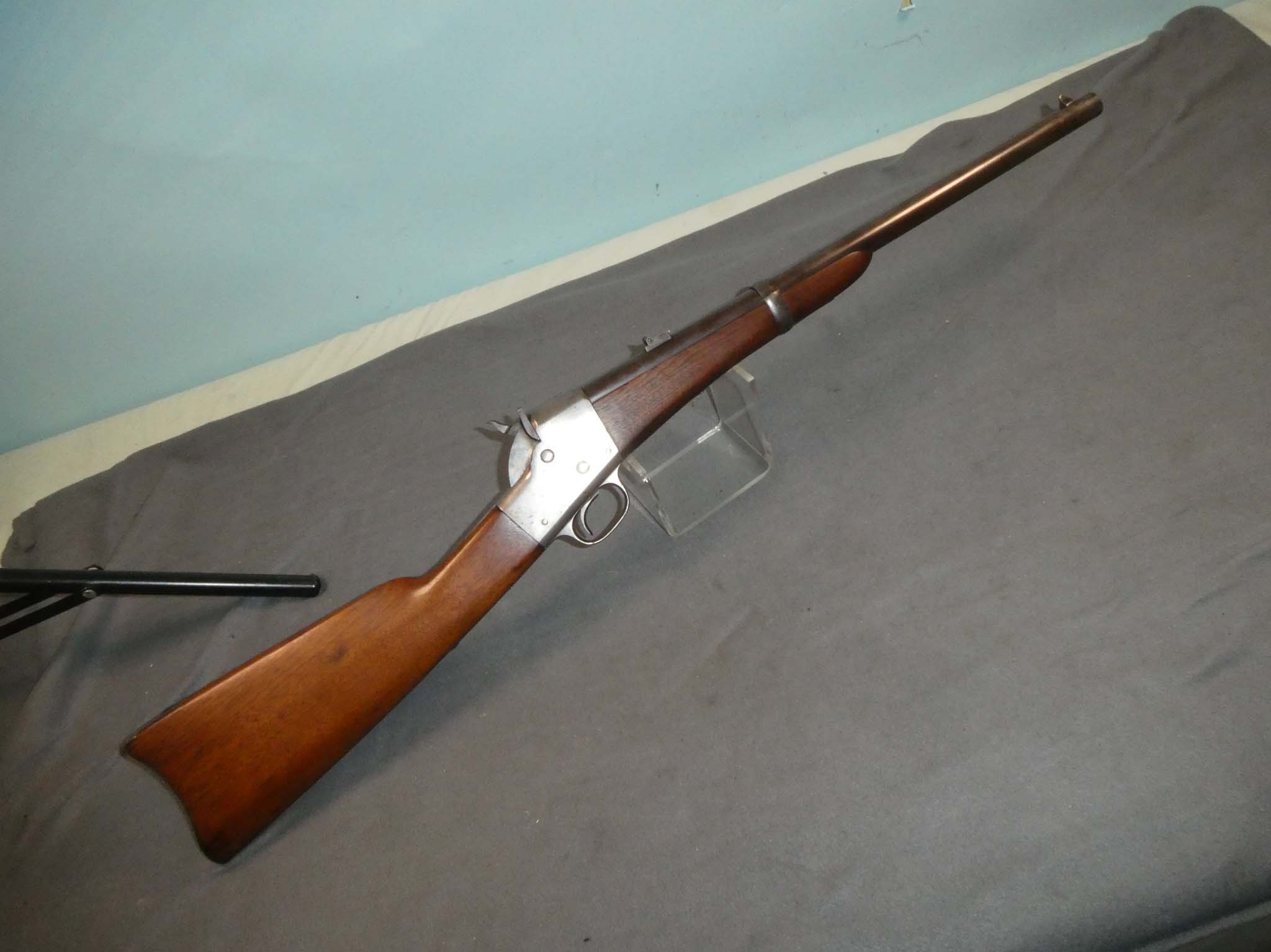 Here is an original Remington Type II "Split Breech" Breech Loading Carbine chambered for the .50 rimfire cartridge. The "Split Breech" Remington was the predecessor of the later "Rolling Block" rifles. It was the first Remington arm chambered for a metallic cartridge, and the last type arm supplied on contract to the Union Army before the war ended. Production of the carbine was sub-contracted to the Savage Revolving Arms Co. of Middletown, Connecticut. About 15,000 of the Type II were produced. Remington bought nearly all of these carbines back from the Government in 1870 and sold them to France for use in the Franco-Prussian War. This carbine is in very good condition. The barrel has a smooth dark brown patina with some blue in protected areas. The receiver and trigger guard have no finish remaining with a steel patina. The butt plate has a Steel patina with some brown speckling. The gun has excellent mechanics and a very fine bore. There are a few tiny specks in the bore, but it is mostly shiny with strong rifling. The stock is very fine with just a tiny ding or two from use. This is a nice example of a scarce Civil War carbine. Stock no. 31156