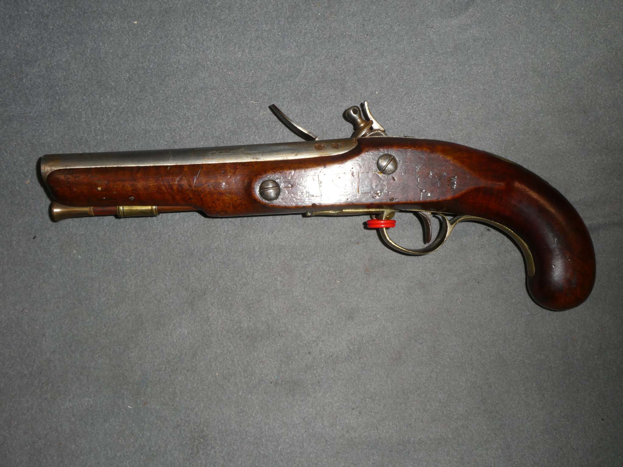 This is an original, British Flintlock Trade pistol made by T. Ketland of London, England dating to the first quarter of the 19th century. This is a medium-sized pistol with a 7-inch barrel. Pistols like this were common trade items in the North American fur trade. This pistol is in fine condition with an overall steel patina. Some brown is developing on the barrel around the breech. There are some dark speckles on the lock. The brass has a nice golden brass patina. The lock will cock and fire, but there is no half cock notch. It is an earlier lock with no roller on the frizzen. The bore is dark with some rust, particularly on the face of the breech plug. Most of the bore is smooth. The stock is very fine with a few dings and scratches from use. There was an old collection number taped to the left flat of the stock and a couple of tape fragments remain. The initials "WP" are stamped on the left flat, as well. The pistol has a thumb piece but no butt cap. This is a very nice example of an English trade pistol. Stock no. 31175
