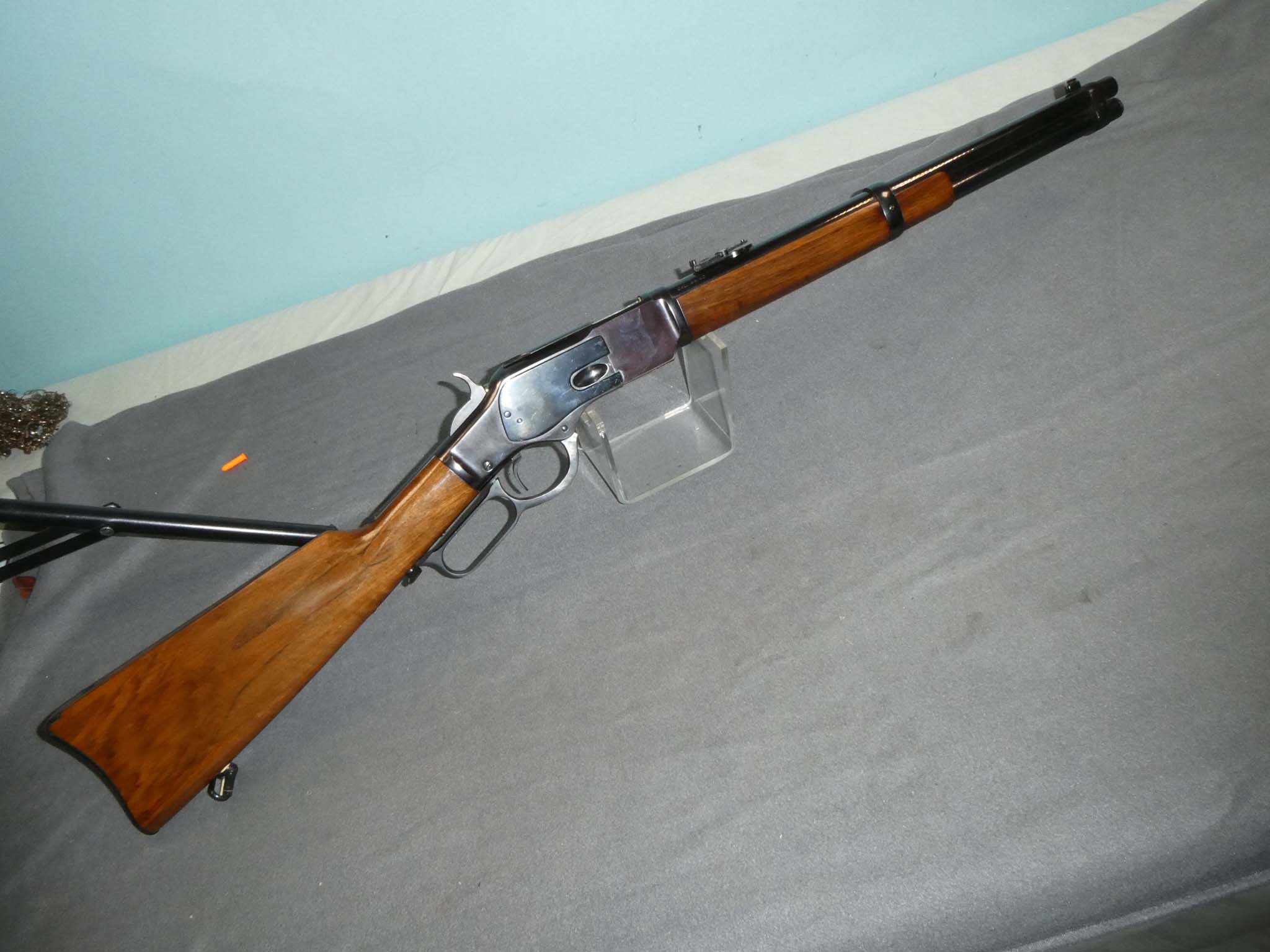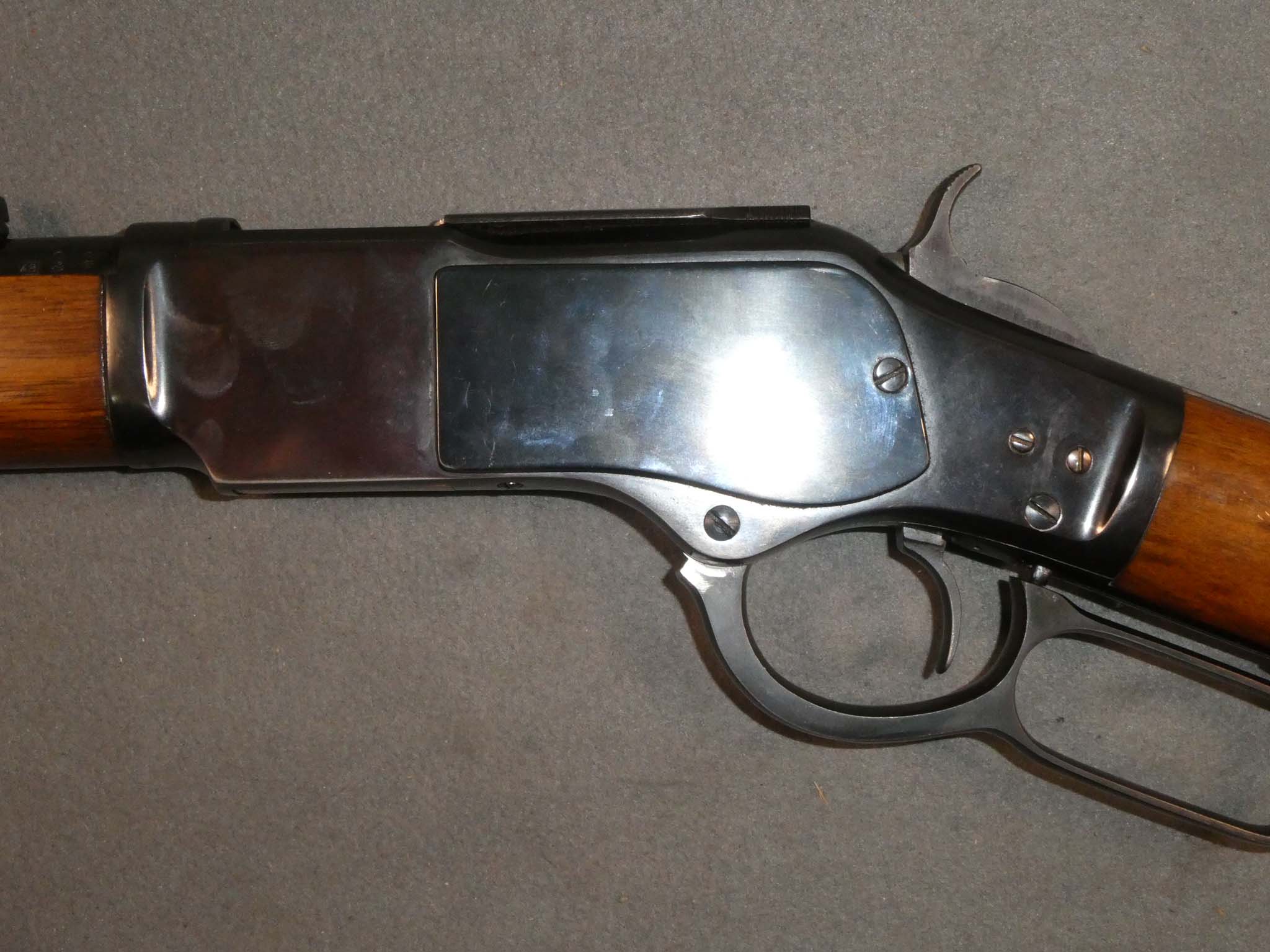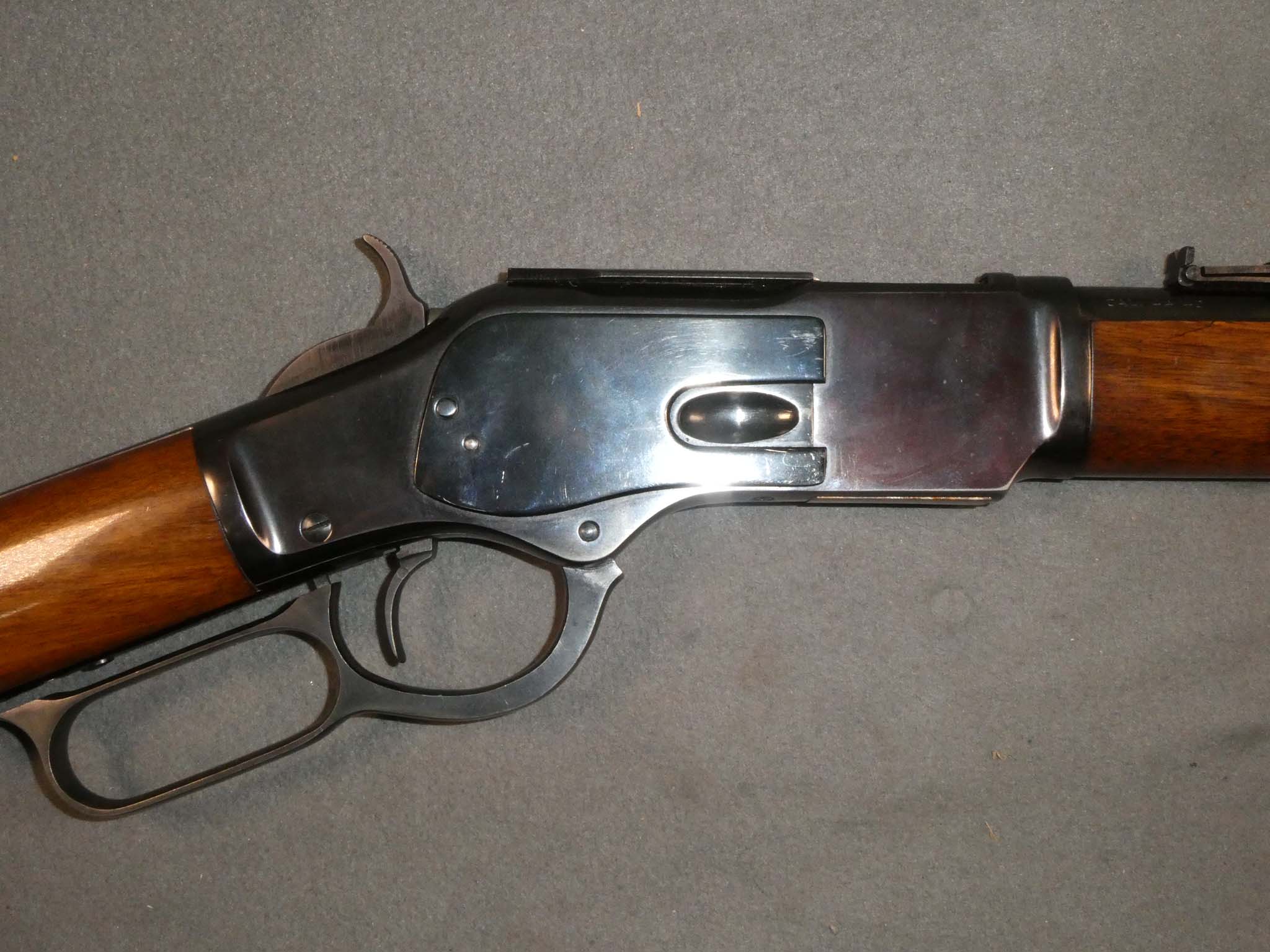 Here is a replica of the famed Winchester Model 1873 Lever Action Carbine manufactured by Aldo Uberti of Italy in 1976 and sold by Navy Arms. The model 1873 was the "Gun That Won the West" and was made in a wide variety of configurations and barrel lengths. This is a Trapper's Model with a 16 1/8" barrel and blued receiver. It is chambered for the .44-40 (.44 WCF) cartridge. This carbine is in fine condition with more than 95% of its factory blued finish remaining. There is light wear on the most exposed edges of the gun. There is some scuffing and scratching on the butt plate. The bore is in very fine condition. The gun works well mechanically, but the dust cover is stiff and sticks in the rearmost position. The stock is in fine condition with a few tiny dings from use. Someone installed a single sling swivel on the bottom of the butt. This is a handy little carbine to have around the camp. Stock no. 32186