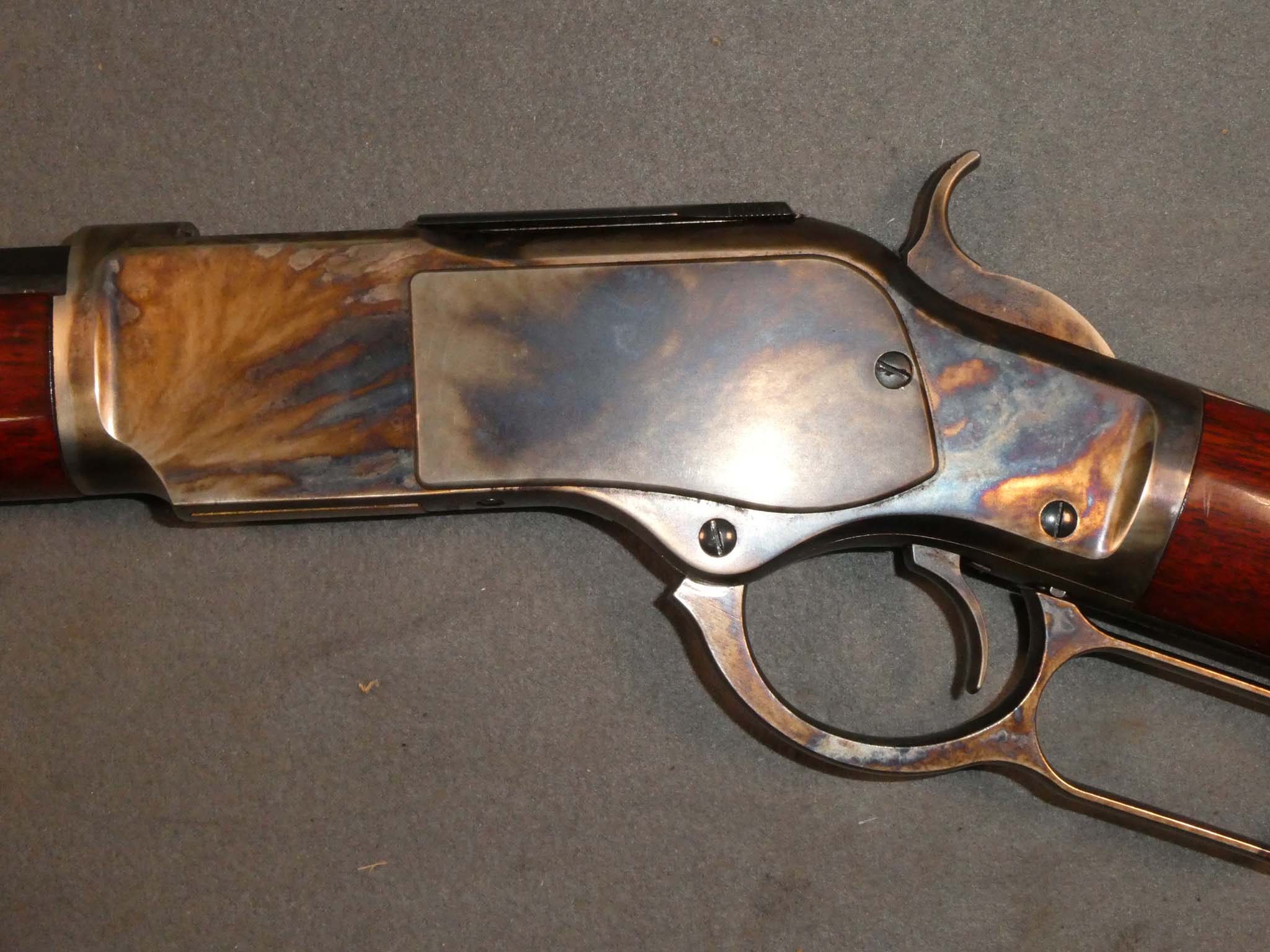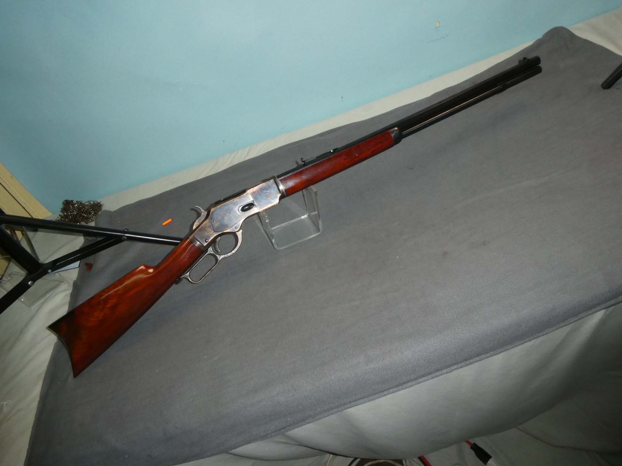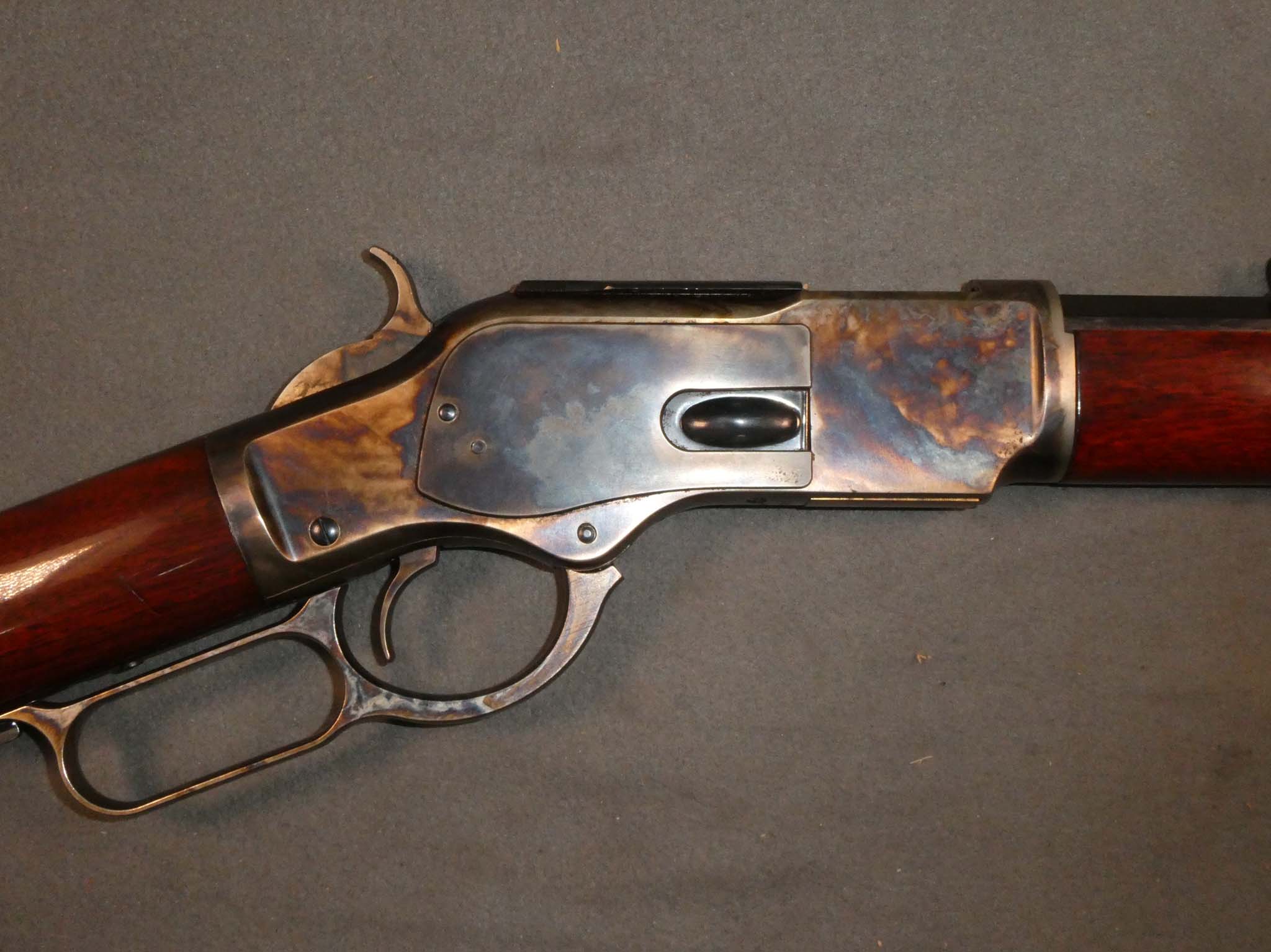 Here is a replica of the famed Winchester Model 1873 Lever Action Rifle manufactured by Aldo Uberti of Italy and sold by Taylor's and Company of Winchester, Virginia. The Model 1873 was the "Gun That Won the West" and was made in a wide variety of configurations and barrel lengths. This is a full-length rifle with a 24" full octagon barrel, case-colored receiver, and crescent butt. It is chambered for the .45 Long Colt cartridge. Externally, this rifle is in very fine to excellent condition with nearly 100% of its factory blued and cased-color finishes remaining. There are a couple of tiny specks on the receiver and some dings on the bottom of the brass lifter. The mechanics are excellent. That brings us to the bore. This rifle was improperly stored with no oil in the bore. There is a significant portion (4-6") of the bore that has rusted and is pitted. I don't know that any amount of scrubbing will help it. It is a shame, because aside from the bore, the rifle does not appear to have been used much at all. The high gloss stock and forearm are in very fine condition with a few small dents and scratches from use or storage. There is very nice figure in the wood of the butt. This is a good-looking '73 Winchester with nice case-color. Clean and oil your firearms! Stock no. 32189