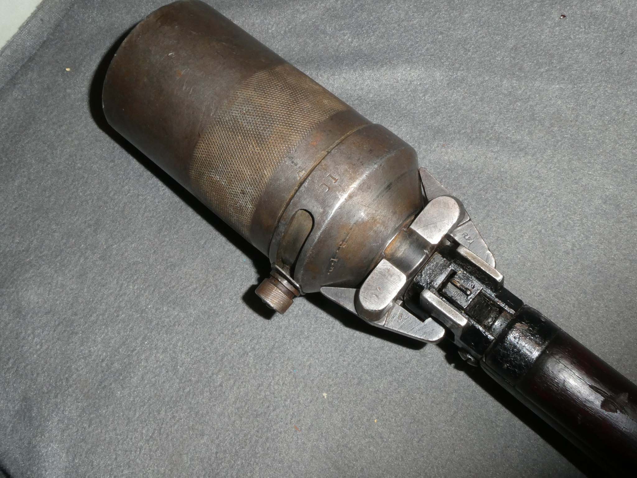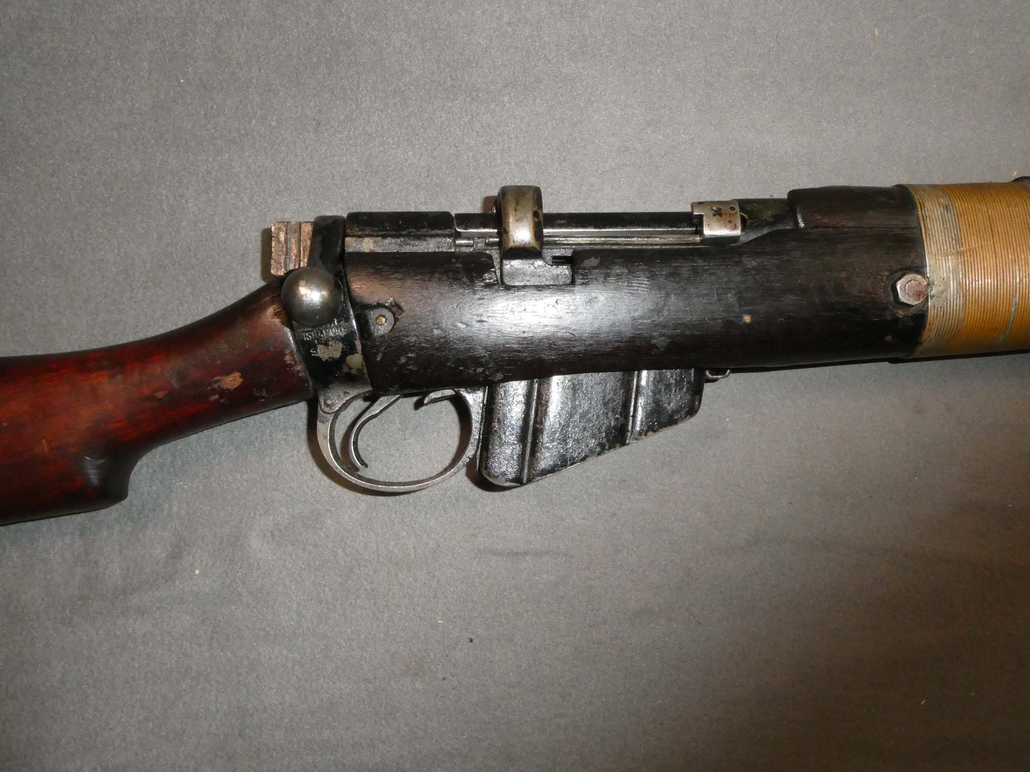 This is a No.I, Mk.III Short Magazine Lee Enfield Rifle manufactured at Rifle Factory Ishapore in India for the United Kingdom in 1940. It is chambered for the British .303 cartridge. This rifle has been arsenal modified for service as a grenade launching platform. This entailed wrapping the stock in two places with wire to reinforce the wood against the recoil of launching a grenade. The launcher is a cup type that mounts on the muzzle. This allowed a Mills Bomb hand grenade with a special round base plate to be fired longer distances than it could be thrown. This rifle is in very good condition with 60-70% of its black, paint-like finish remaining. There is overall finish wear from use. The rifle has excellent mechanics with a matching bolt. There is a fair amount of old grease in the action. The bore is very fine with strong rifling along the barrel's length. The stock is dark and oily with a liberal scattering of dings and scratches from use. The wire wrap remains tight. This is a good example of the grenade launching Mk.III rifle. Stock no. 32160