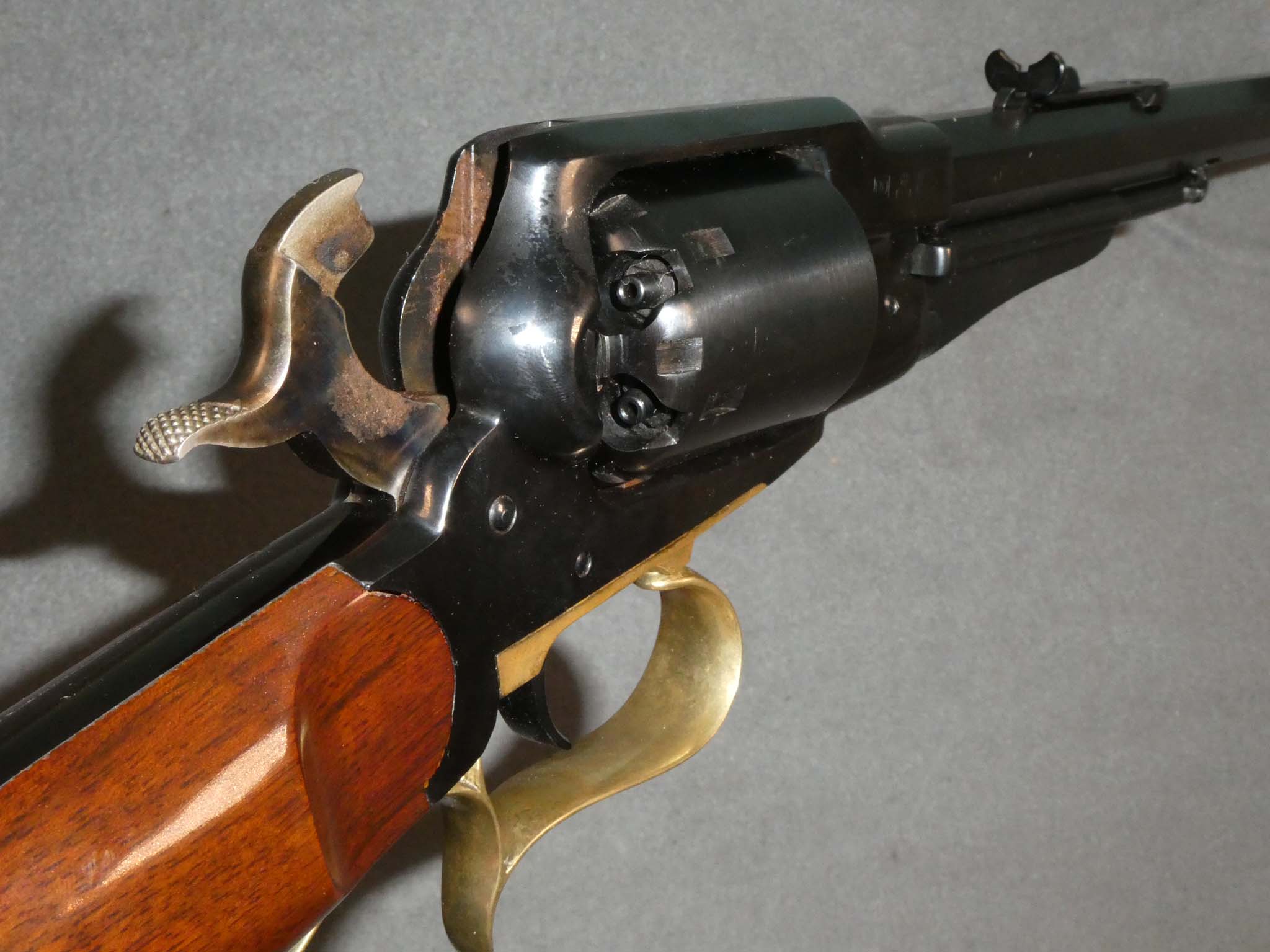 This is a replica of the Remington Model 1858 Revolving Carbine made by Aldo Uberti of Italy in 2004. It is a percussion, 6-shot, revolving carbine based on the Model 1858 Revolver. It is .44 caliber with an 18-inch, full octagon barrel. The straight stock has a crescent butt plate. This little gun is in very fine condition. It retains nearly 100% of its factory blued finish. The brass furniture has a nice golden brass patina. The bore, chambers, and mechanics are excellent. This gun does not appear to have been fired. The gun was not oiled in storage, and a bit of rust has developed on the sides of the hammer that are covered by the frame when the hammer is down. There is a bit of rust in the frame cut for the hammer, also. It looks like it will mostly clean up. The stock is very fine with a few small dings from storage or handling. This is a great, lightweight little carbine. They are a blast to shoot. Just watch your hand placement! Stock no. 32179