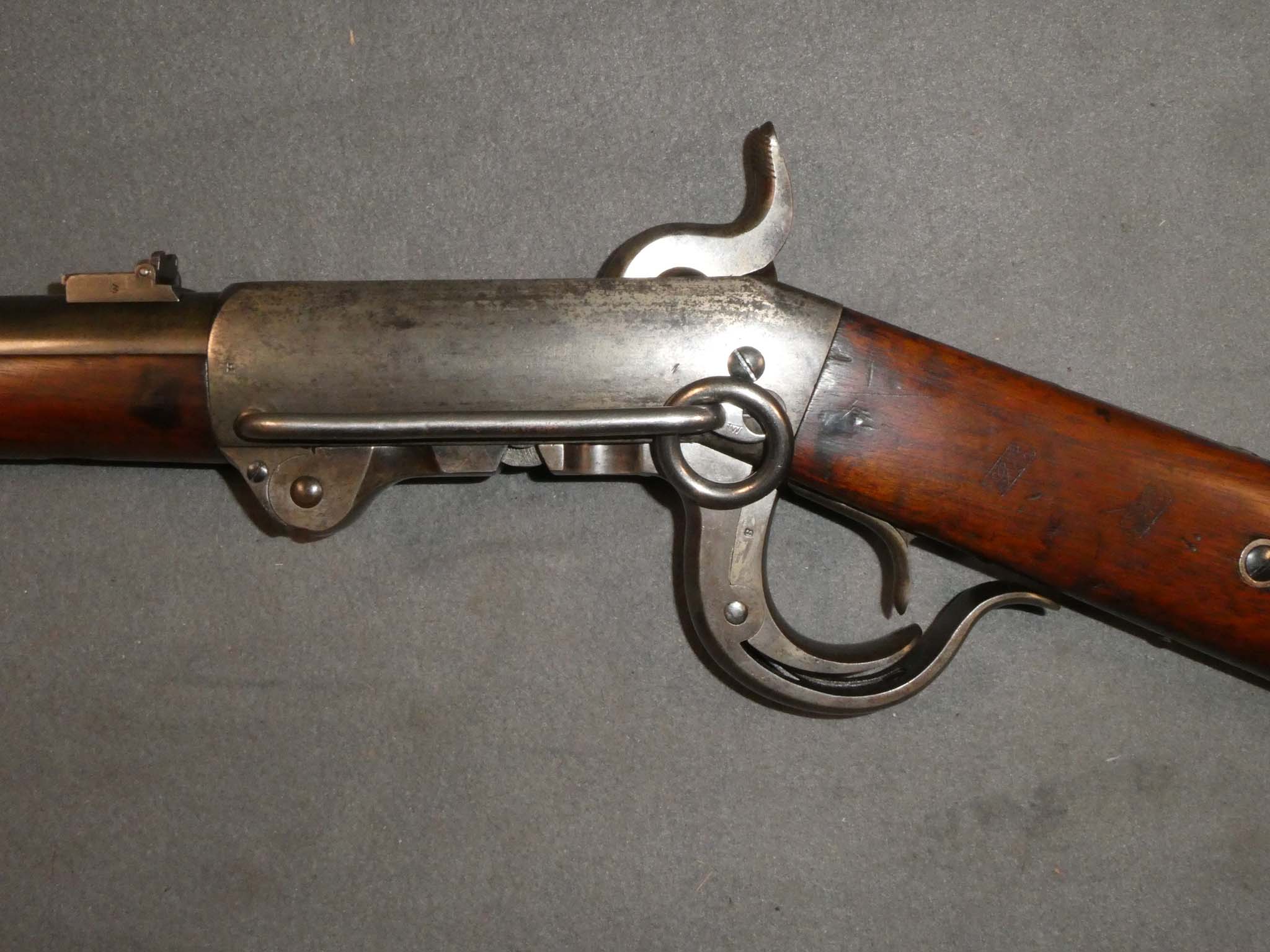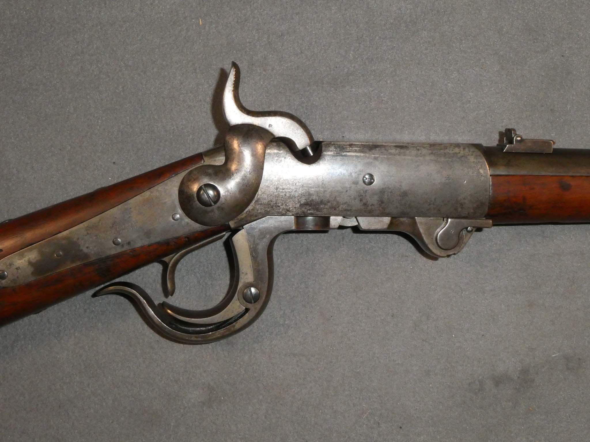 Here is an original, Civil War 5th Model Burnside Cavalry Carbine manufactured by the Burnside Rifle Company of Providence, Rhode Island. This carbine was designed by Union General Ambrose E. Burnside prior to the war. The Burnside was the 3rd most used carbine of the Civil War, behind the Sharps and the Spencer. It was a .54 caliber, lever action, single shot, breech loader that used a tapered metallic cartridge. The 5th Model Burnside was the version produced and issued in the largest numbers, with about 43,000 produced from 1863-1865. Cavalry Regiments known to have used the Burnside were the 1st Michigan, the 3rd Indiana, the 5th, 6th, and 7th Ohio, the 1st New Jersey, the 3rd West Virginia, the 3rd, 14th, and 18th Pennsylvania, and the 2nd, 12th, 14th, and 16th Illinois. This carbine is in very good condition with about 90% of the blued finish remaining on the barrel. The receiver, lever mechanism, and butt have a steel patina with a liberal speckling of brown. The mechanics are excellent. The bore is very fine to excellent, bright and shiny, with strong rifling. The stock is in good condition with a scattering of small dings, scratches, and gouges from use. There are two strong inspector's cartouches on the left side of the wrist. Small initials, "J S W" are carved on the belly of the butt stock. This is a good example of a Civil war Burnside. Stock no. 31500