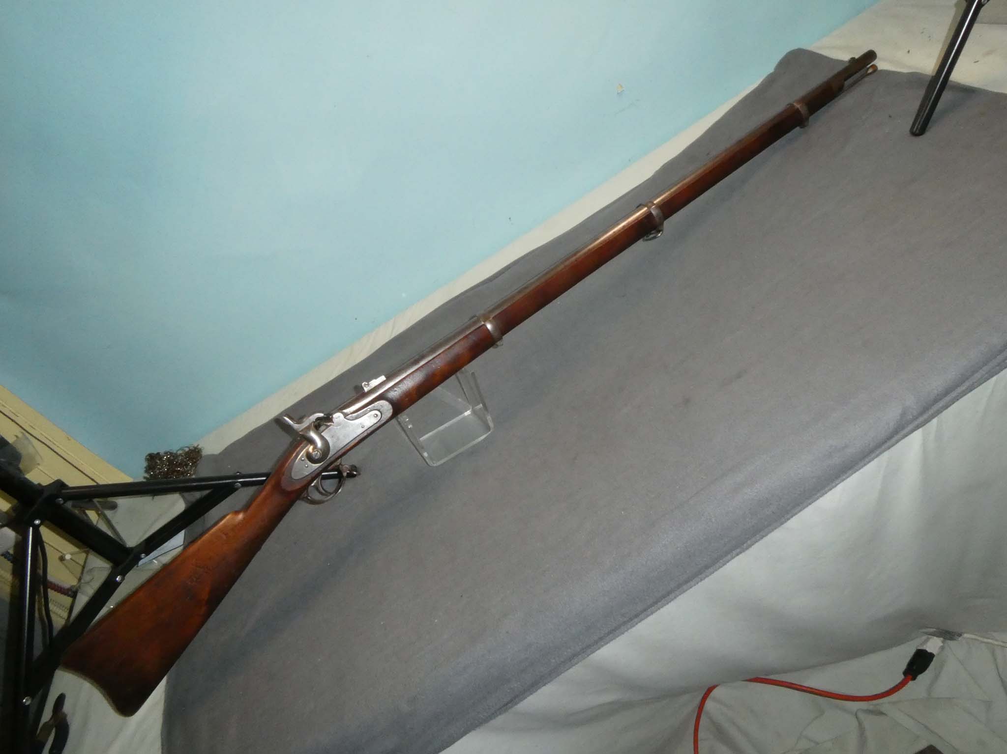 This is a .58 Caliber percussion US Model 1861 "Special" Rifle Musket produced by Lamson, Goodnow, & Yale Company of Windsor, Vermont. Colt's Patent Firearms Manufacturing was the lead design on the M1861 Special Model Rifle Muskets. These Enfield-like pieces were built on Robbins and Lawrence Enfield Machinery and incorporated many of the better features of these British arms. Differences from the standard Model 1861 rifle musket included a wedge shaped, stronger hammer, straight ramrods with stock spoon, and screw bands with no band springs. The clean out screw on the bolster was eliminated. These changes led directly to the improvements incorporated in the M1863 Springfield Rifle Muskets. Along with Colt, these were made by Amoskeag Manufacturing Company and Lamson, Goodnow, & Yale Company. This musket is in very good condition. It has an overall steel gray patina with some mottled brown. There is some light pitting around the bolster. The mechanics are excellent. The bore has some light pitting in places, but the rifling remains strongly visible along the barrel's length. This is one larger pit about 1/3 down the barrel. The stock is very good with a scattering of small dings, dents, and scratches from use. There are two visible inspector's cartouches on the left flat of the stock. The ramrod may be a replica. Stock no. 32128
