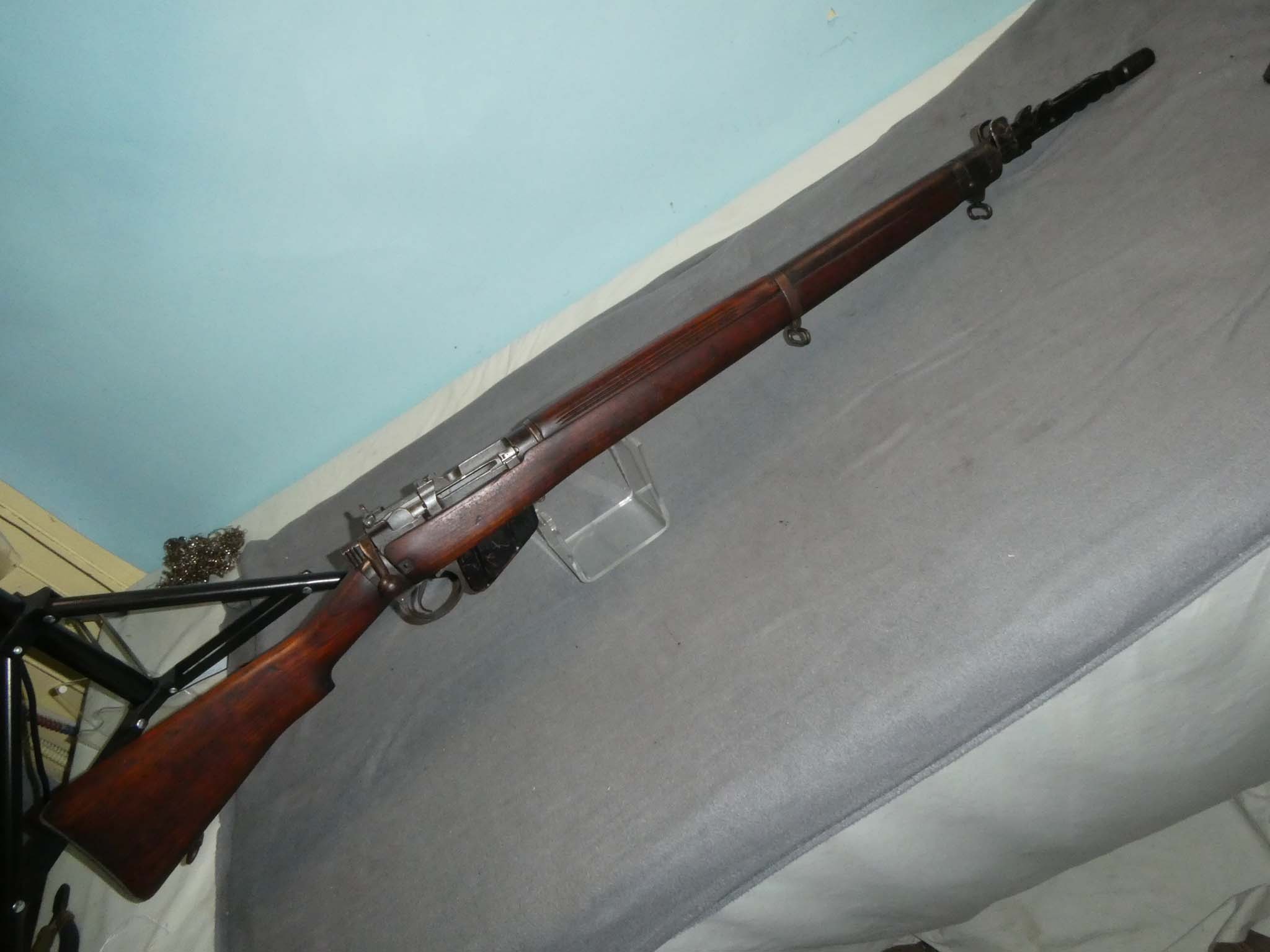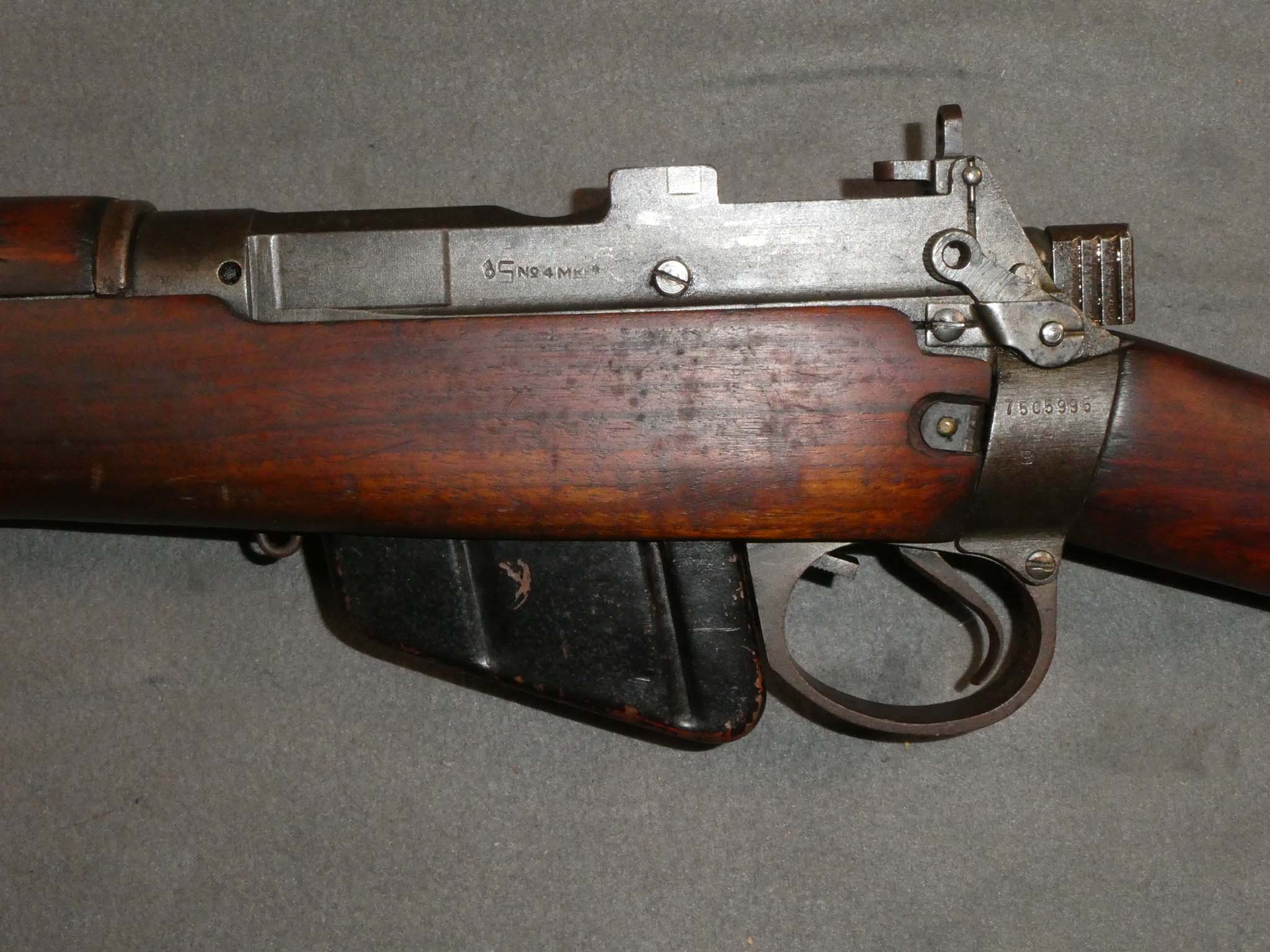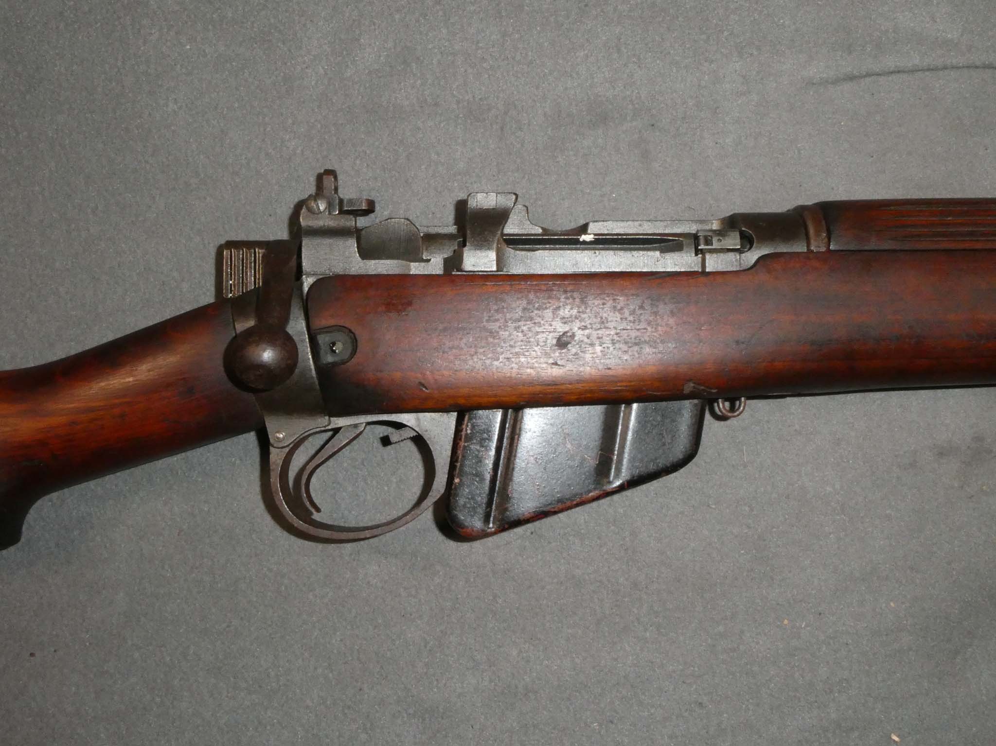 Here is an original, WWII British No.4, Mk.I* Short Magazine Lee Enfield Rifle manufactured by Savage Arms in America. Marked "U.S. Property", this is one of the rifles shipped to England under the Lend Lease Program. The No.4, Mk.I was the standard British battle rifle of the Second World War. The Mk.I* had a simplified rear sight. Included is an original grenade launcher. This rifle is in fine condition with about 80% of its factory phosphate finish. The gun has light overall finish wear. There is heavier finish wear on the edges of the magazine. The rifle has excellent mechanics with a matching bolt. The bore is good. There was some very fine pitting that has left a frosted texture behind, but the rifling remains strong along the bore's length. The stock is in fine condition with a few small dings and scratches from use. The detachable grenade launcher is in very fine condition. This is a nice example of a Savage No.4 SMLE. Stock no. 32196