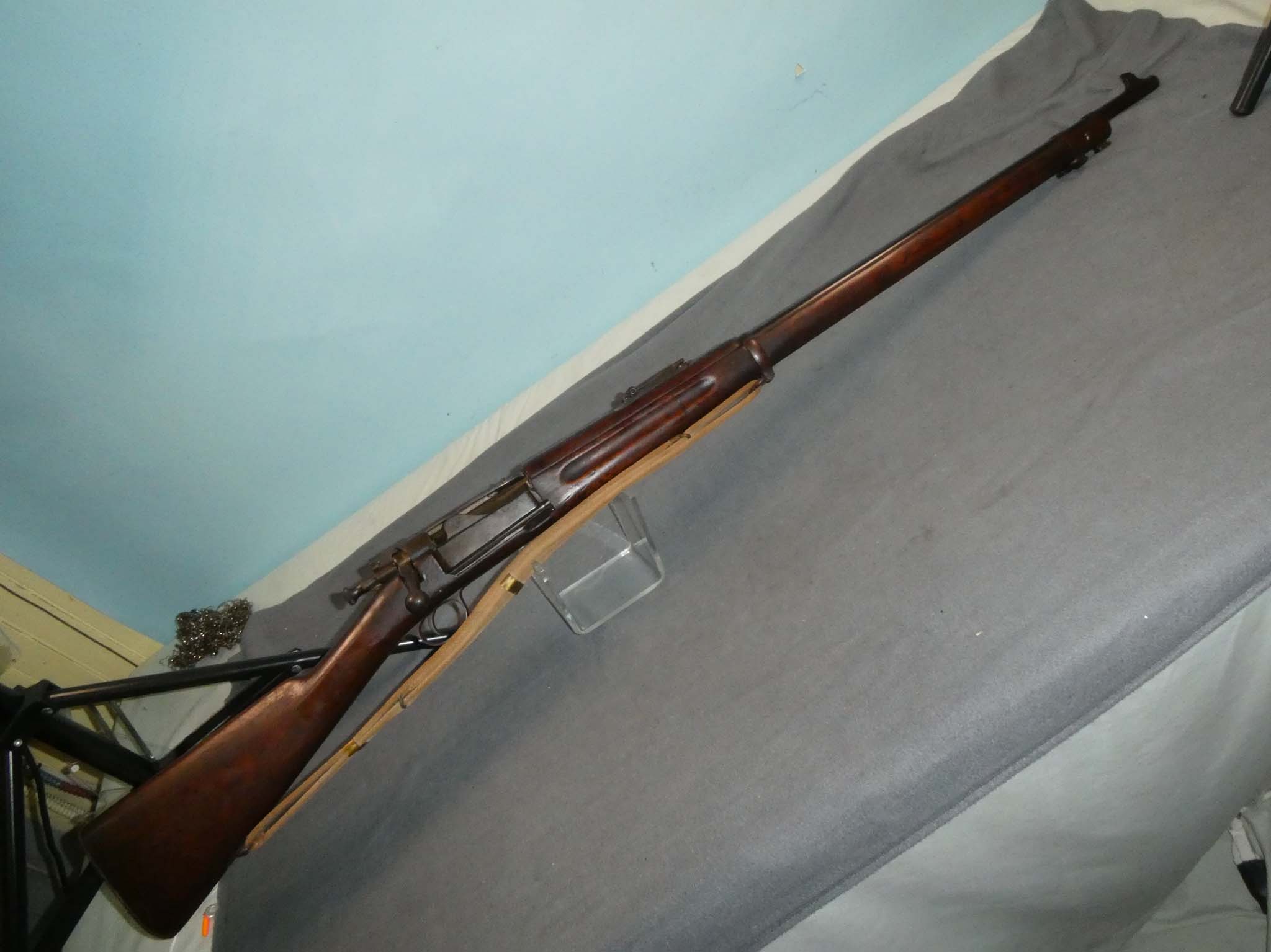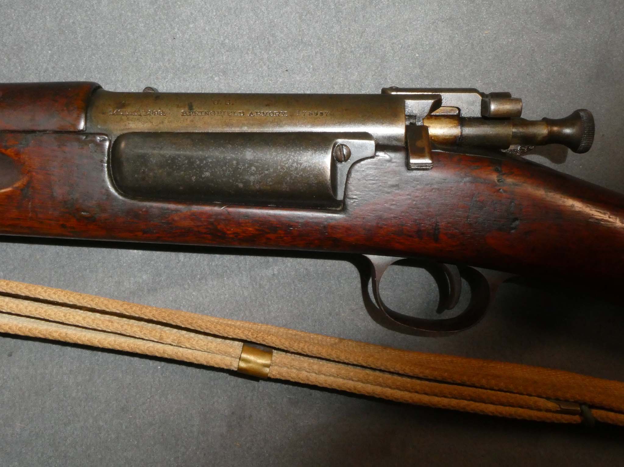 This is an original, U.S. Springfield Model 1898 Krag-Jorgensen Rifle manufactured in 1899 and chambered for the .30-40 Government cartridge. Approximately 330,000 were made between 1898 and 1903. The M1898 Krag had the shortest service life of any U.S. arm, replaced by the M1903 Rifle just 5 years after production began. The Krag was the first U.S. Rifle to fire smokeless ammunition. This rifle is in very good condition. It retains about 30% of its factory blued finish, most of which is on the barrel. The rifle has some overall light rust speckling. The oil quenched receiver has partially faded from a dark gray to a steel and brown patina. There is finish loss and some brown developing on the magazine cover. The bolt handle has some rust spotting. The nose cap and barrel band have a mostly smooth, dark brown patina. There is significant rusting on the butt plate that has left a rough dark brown patina. The rifle works very well mechanically. The bore is fair to good. There was some old pitting that has been cleaned up, and the rifling is now strongly visible along the barrel's length. The stock is in fine condition with a few small dings and scratches from use. There is a visible inspector's cartouche on the left wrist of the stock. It is hard to make out the date, but I believe that it is 1899. Someone also carved a diamond shaped depression on the left side of the butt with the initials "S M" in the center. It looks like it has been there a long time. Also included is an original Mills Patent Tropical Web Sling in very good condition. There is some overall soiling of the web material and a tiny bit of light fraying at the sling swivels. This is a nice old Krag that hasn't been touched in a long time. Stock no. 32203
