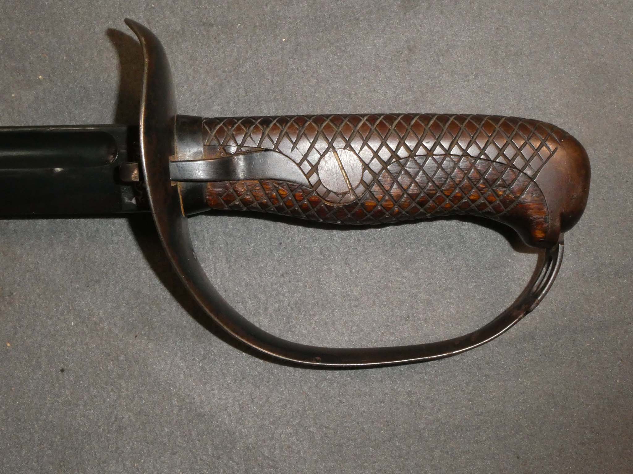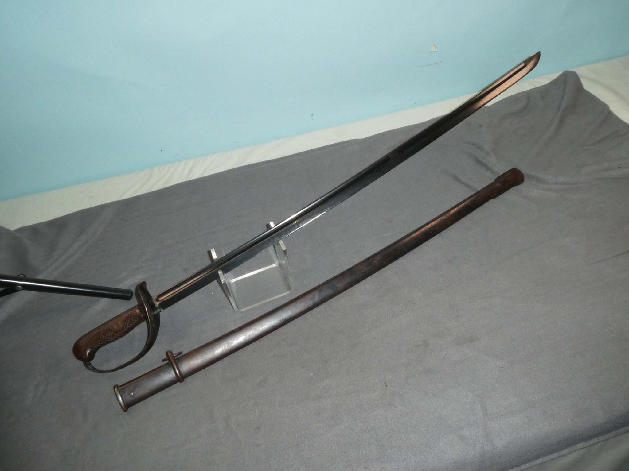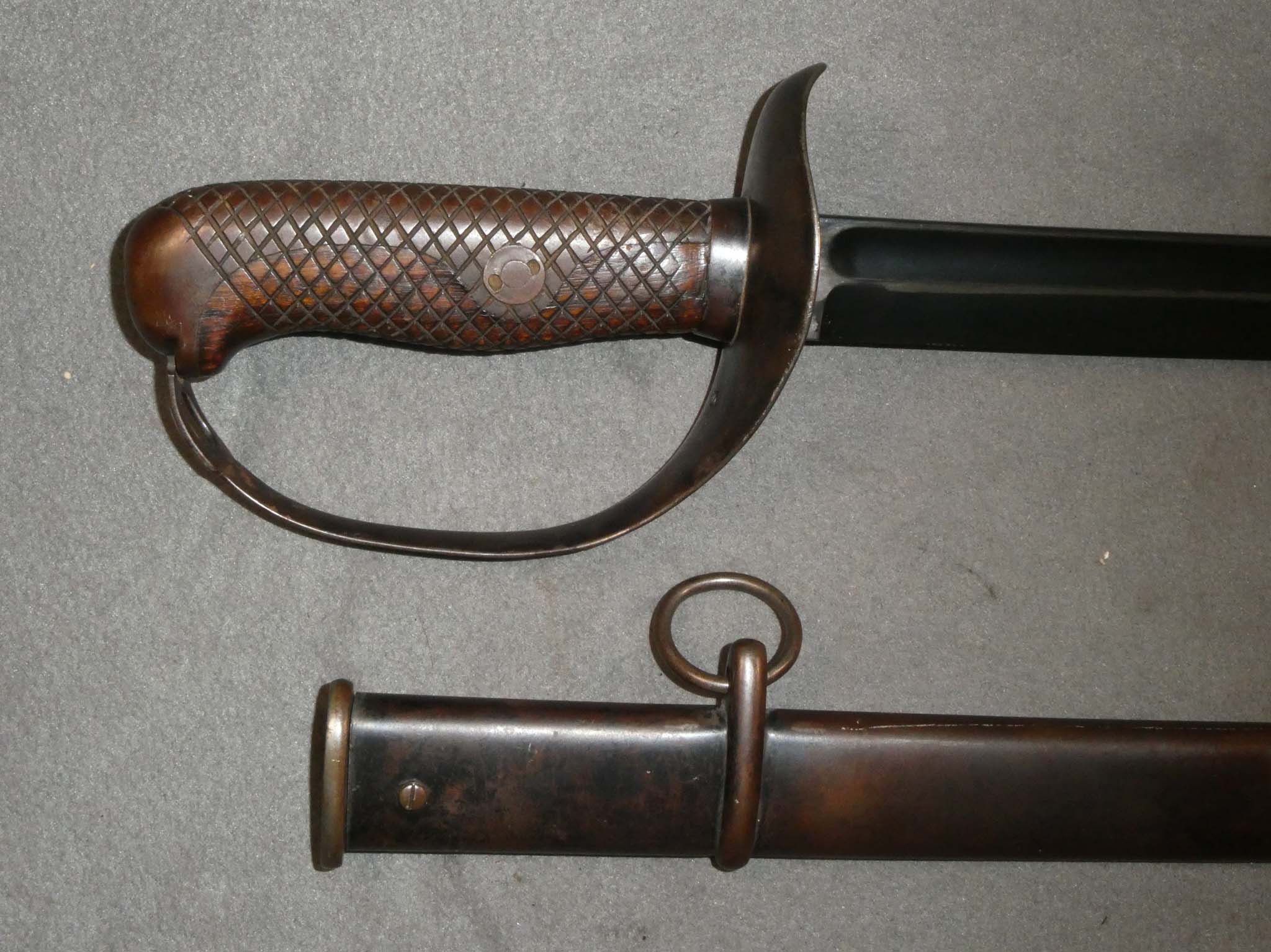 This is a Japanese Type 32 Cavalry Saber with its original matching scabbard. Also known as the Model 1899, it continued in japanese service until the end of WWII. It was produced in several blade lengths. The "Ko" version had a longer 32.5-inch blade and a leather finger loop to aid in retention while in the saddle. The "Otsu" variant had a shorter 30-inch blade and was intended for use by NCO's in other branches of the military such as the Infantry. There are existing examples with 26-inch blades leading some folks to call these Type 26 swords. This is an Otsu with the 30-inch blade. It is in very fine condition with more than 95% of its factory blued finish remaining on the blade. There is just a little friction rubbing from the scabbard. The hilt has about 60% of the blue remaining with the remainder having turned a smooth brown. The wooden part of the grip is in very fine condition. The scabbard has about 60% of its blued finish remaining with the remainder a brown patina. There are a couple of dents on the back side near the drag. This was often done deliberately to keep the sword from rattling. The drag is stamped with the same number as the sword. This is a very nice example of the Japanese Type 32 Saber. Stock no. 32136