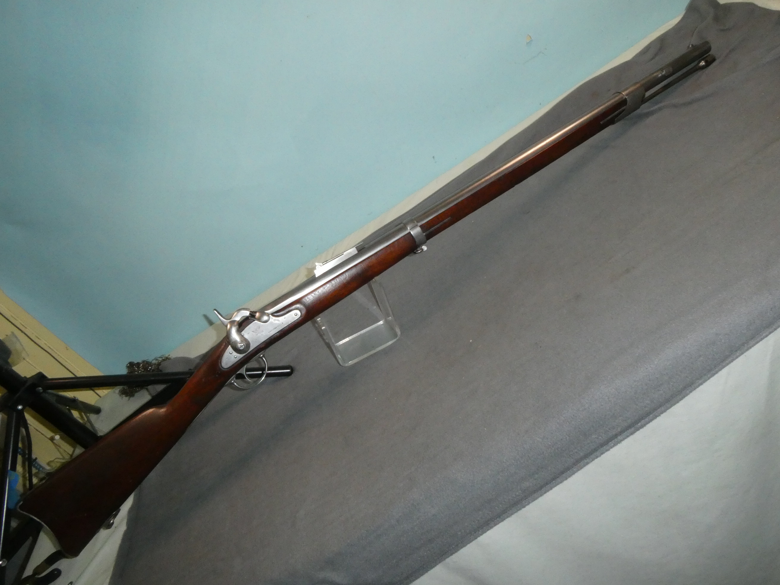 This is an original, Civil War Model 1861 U.S. Navy Percussion Rifle manufactured by Eli Whitney of New Haven, Connecticut in 1864. Known as the "Plymouth" Rifle, the gun was conceived by Captain John A. Dahlgren, a well known ordnance officer in the U.S. Navy. The prototype rifles were assembled at the Washington navy Yard and taken aboard the U.S.S. Plymouth for testing. Hence the name. Whitney was awarded a contract for 10,000 guns in July of 1861. The contract was completed in 1864. The Plymouth Rifle was a .69 caliber muzzleloader with a 34" round barrel fastened with two bands. The barrel has three groove rifling. The trigger guard has a spur finger grip behind the guard bow. It used a unique long range leaf rear sight graduated to 1000 yards. There is a large bayonet lug on the right side of the barrel for the saber bayonet. This is a later gun, probably assembled at the end of the contract. It does not have the spur on the trigger guard and the bayonet number is stamped on the lug rather than the barrel tang. It is in fine condition with all the metal parts remaining armory bright. There are a few fine dark speckles of patina overall and a small spot of fine pitting on the lock plate. The mechanics are excellent. The bore is good. There is some fine pitting, but the rifling is strongly visible along the bore's length. The walnut stock is in fine condition with a scattering of small dings and scratches from use. There are some old letters scratched on the right side of the butt. This is a very nice example of a Plymouth Rifle. Stock no. 32307