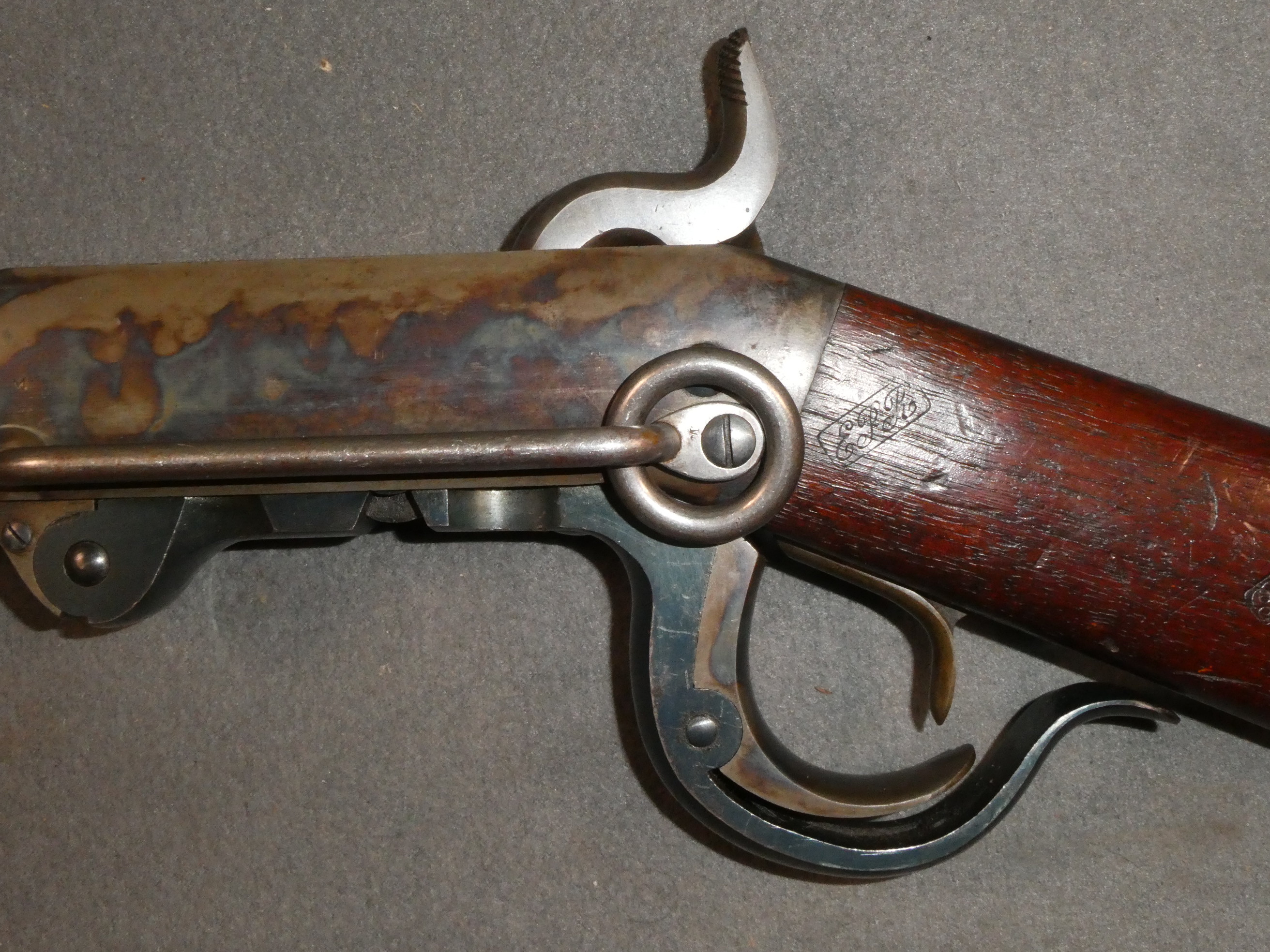 Here is an original, Civil War 5th Model Burnside Cavalry Carbine manufactured by the Burnside Rifle Company of Providence, Rhode Island. This carbine was designed by Union General Ambrose E. Burnside prior to the war. The Burnside was the 3rd most used carbine of the Civil War, behind the Sharps and the Spencer. It was a .54 caliber, lever action, single shot, breech loader that used a tapered metallic cartridge. The 5th Model Burnside was the version produced and issued in he largest numbers, with about 43,000 produced from 1863-1865. Cavalry Regiments known to have used the Burnside were the 1st Michigan, the 3rd Indiana, the 5th, 6th, and 7th Ohio, the 1st New Jersey, the 3rd West Virginia, the 3rd, 14th, and 18th Pennsylvania, and the 2nd, 12th, 14th, and 16th Illinois. This carbine is in antique excellent condition, one of the finest I have seen in years. It retains about 95% of its factory blued and cased color finishes. There are a few tiny scratches in the finish and a small mottled area on the blued barrel. There are some tiny specks of patina overall. The case colors have faded a bit on the lock plate. The bore and mechanics are excellent. The stock is very fine with some small dings and dents from storage. There are two crisp inspector's cartouches on the left side of the wrist. This is an outstanding example of a 5th model Burnside Carbine, one of the true work horses of the Civil War. Stock no. 32255