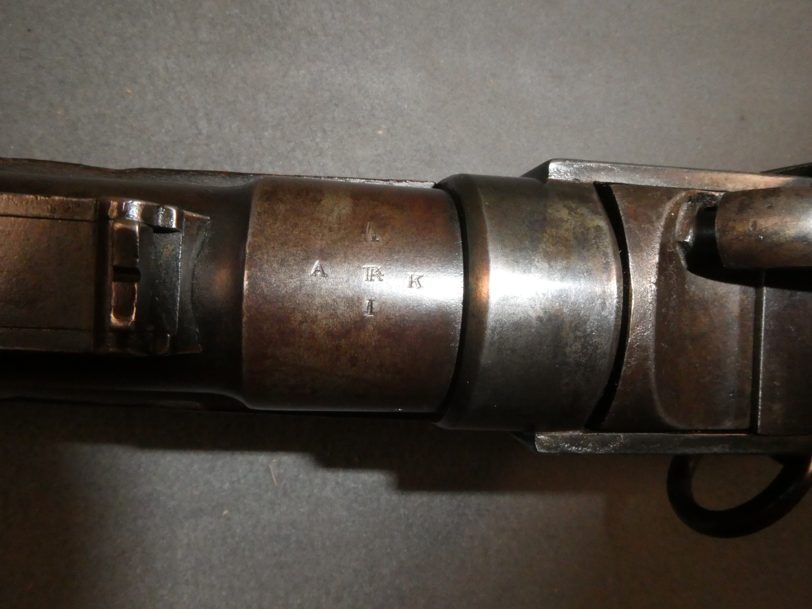 Here is an original, Civil War, Starr Percussion Cavalry Carbine manufactured by the Starr Arms Company of Yonkers, New York. Similar to the Sharps Carbine in appearance and function, the Starr was a .54 caliber, single shot breech loader. 20,601 were produced between 1862 and 1865. In government tests, the Starr was actually rated as better than the Sharps. Mostly issued in the western theatre, the Starr is known to have been used by the 1st Arkansas, 5th Kansas, 11th Missouri, and the 24th New York. The 1st Arkansas is the only unit known to have officially marked their carbines. They are quite scarce and desirable. This is one of those carbines. It is hand stamped with single letter dies on the top of the frame over the breech with the three line marking "1"/"ARK"/"I". This indicates "I" Company of the 1st Arkansas. This carbine is in very fine condition. About 50% of the factory blued finish remains on the barrel with the remainder having turned a smooth brown. The lever has about 40% of its blue remaining. The lock and frame have about 80% of their factory cased color remaining. The brass butt plate and the barrel band have a golden brass patina. The mechanics are excellent. The bore is for the most part excellent, but there are two rings of light pitting visible about 6" from the muzzle. The stock is in fine condition with some small dings and scratches from use. There is an old, smoothed chip on the left side of the top tang. Arkansawyers! Bring this carbine home! Stock no. 32249