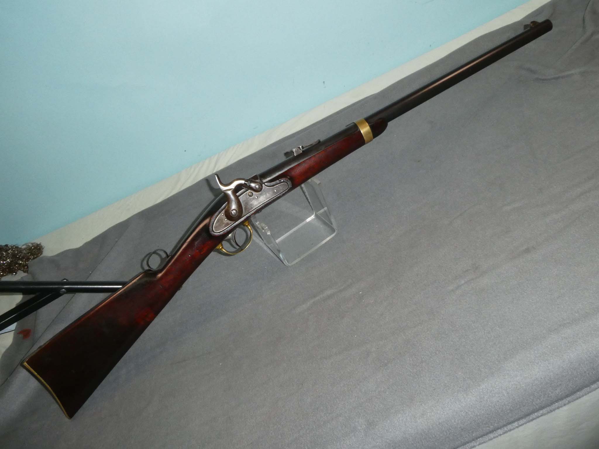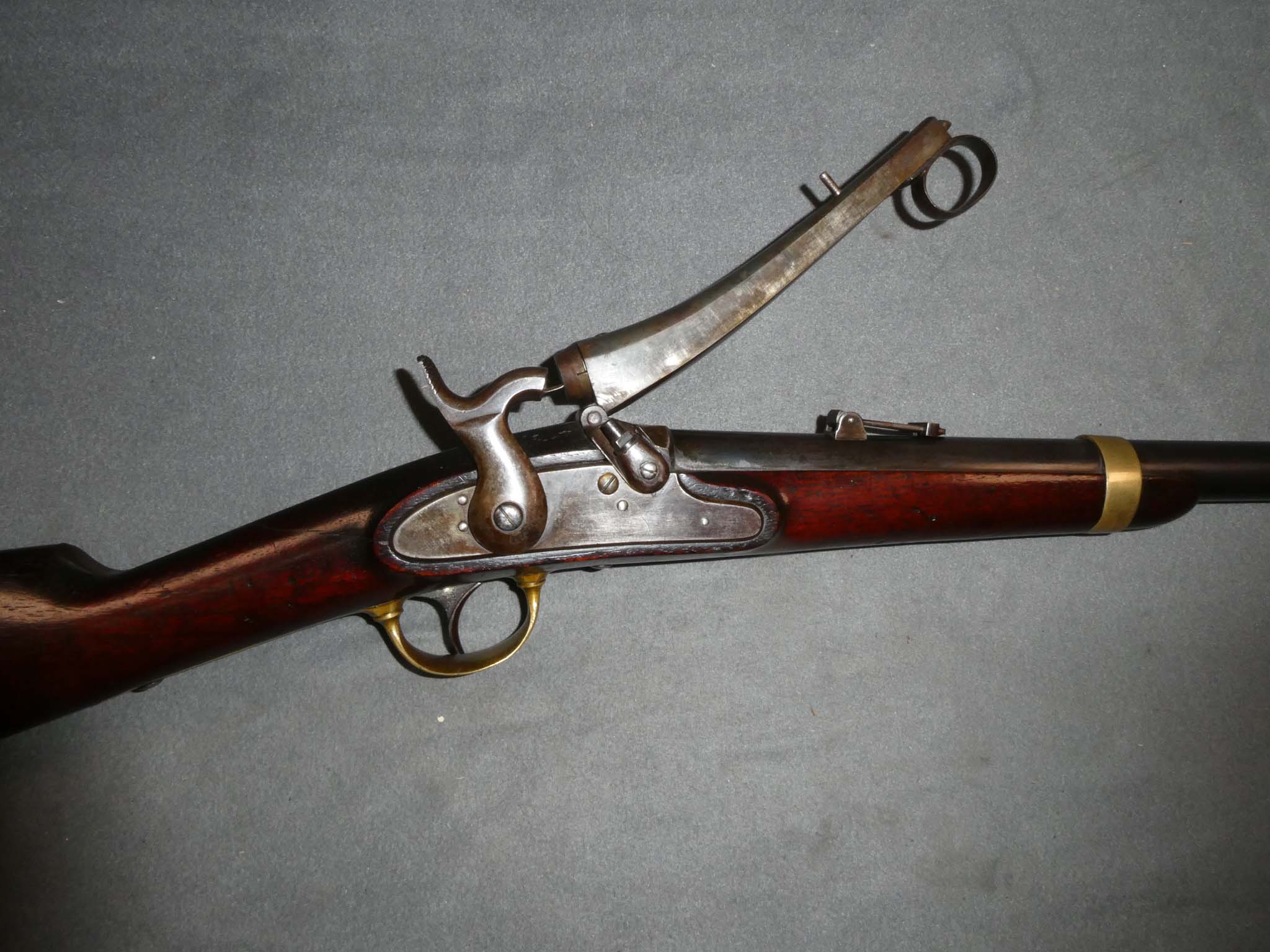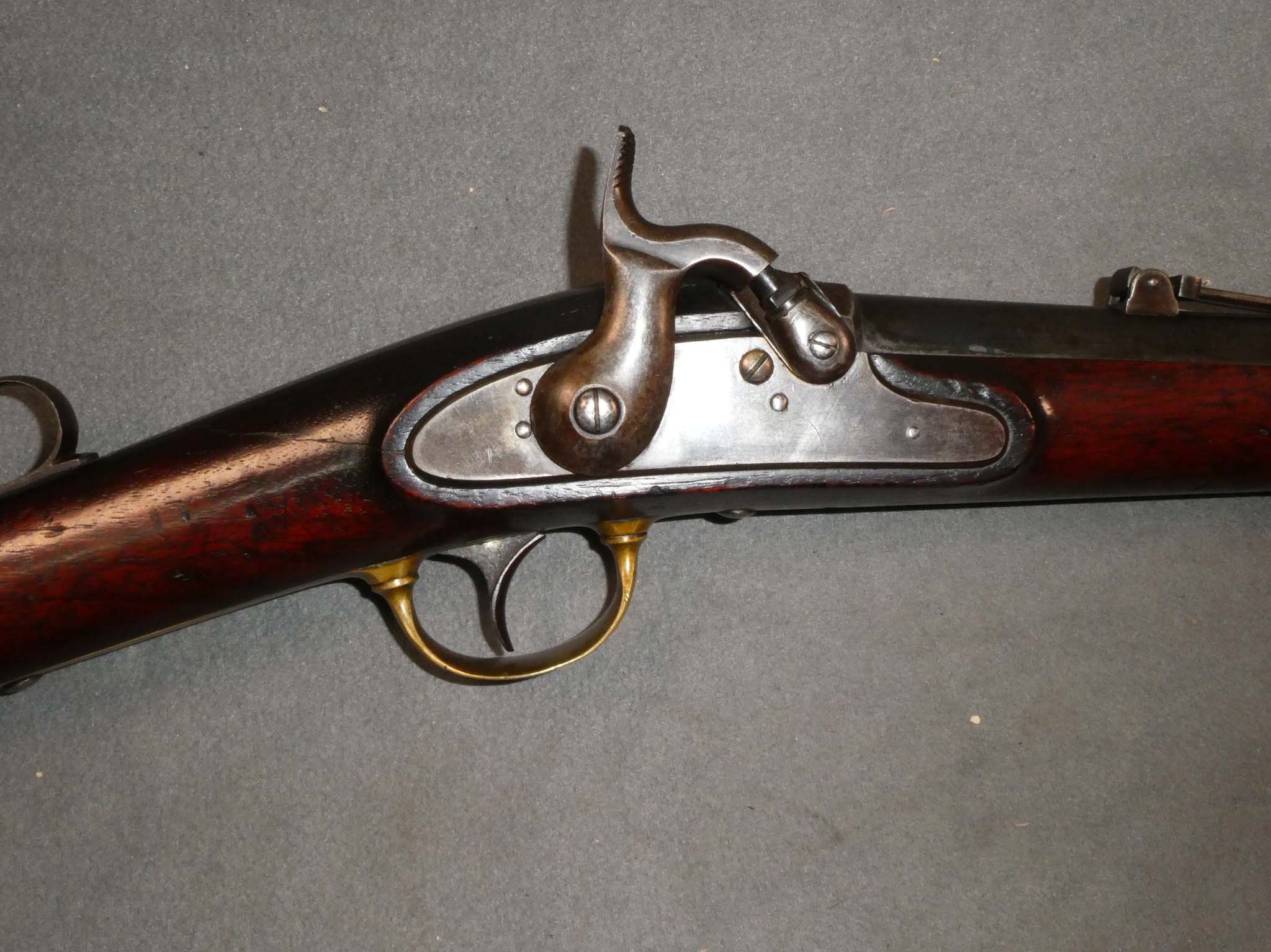 This is an original, Joslyn Model 1855 Cavalry Carbine manufactured by A.H. Waters & Co. of Milbury, Massachusetts. It is a .54 caliber, percussion breechloader with a 22-1/2" round barrel. The action was opened with a lever that is recessed into the top of the wrist of the stock. This lever gave rise to the nickname "Monkey Tail Carbine". The Model 1855 the first breech loading carbine patented by B.F. Joslyn. They were also the last firearms ever produced by A.H. Waters. Made in 1855 and 1856, they were already in service at the beginning of the war. Early Civil War usage included the 2nd, 3rd, 4th, and 6th Ohio Cavalry. Under 1,500 of these carbines were produced, making them quite scarce. This carbine is in fine condition. The barrel retains about 90% of its original factory blued finish. There are a few specks and some lightening of the finish near the breech. The lock, breech, and breech lever were case colored. Externally, this has faded to a mottled gray brown. On the protected inner part of the lever, the color is still strong. The brass mountings have a nice yellow brass patina. The bore and mechanics are excellent. The stock is very fine except for a hairline crack in the wrist running from the back of the lock plate up to the lever channel. This was a problem common to the type. The number of components inlet into the wrist area left very little wood and cracking in the wrist occurred frequently. This one is not bad at all. Curiously, this Joslyn has no markings other than the serial number on the lever. It never had the maker's markings, and this phenomenon has been observed on several other '55 Joslyn carbines. There is conjecture that these unmarked carbines might have been for the U.S. Navy, but more research will have to be done. This is a very nice example of a rare carbine. Thanks to Tim Prince of College Hill Arsenal for this information! Stock no. 32259