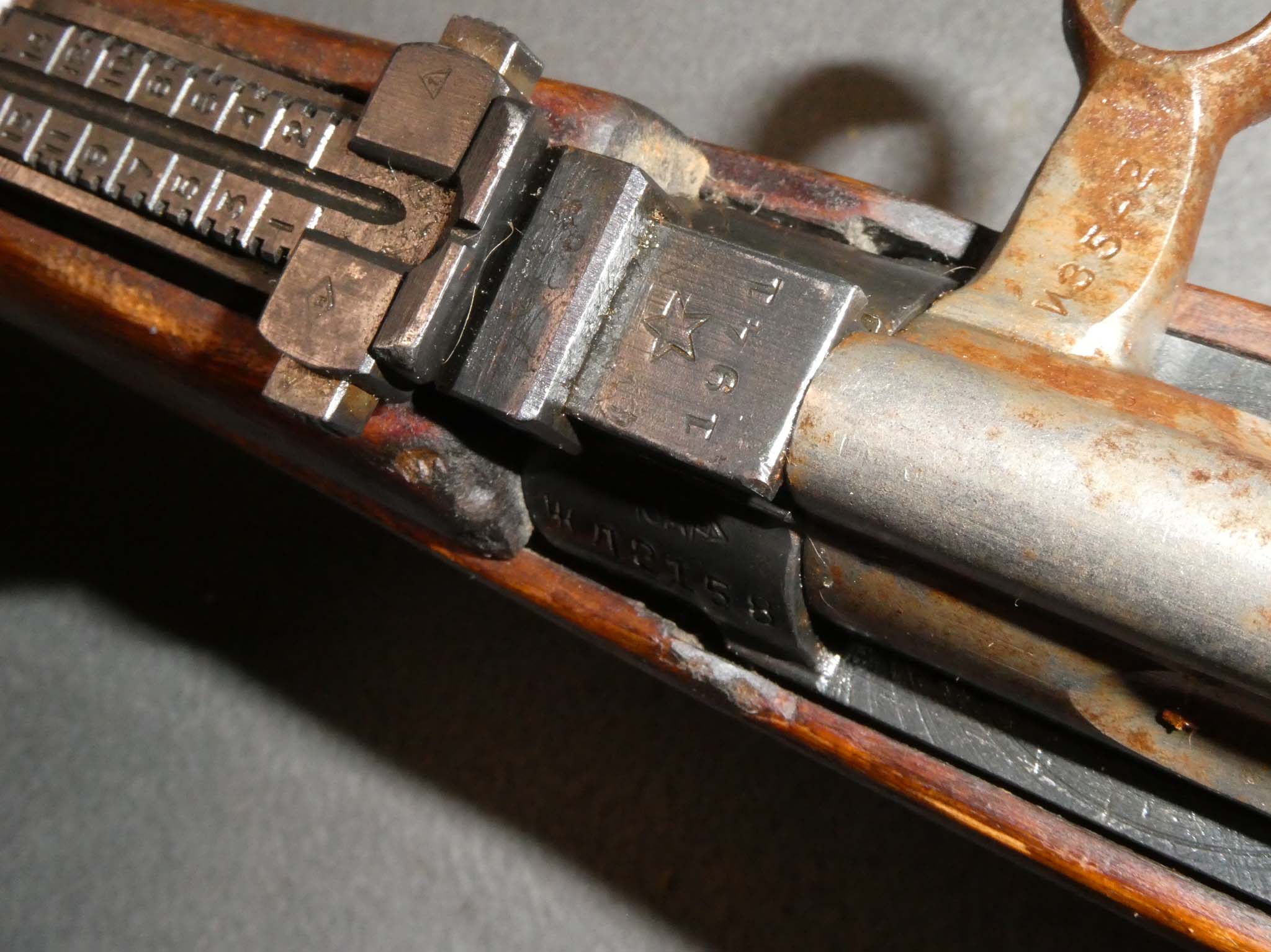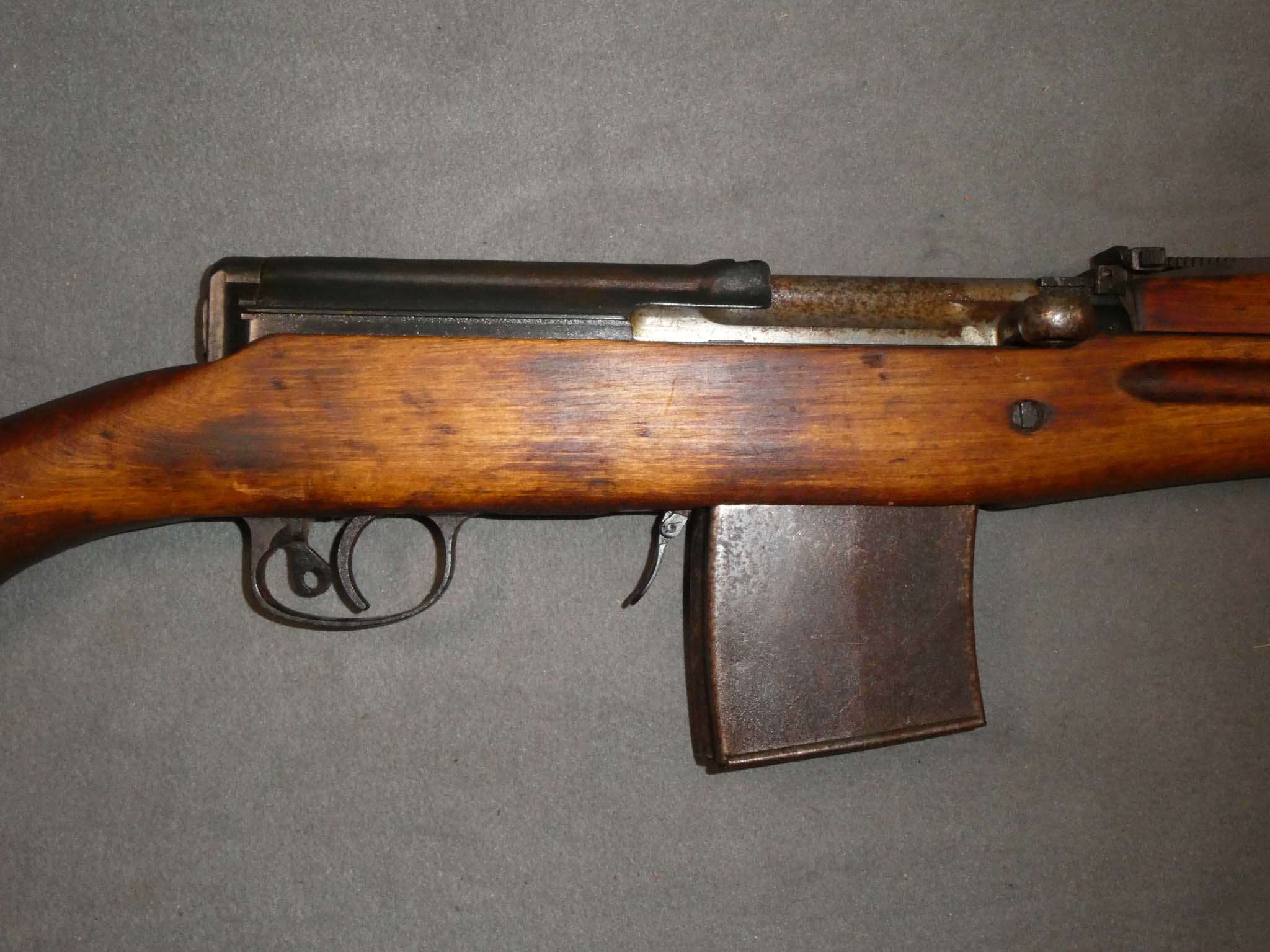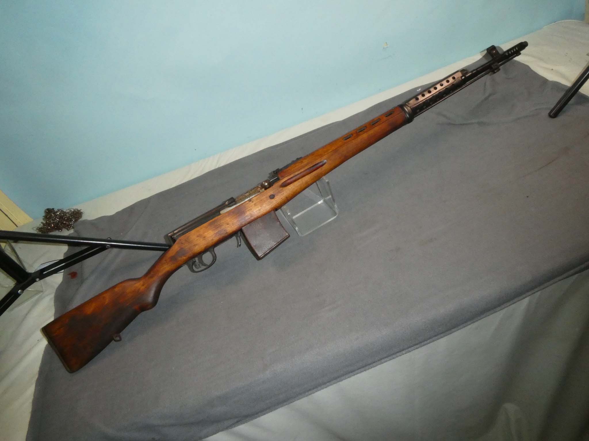 This is an original, Russian SVT-40 Semi-Automatic Rifle manufactured in 1941 and chambered for the 7.62x54R cartridge. Designed by Fedor Tokarev, the SVT-40 was an improved and simplified version of the earlier SVT-38. The SVT-40 was a gas-operated design with a short stroke piston feeding from a detachable 10 round box magazine. It was hoped the rifle would become the standard issue battle rifle of the Soviet Union, but it was a complex design, hard for troops with minimal training to maintain in the field, and prone to failure. Simpler, more robust designs, like the M1891/30 Mosin-Nagant Rifle and the PPSH-41 Submachine gun, moved to the forefront of production and fewer SVT-40's were produced each year. The rifles that were made were mostly issued to non-coms and specialized troops. Production ended in early 1945 with about 1.6 million produced. This rifle is in good condition with some significant visible surface rusting. Most of the rust is on the bolt, receiver, butt plate, and magazine. It has left brown patina on the bolt and receiver with some pitting on the bolt handle. The exposed part of the magazine has light pitting with a brown patina. The butt plate has a roughly textured dark brown patina. There is some rust speckling on the exposed metal handguard and barrel, but most of the blued finish remains here. The rifle works well mechanically with a mismatched bolt. The bore is actually in good condition. The grooves are a little dark, but the rifling is strong along the barrel's length. The stock is very good with some old dings and scratches from use. There is a crisp star stamped on the right side of the butt. The serial number on the left side does not match the receiver number. Stock no. 32374