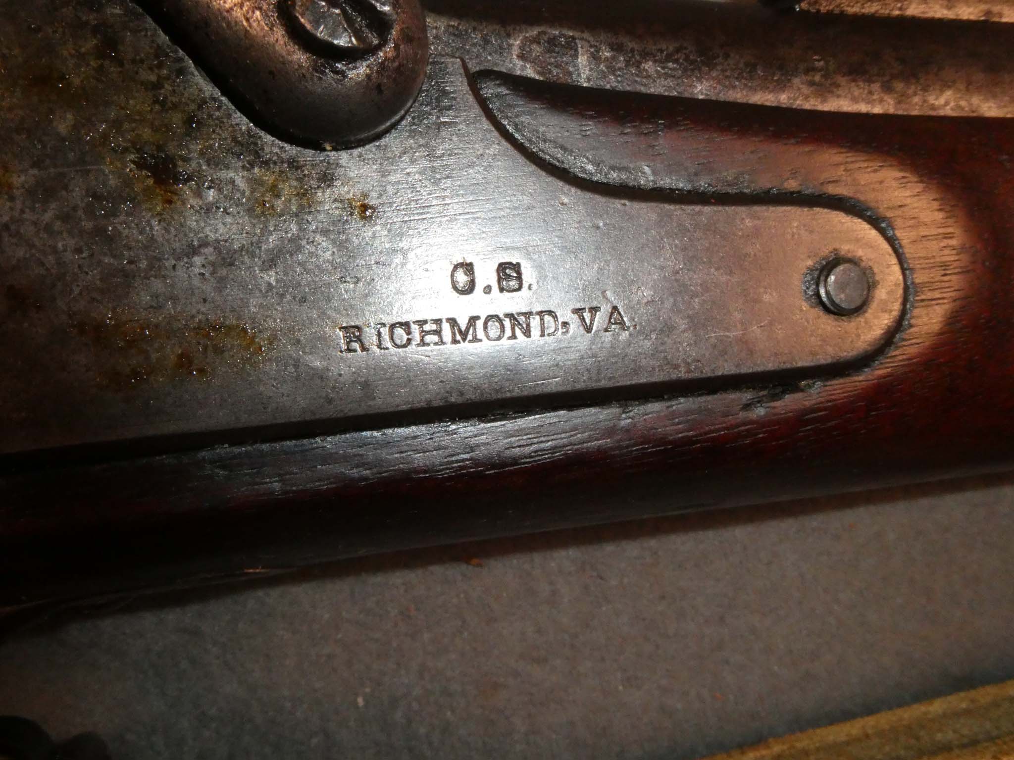 This is an original, Civil War, Confederate Carbine made at Richmond Armory in 1863. It is a percussion arm with a 25" barrel and a third sling swivel screwed into the bottom of the butt stock. These arms were made in Richmond, Virginia on machinery captured at Harpers Ferry in April of 1861. Intended for Cavalry, the carbine was the shortest of the C.S. Richmond arms. This one is in very good condition. It has an overall mottled steel gray and brown patina. There is some pitting around the bolster and a few small dings on the barrel. The brass butt plate and nose cap have a nice, dark, yellow bronze patina. The mechanics are excellent with the C.S. Richmond marked lock working very well. The bore is in fine condition with a few dark speckles, but strong rifling along the bore's length. It is interesting to contrast the Confederate rifling to that done at Springfield Armory! The stock is in very good condition with a scattering of small dings, scratches, and gouges from use. Included is a linen canvas sling. It appears to be an original, Confederate sling, but I can't be 100% certain. It has a combination of hand and machine stitching and is in very good condition with some soiling. The arms produced in Richmond saw hard service and are often beat to death. This is a nice example. Stock no. 32269