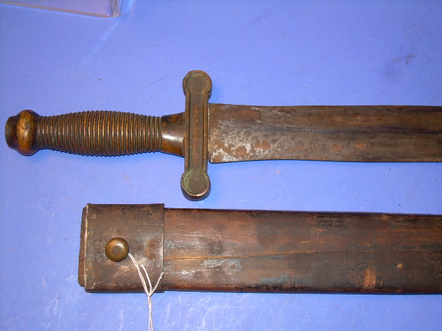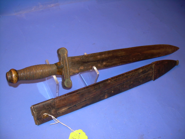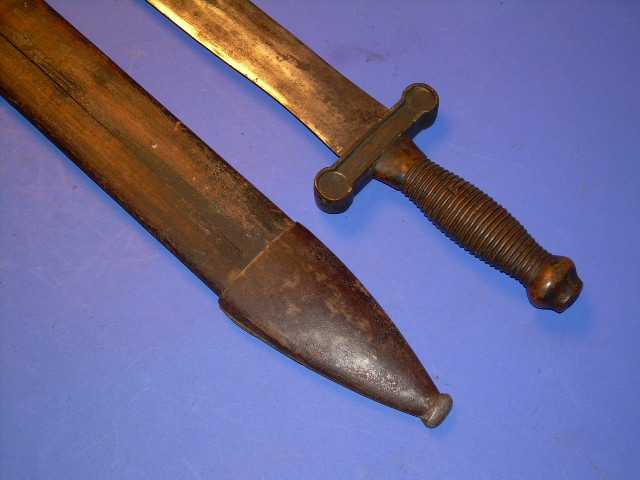 24 1/2 Inches overall with a double edged, non fullered 19 inch blade. Spear pointed blade is a mixture of bright steel and deep umber patina. Blade and hilt are unmarked but are indubitably products of E. J. Johnston & Co, Macon Georgia. Hilt is cast red brass with integral serrated grips. Beautiful red-Copper-black patina. Comes in it's original thing wooden scabbard with sheet tin throat and simple knobbed drag. Throat still has a brass frog belt button. 100% Original and Very Rare!