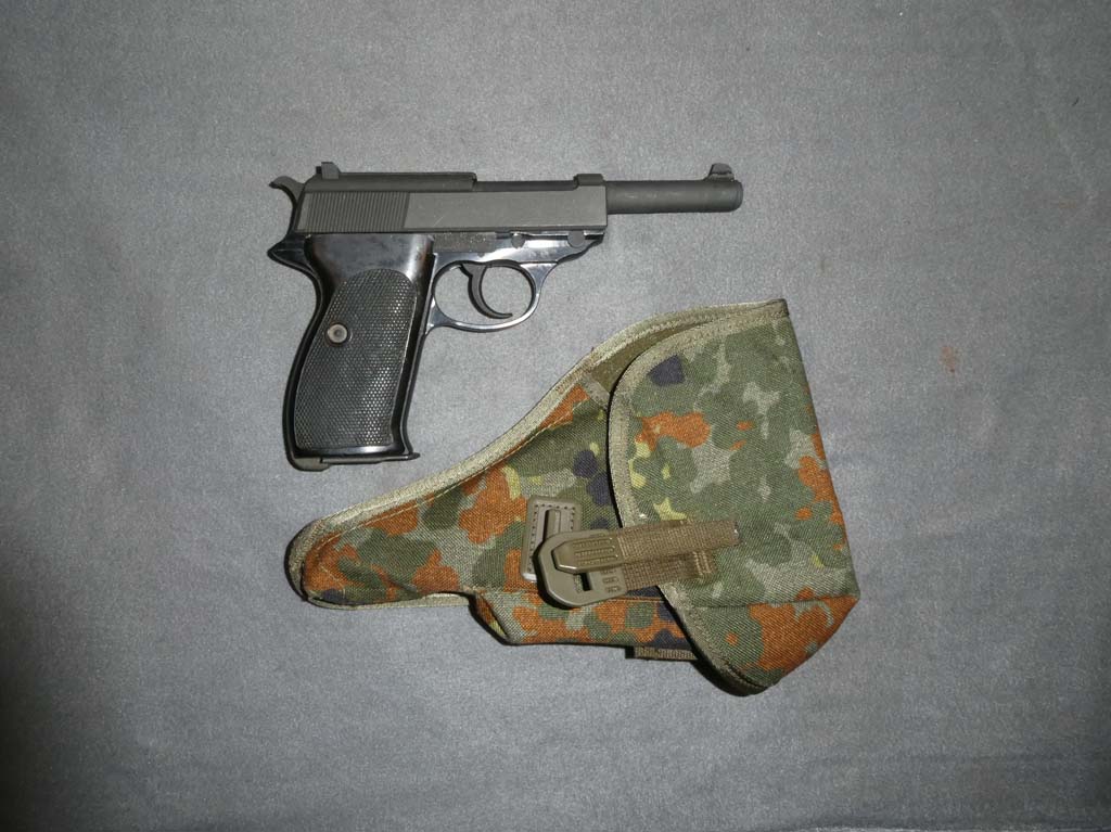 This is a Walther P1 double-action semi-automatic Pistol manufactured in 1977 and chambered for the 9mm Parabellum cartridge. The P1 was the post-war commercial version of the P.38. It saw wide-spread use with police agencies and with East German forces in the Cold War era. The P1 had a lightweight alloy frame and black checkered plastic grips. It was available with either a blue or phosphate finish. This pistol has a dark gray phosphate finish with a black frame. It is in very fine condition with about 98% of its finish remaining. There are just a a few tiny scuffs in the matte finish on the slide and barrel. The gun has excellent mechanics and a perfect, mirror bright bore. The grips are in fine condition with no chips or cracks. There is some light wear and scuffing from use. Included is an original East German Camouflage Nylon Holster in excellent condition. Stock no. 30410
