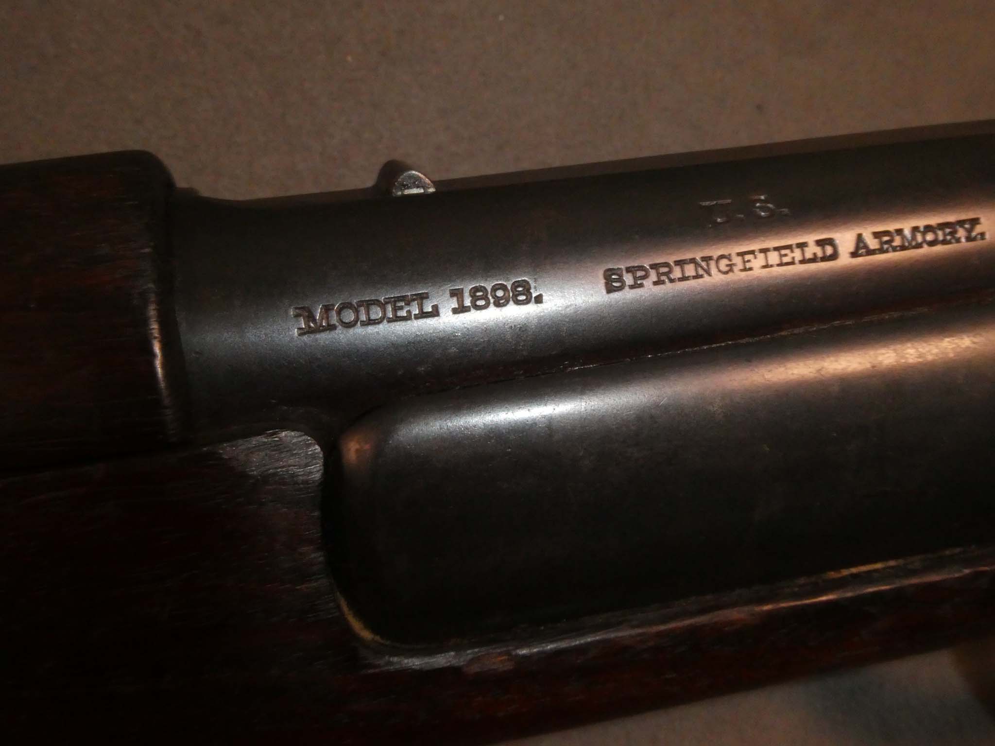 | Description : |  | This is an original, U.S. Springfield Model 1898 Krag-Jorgensen Rifle manufactured in 1899 and chambered for the .30-40 Government cartridge. Approximately 330,000 were made between 1898 and 1903. The M1898 Krag had the shortest service life of any U.S. arm, replaced by the M1903 Rifle just 5 years after production began. The Krag was the first U.S. Rifle to fire smokeless ammunition. This rifle is in very fine condition with more than 90% of its factory blued finish remaining. There is light wear on the exposed edges. There is heavier finish wear on the magazine cover, butt plate, and trigger guard. The fire blue on the extractor has turned mostly gray. The bolt handle, originally bright, has a smooth brown patina. The rifle has excellent mechanics and a very fine bore. The stock is fine. There is a hairline crack running from the trigger guard back along the grain of the wood on the left side of the wrist. It is about 6" long. The wrist remains solid with no movement. There is a name and the number "6" stamped on the right side of the butt. There is no visible inspector's cartouche. Stock no. 31774 |  HOME |