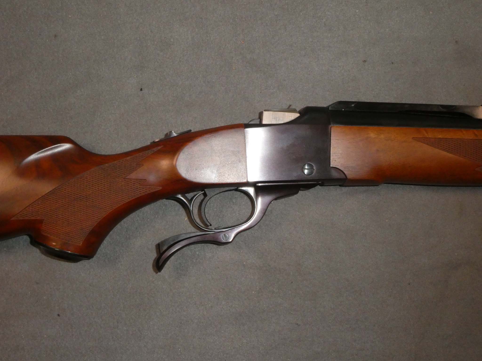 | Description : |  | This is a Ruger No.1-H Tropical Rifle manufactured in 2008 and chambered for the .450/400 Nitro Express Cartridge with a 3-inch case. It is a single shot, falling block rifle with a 24-inch heavy round barrel. These were made from from 2007 to 2012 with a few more produced in 2014. Production was ended in 2014. This rifle is in excellent condition with nearly 100% of its factory blued finish remaining. I honestly don't see any wear. The bore and mechanics are excellent. The stock is excellent as well. This rifle is very close to new condition. The .450/400 was one of the most popular cartridges for big game in Africa in the 19th century. This is a beautiful rifle in outstanding condition. Are you tired of rogue elephants trashing your melon patch? Stock no. 31817 |  HOME |