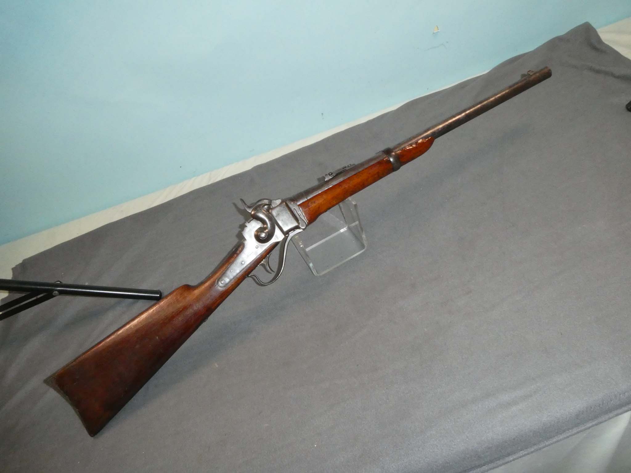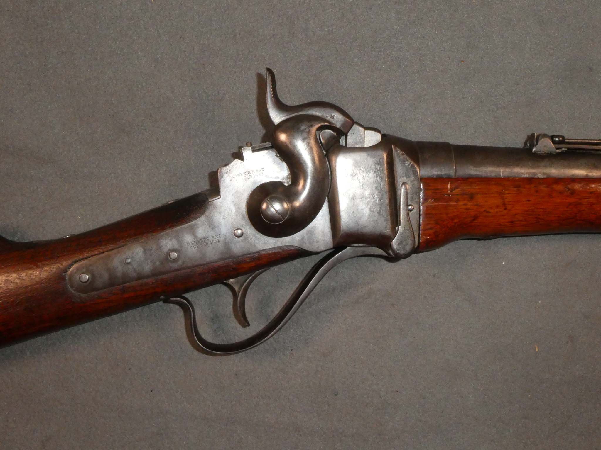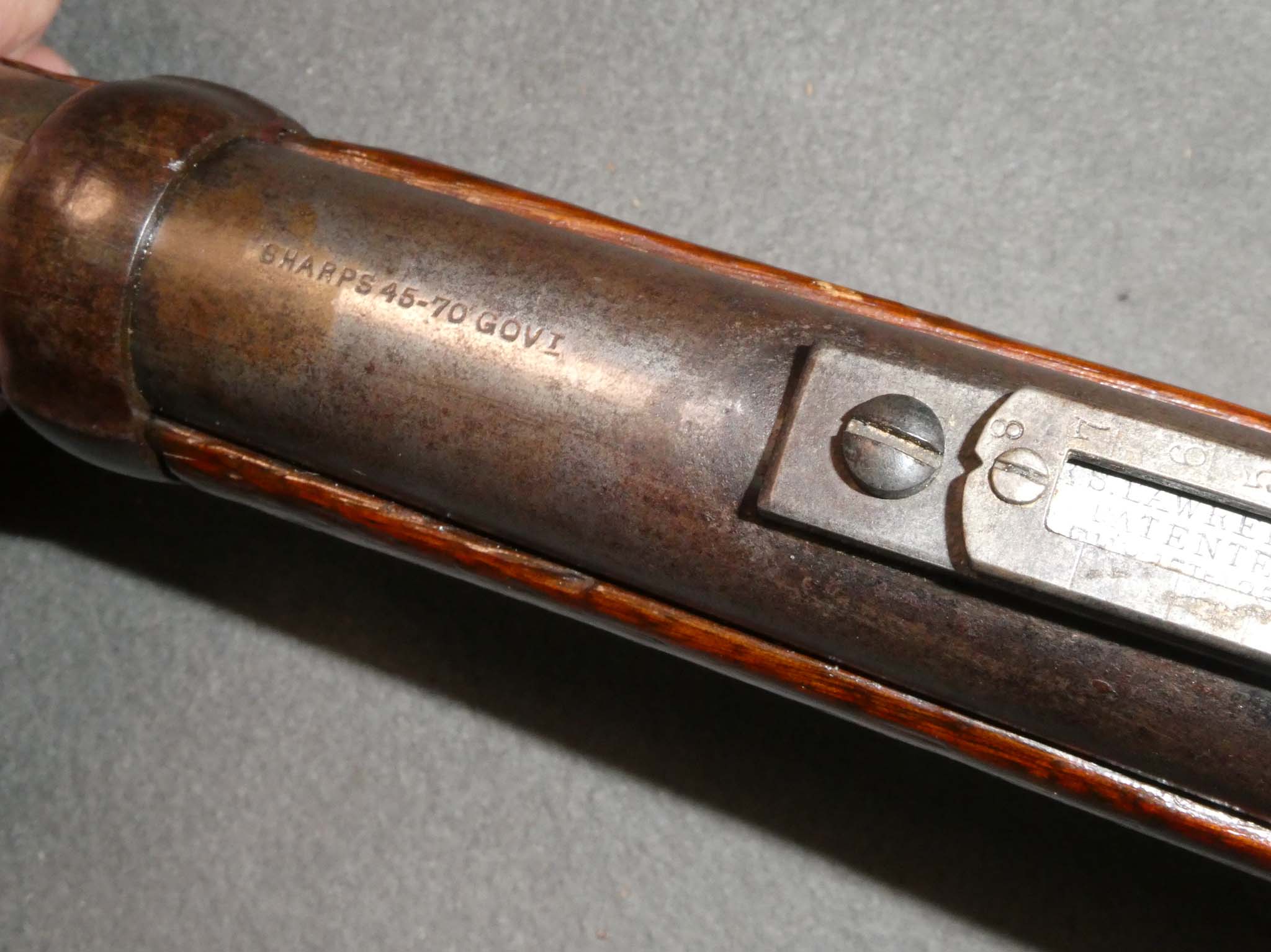This is a Sharps Model 1863 or 1865 Carbine chambered for the .45-70 Government cartridge. It is a bit of a mystery. Although, in 1867, the U.S. Government decided to convert many of their percussion Sharps to fire metallic cartridges, they were chambered for the .50-70 cartridge. This conversion is in .45-70. The barrel is stamped "SHARPS 45-70 GOVt." and appears to be a factory barrel. Whether the conversion was done by Sharps or by a frontier gunsmith, I do not know. This carbine is in antique fair to good condition. Little to no original finish remains with the entire gun having a mottled steel and brown patina. There are a few small pits in some areas. The sliding lever lock on the trigger bar is missing. The sling bar was removed many years ago, possibly when it was converted. The mechanics appear to work properly. The bore is good. There is some pitting in places, but the rifling is strongly visible along the bore's length. The stock is in good condition with the usual small dings and scratches from use. It has an old, varnished finish. This is a well-used veteran of the Old West. Stock no. 31475