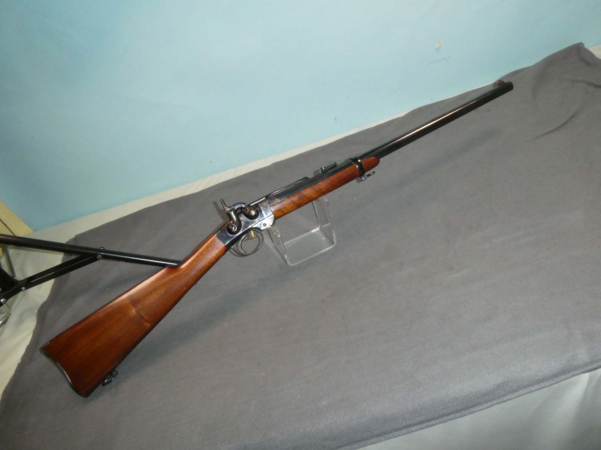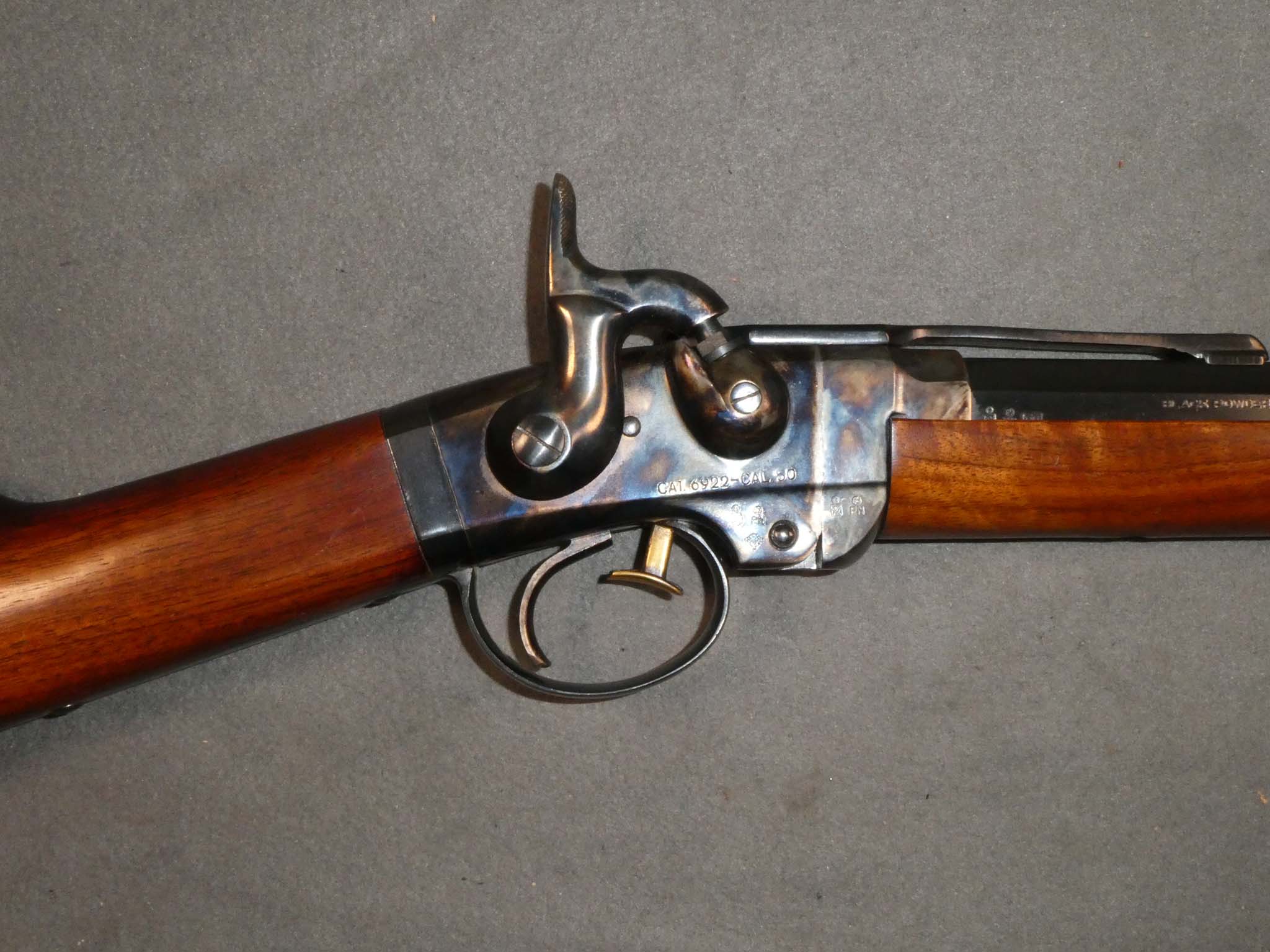 This is a replica of the Civil War Smith Cavalry Carbine manufactured by Pietta of Gussago, Italy in the year 2000. The original Smith Cavalry Carbine was manufactured by the Massachusetts Arms Company of Chicopee Falls, Massachusetts. Over 30,000 Smith Carbines were produced from 1861-1865 with the vast majority going to the U.S. Government. Cavalry units known to have been issued the Smith were the 3rd West Virginia, the 7th and 11th Illinois, the 1st Connecticut, the 7th and 17th Pennsylvania, the 6th and 9th Ohio, and the 1st Massachusetts. It was the 4th most issued carbine of the civil War. The Smith is a breech loading, percussion arm of .50 caliber. This one is in very fine to excellent condition with just about 100% of its factory blued and case-colored finishes remaining. The bore and mechanics are excellent. The stock is very fine to excellent with just a couple of very tiny dings from use or storage. This is a great replica of the Smith in near new condition. Stock no. 31846