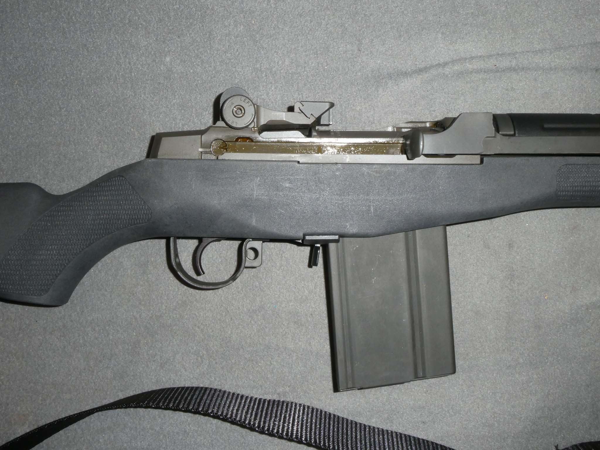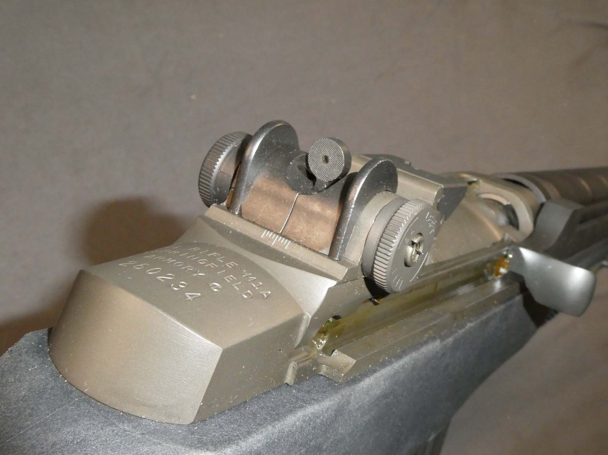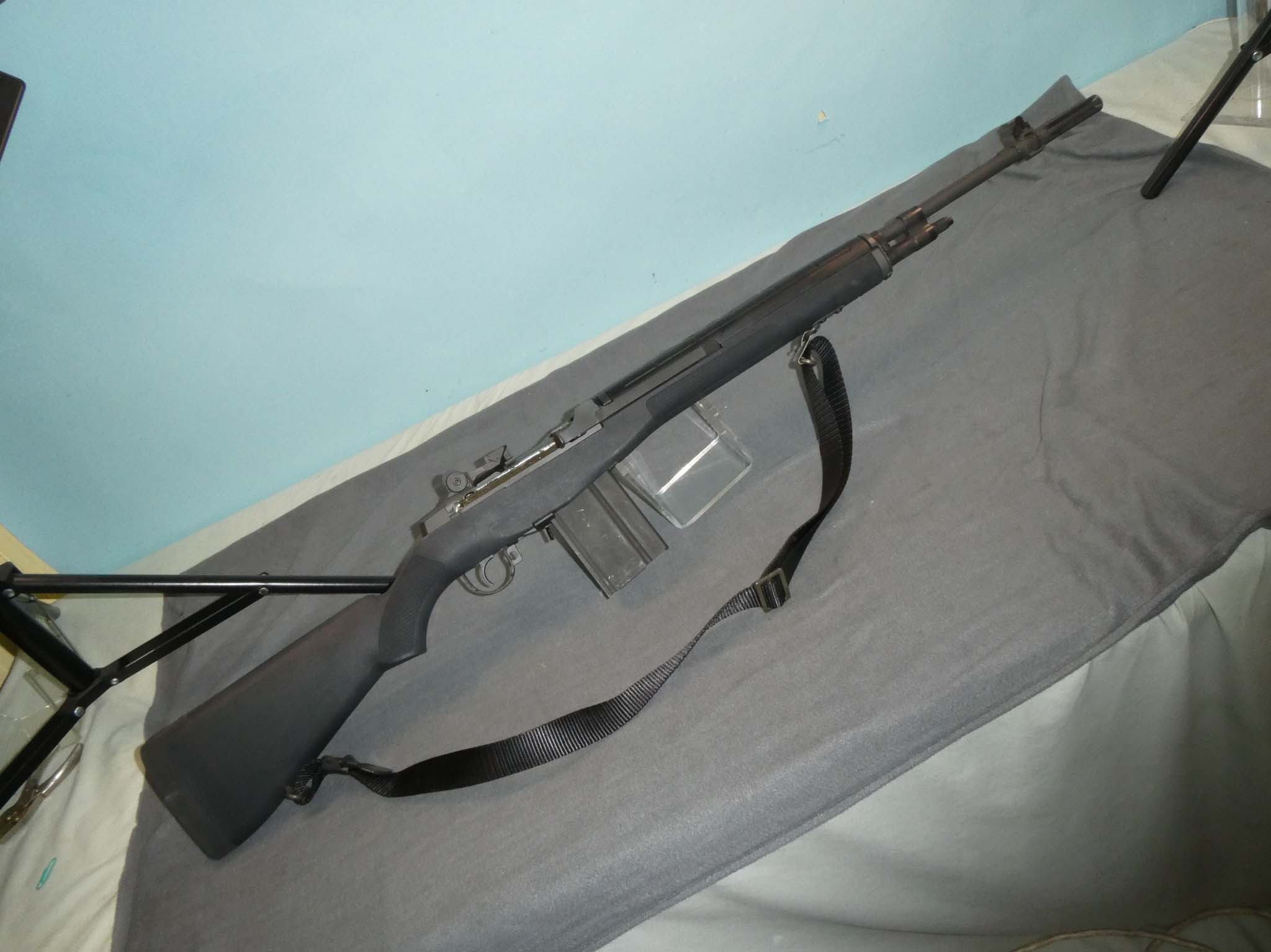 This is a Springfield Armory M1A Rifle manufactured by Springfield, Inc. of Geneseo, Illinois. It is chambered for the 7.62mm NATO cartridge. The M1A is a semi-automatic, civilian copy of the U.S. M14 Rifle. It has a 22-inch standard barrel. The gun feeds from a 20-round, detachable box magazine. The stock is black composite. This rifle is in very fine to excellent condition in its original factory box. It retains more than 98% of its black phosphate finish with just a hint of finish wear on the exposed edges of the gas cylinder. The bore and mechanics are excellent. The stock has just a tiny scuff or two from use or storage. The gun appears to have been fired very little. Included is a black nylon M1 sling in excellent condition. The rifle comes with 3 magazines. Two are 20-round. They are after-market. The other is the factory short magazine. The paperwork and gun lock are in the box. The box has some damage to one corner but is excellent otherwise. If you want a military style rifle in hard-hitting 7.62mm, this is a good choice. Stock no. 31909