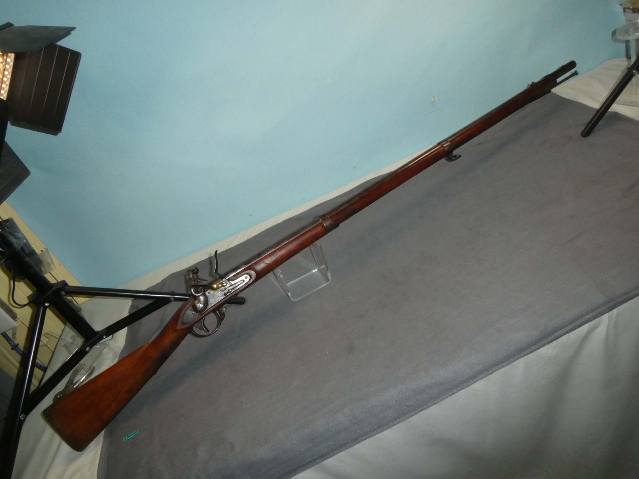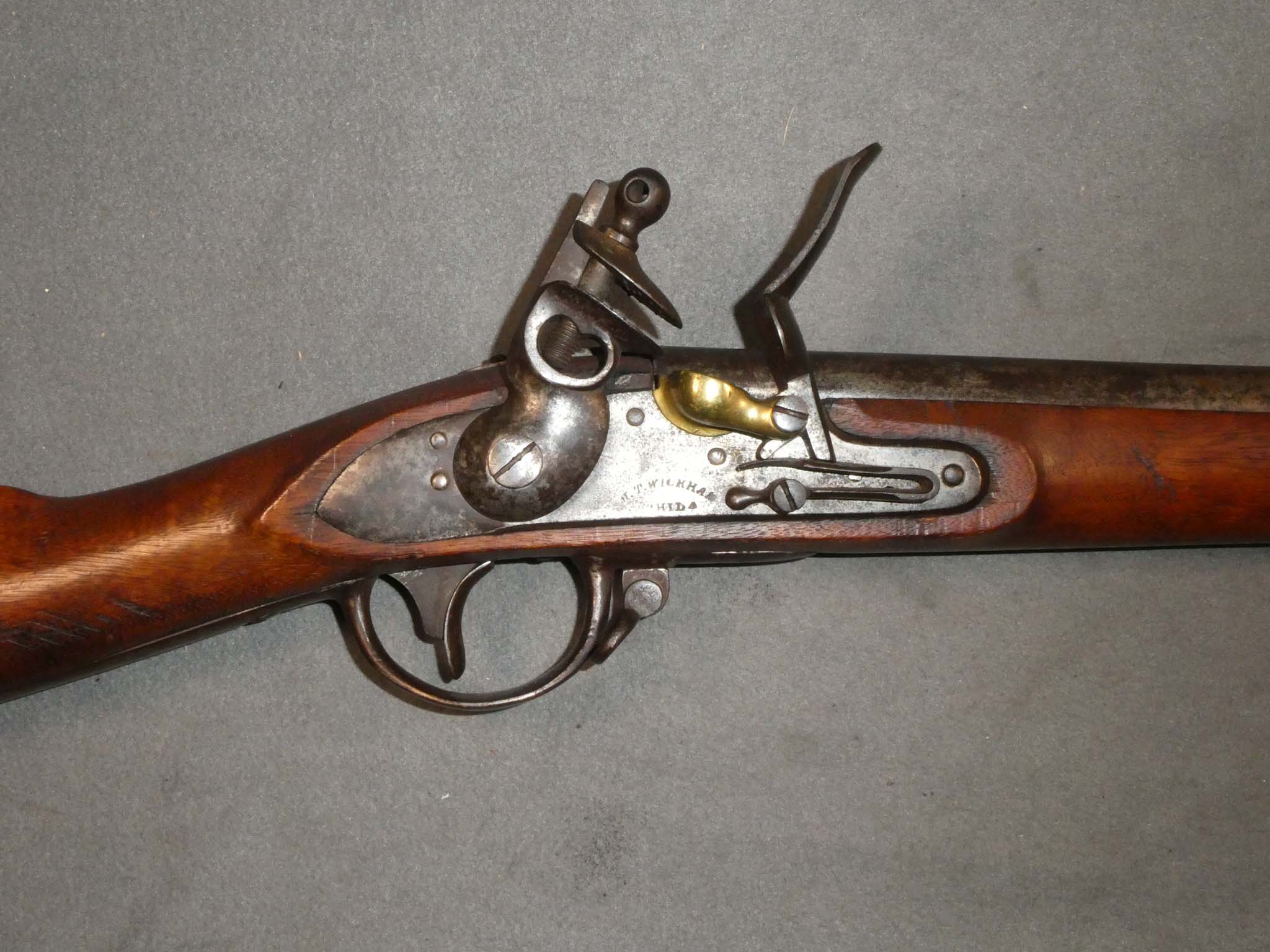 This is an original, U.S. Model 1816 Flintlock Musket made by M.T. Wickham of Philadelphia, Pennsylvania. It is .69 caliber. Wickham made about 16,600 of these between 1822 and 1837. This musket is in very good condition with an overall mottled patina of steel gray and dark brown. The butt plate was heavily rusted and has a rough dark brown patina with some pitting. The mechanics are excellent. The bore is dark brown and dusty but appears mostly smooth. The stock is in very good condition. There are two large chips around the barrel tang. There is some black iron staining at the end of the butt where the wood meets the butt plate. The barrel has a New Jersey surcharge stamped near the breech. The majority of these were converted to percussion for use in the Civil War. This is a nice untouched example of the Model 1816 Flintlock. Stock no. 29272