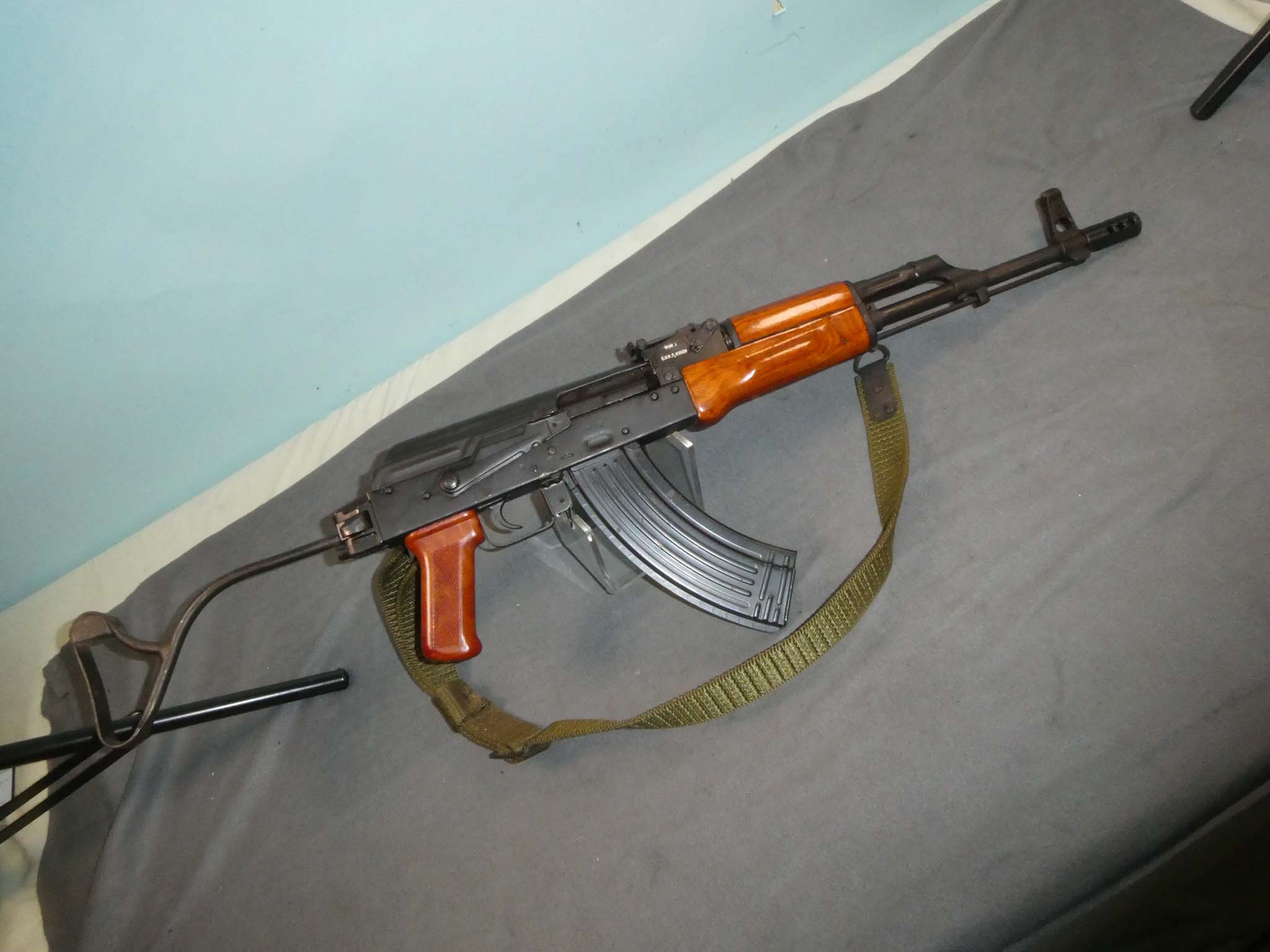 This is a Romanian Ratmil WUM-1 rifle chambered for the 7.62x39mm cartridge. Imported by Intrac, it is a semi-automatic AK-47 style rifle made in 1997. This rifle is fitted with a wire butt stock and composite pistol grip. The rifle is in fine condition. It retains more than 95% of its black factory finish. The rifle was improperly stored without oil and there are a few small rust spots in places. The rust is heaviest on the front sling attachment point and on the wire butt stock. I have cleaned it up some, but some rust remains in crevices. A detail cleaning is in order. There was a lot of rust on the magazine. I cleaned it up, but there are a few small rough areas remaining. The bore and mechanics are excellent. The forend and grip are excellent. Included is a nylon sling. There is some rust on the metal parts of the sling. This is a good-looking example of the AK. It should clean up well. Stock no. 31958